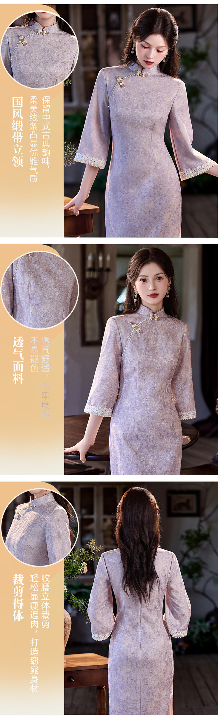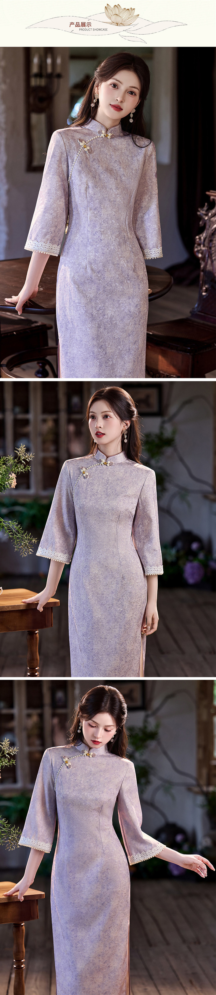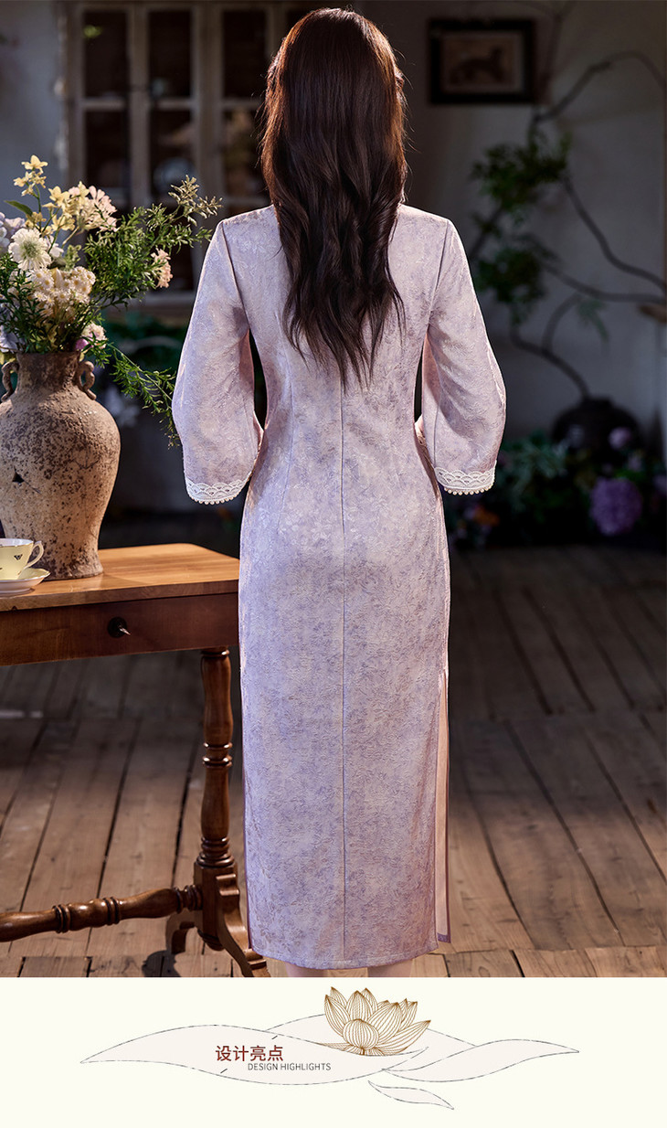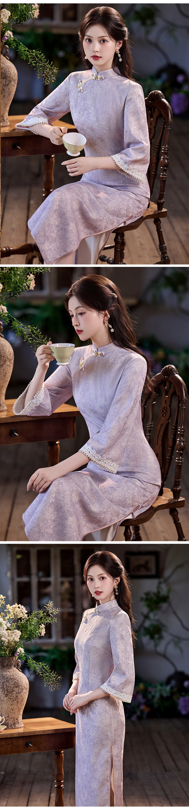 复合提花缎长款倒大袖旗袍,新中式高级感紫色旗袍SJT-862