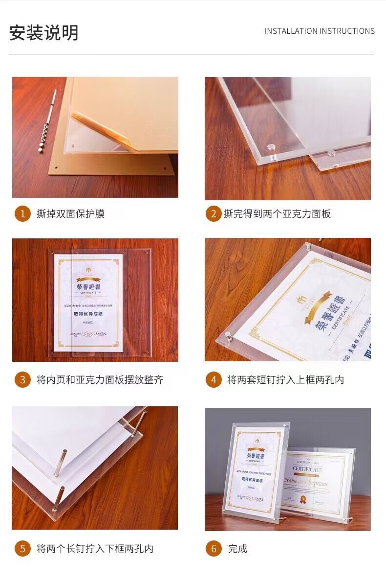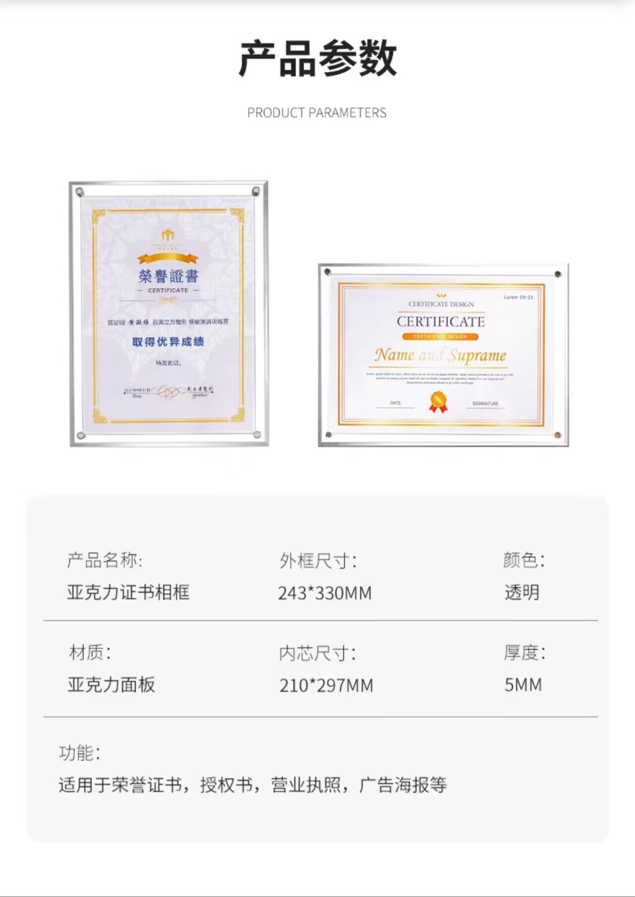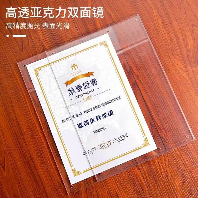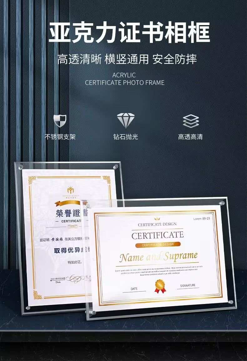 亚克力展示框A4纸框架相框摆台证书框裱水晶透明专利奖状证件框