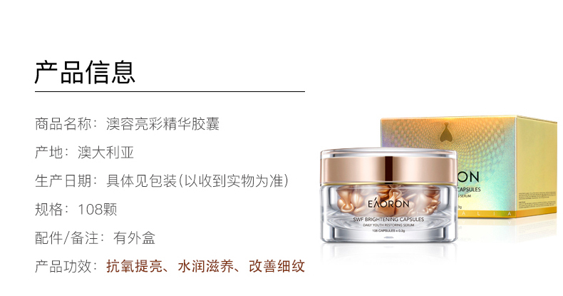 澳洲 Eaoron/澳容 亮彩精华胶囊 108粒/盒 高浓度独立包装便携出行(效期:28年3月)