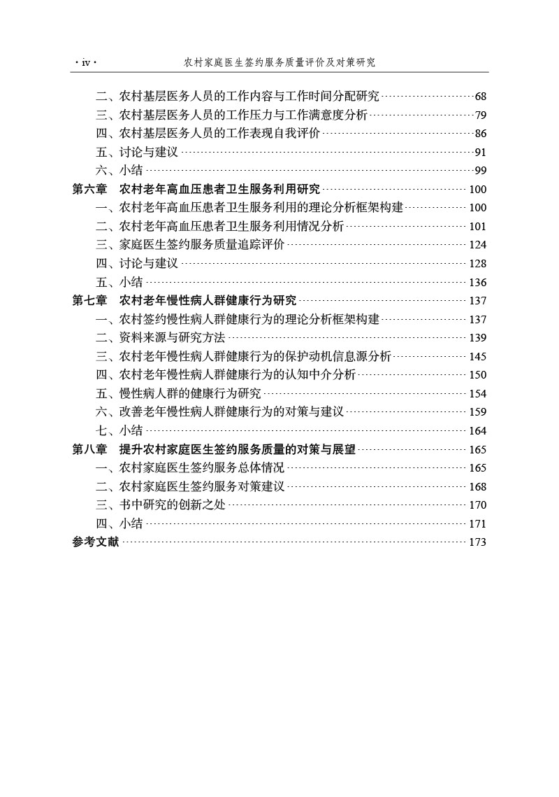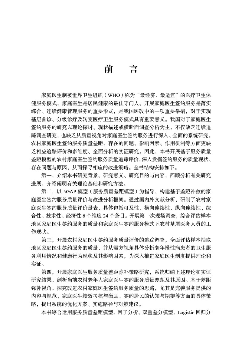 本书系统梳理了家庭医生签约服务质量改进的理论内涵与分析框架,并以农村老年人、农村基层医务人员为研究对象,深入剖析了农村家庭医生签约服务的质量差距、问题根源及影响因素。在此基础上,构建了农村家庭医生签约服务质量差距模型,并开发了相应的服务质量评价量表。通过追踪评价与比较分析,提出了基于循证的农村老年人家庭医生签约服务质量改进思路、具体内容及实施策略,为促进农村家庭医生签约服务的健康、可持续发展及分级诊疗的落实提供了理论依据和决策参考。