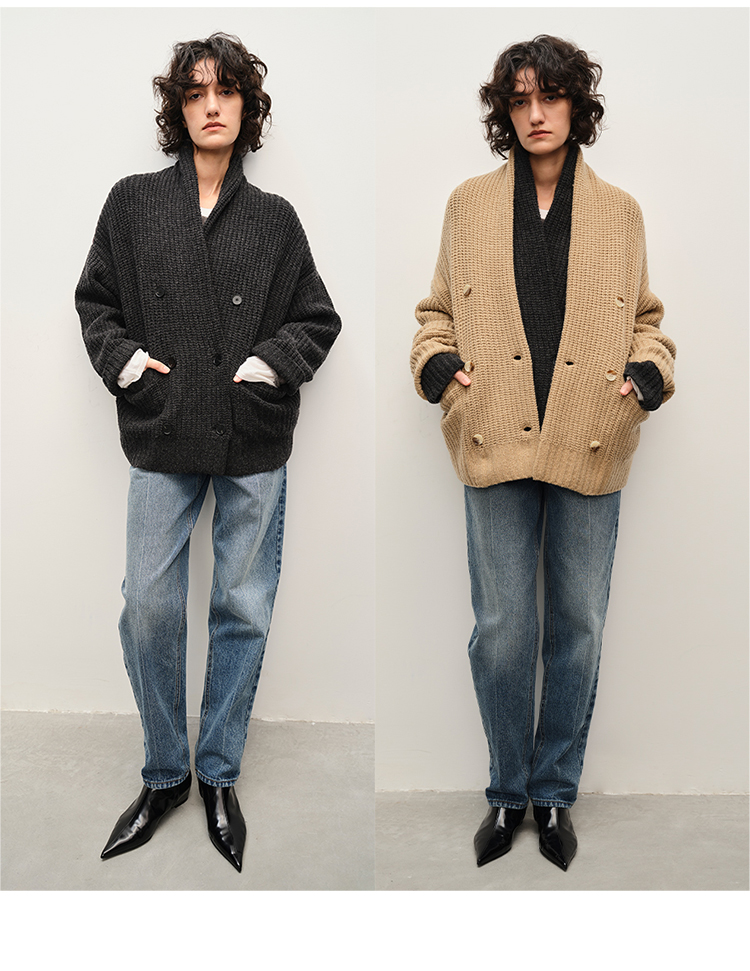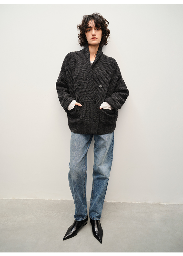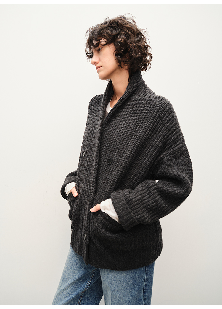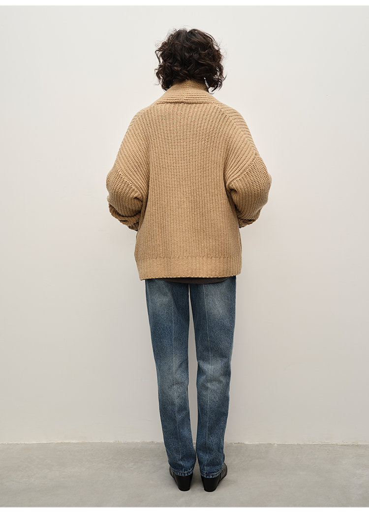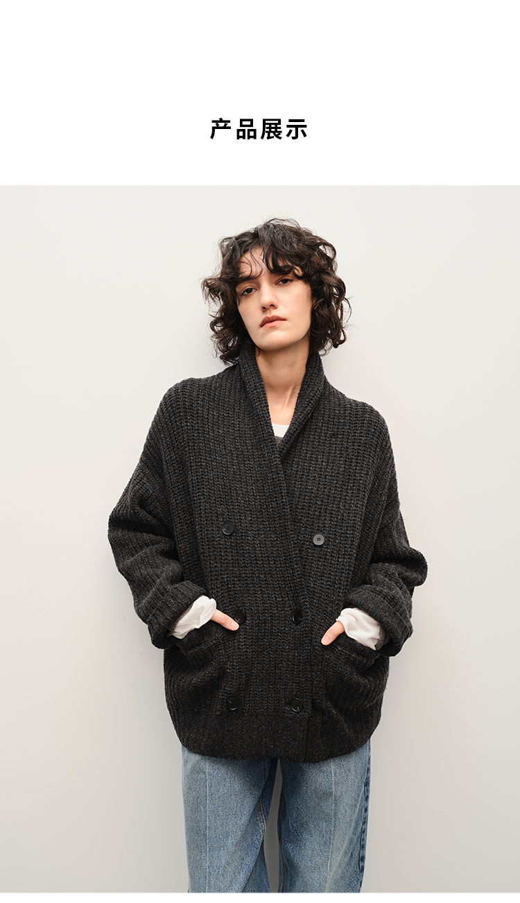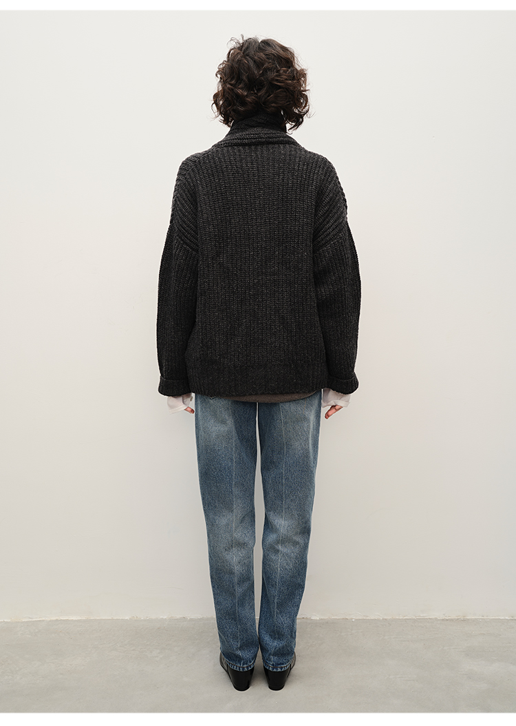 HIDEMI 澳洲美利奴羊毛粗针加厚款青果领西服式毛衣外套大衣