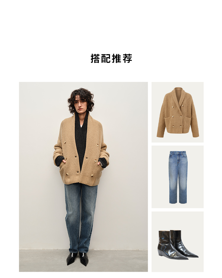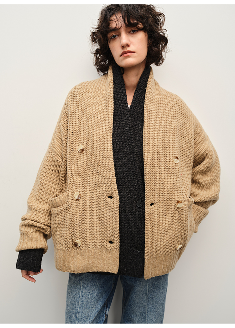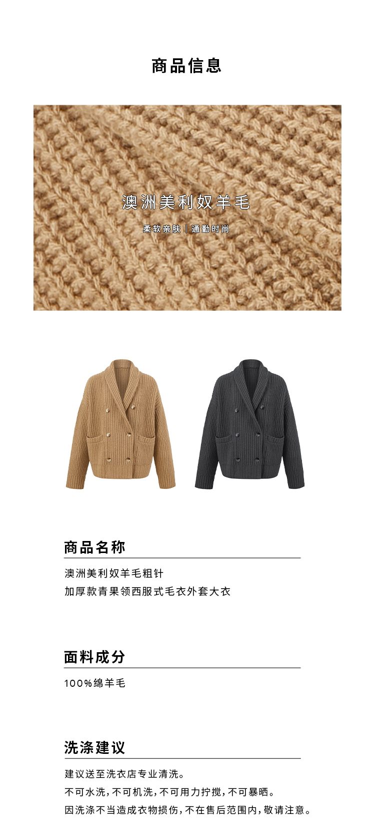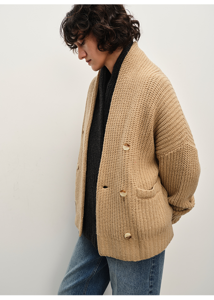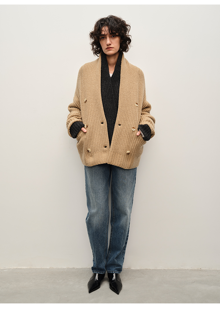 HIDEMI 澳洲美利奴羊毛粗针加厚款青果领西服式毛衣外套大衣