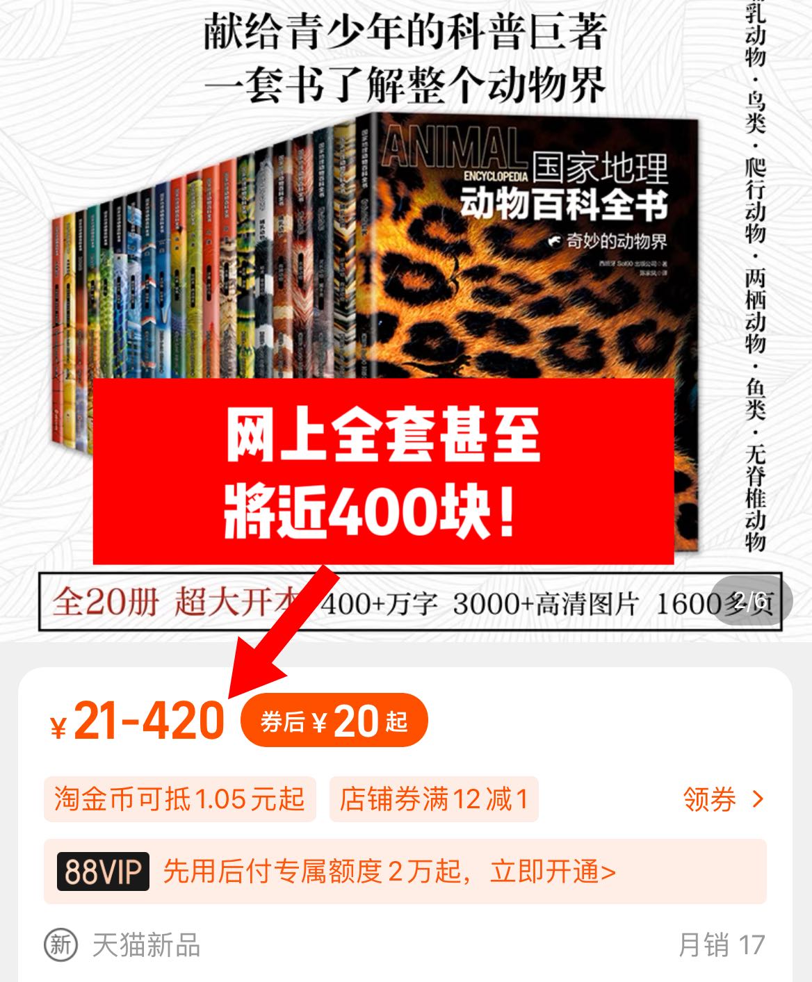 网上相似的动物百科书,一册起码要20左右。国家地理动物百科全套正版甚至要卖到400,但书的品质确实值得!