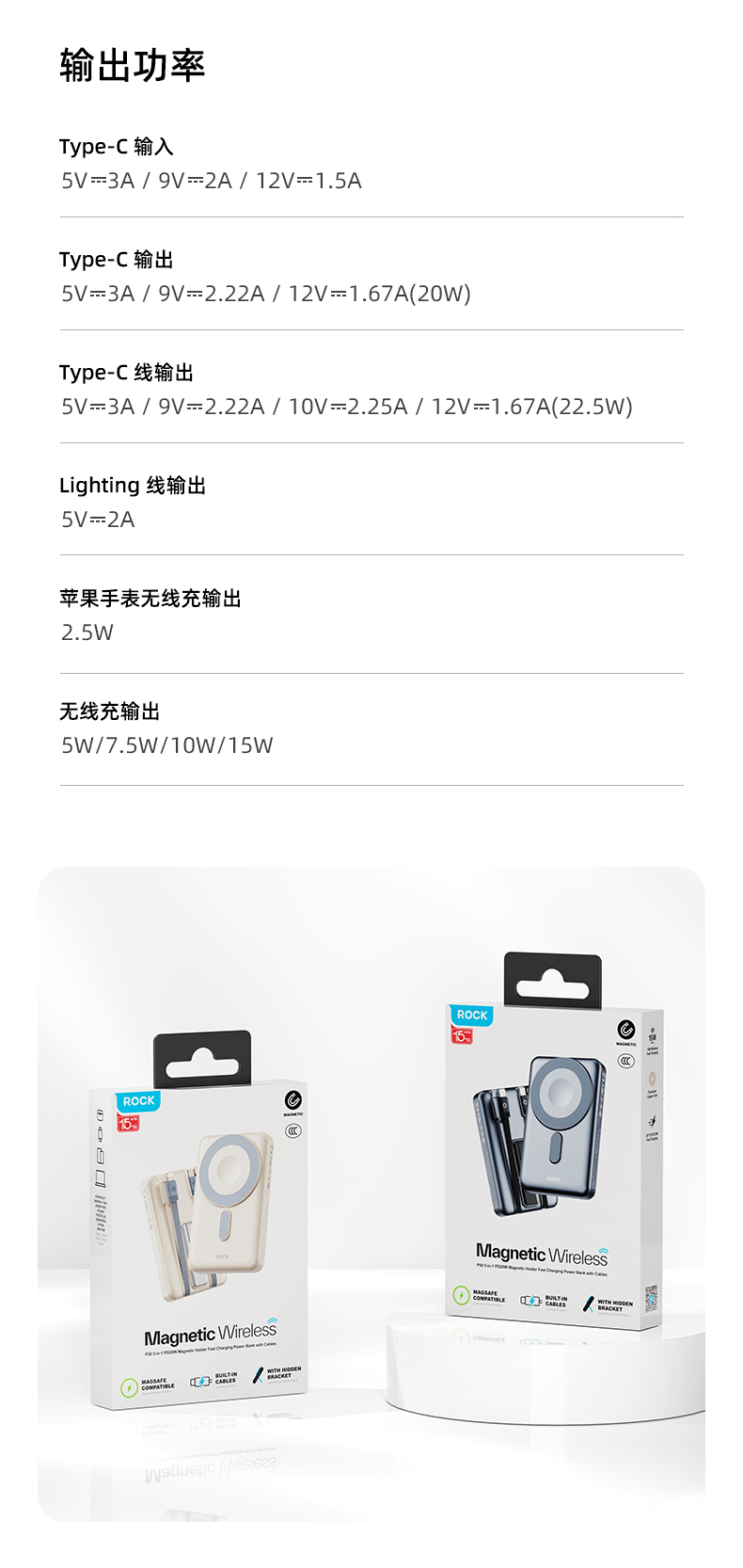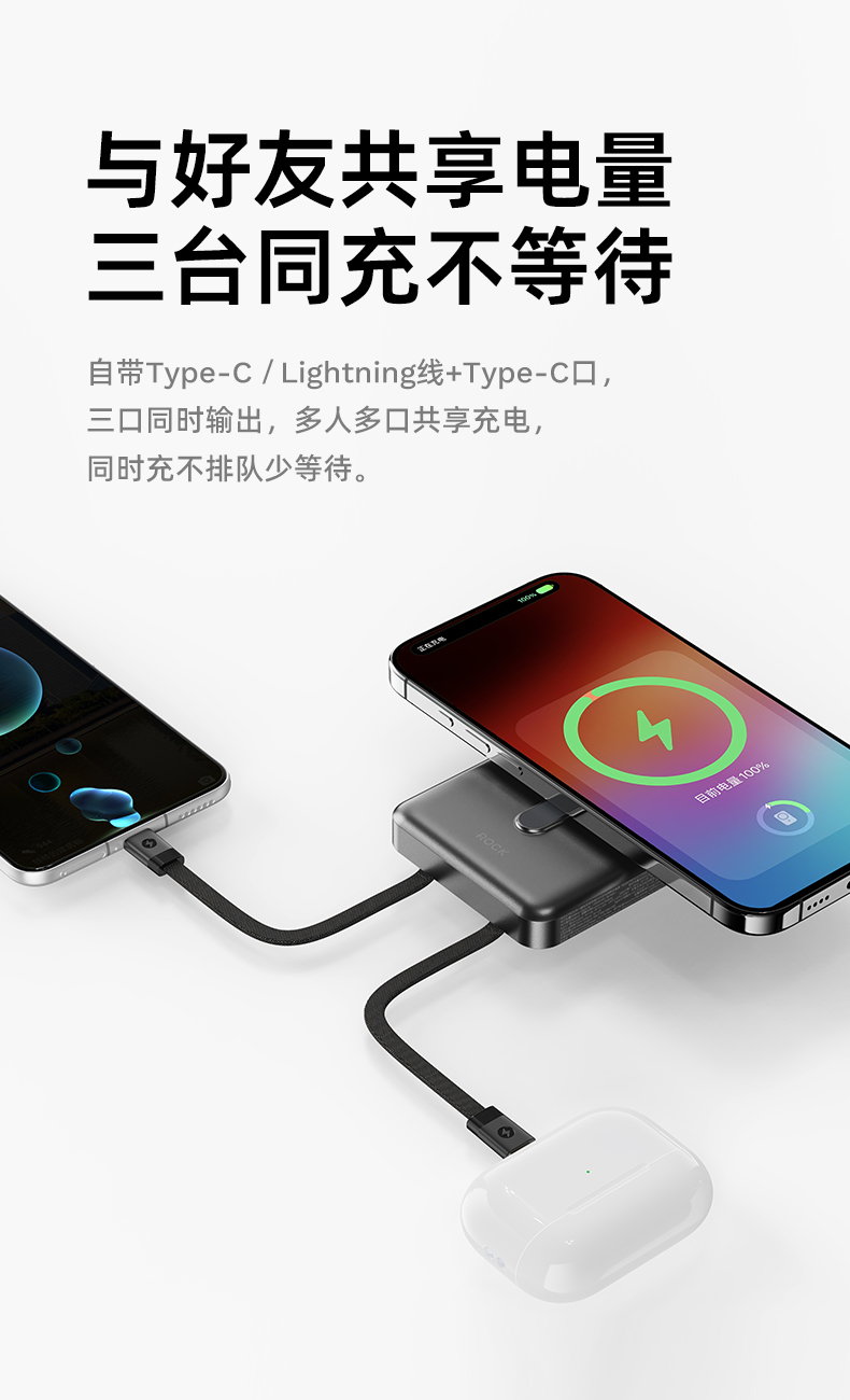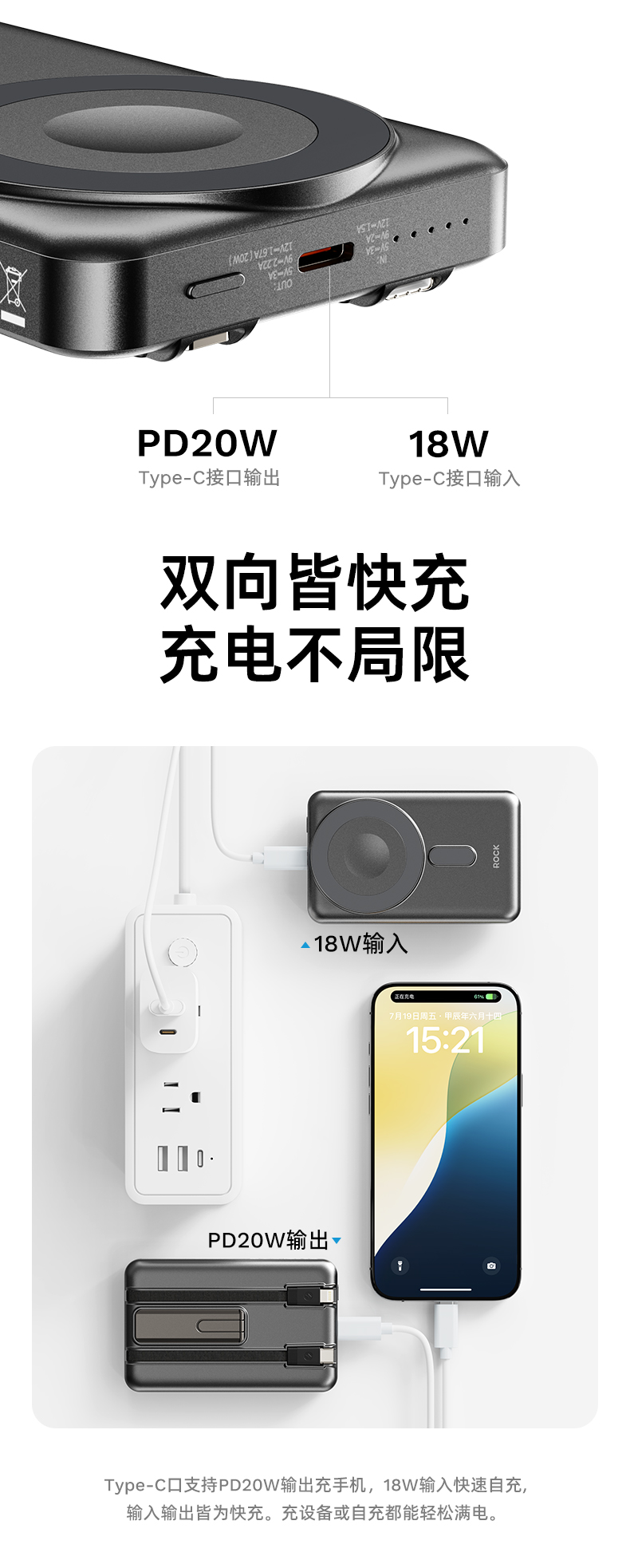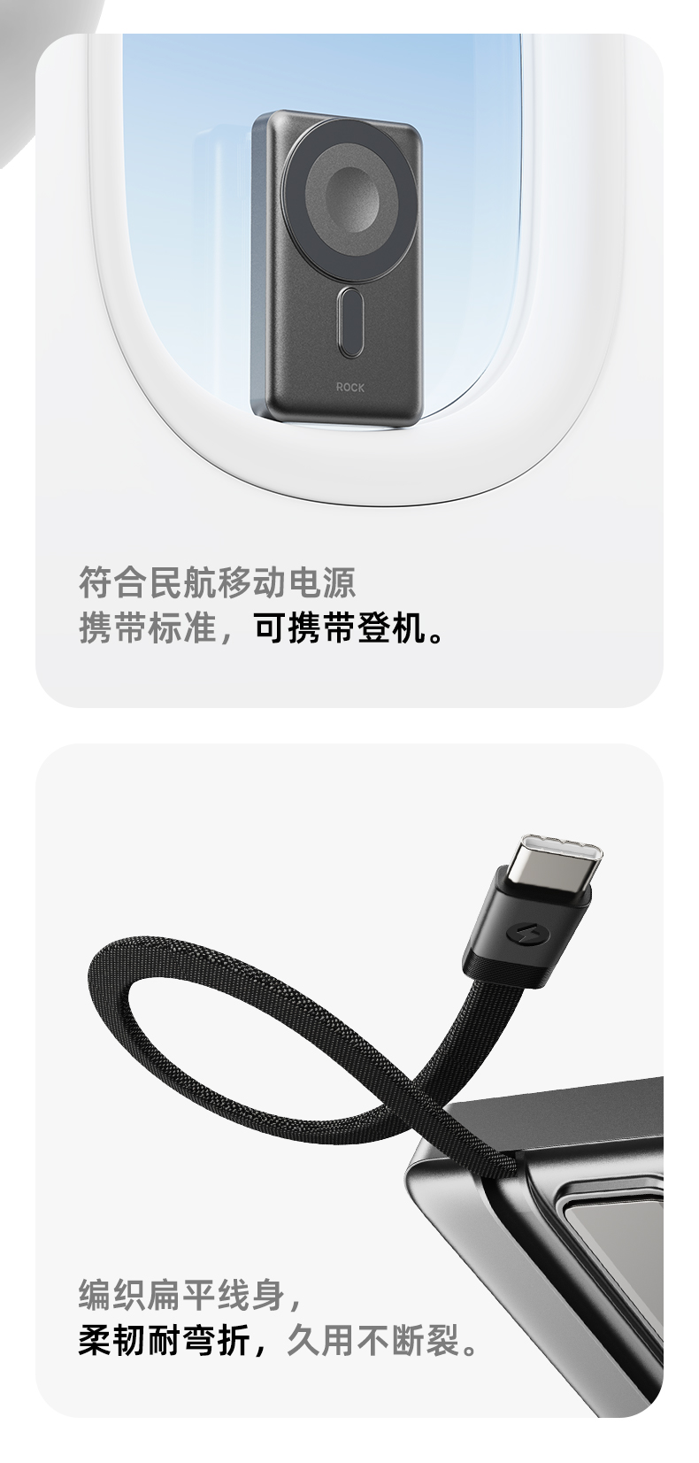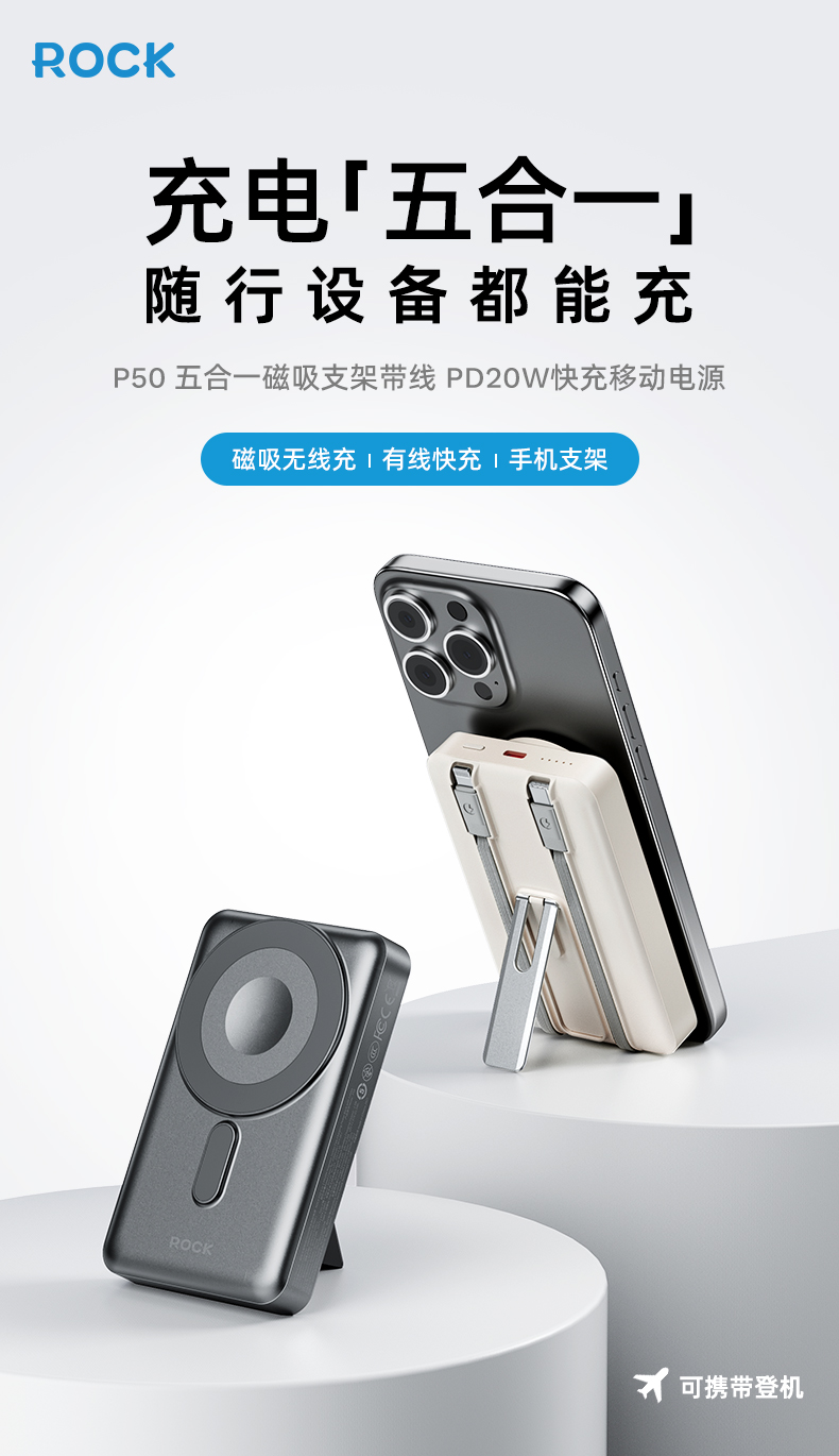 ROCK P50五合一磁吸支架带线PD20W快充移动电源