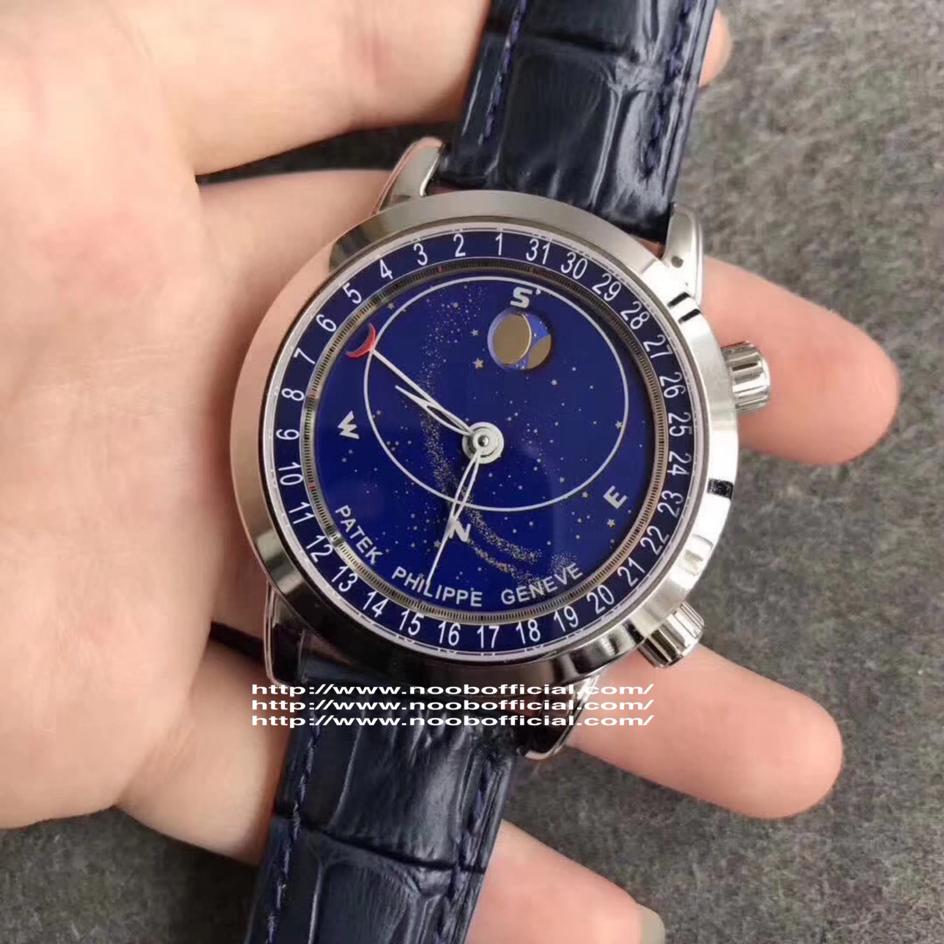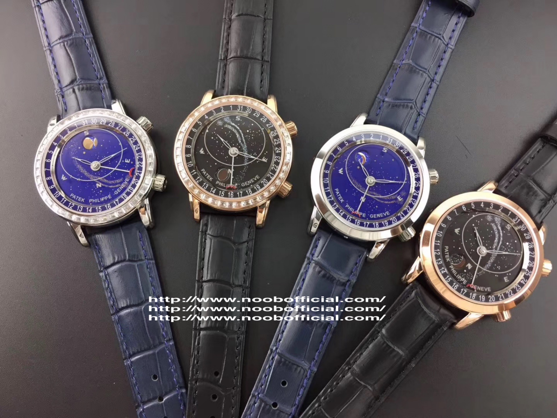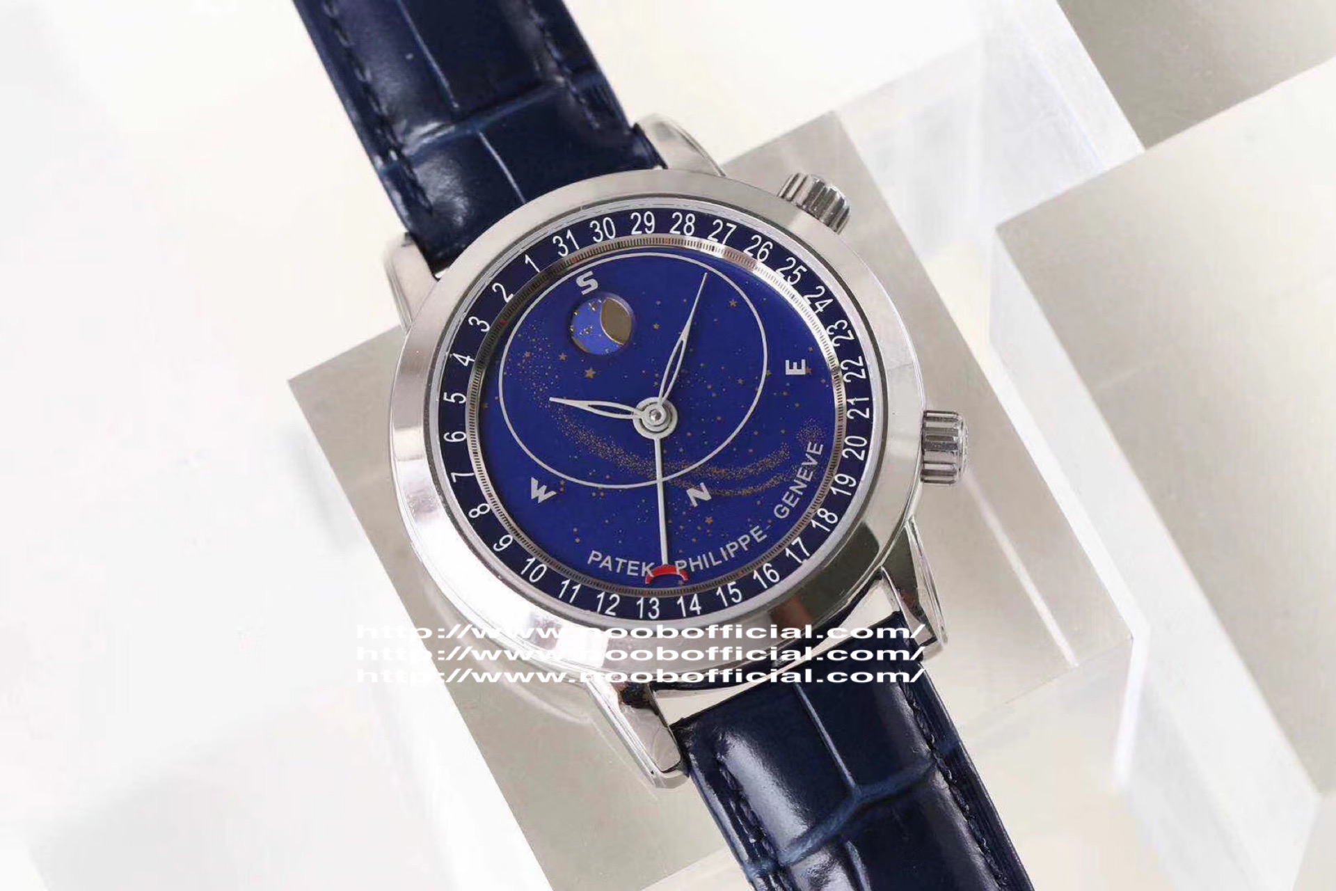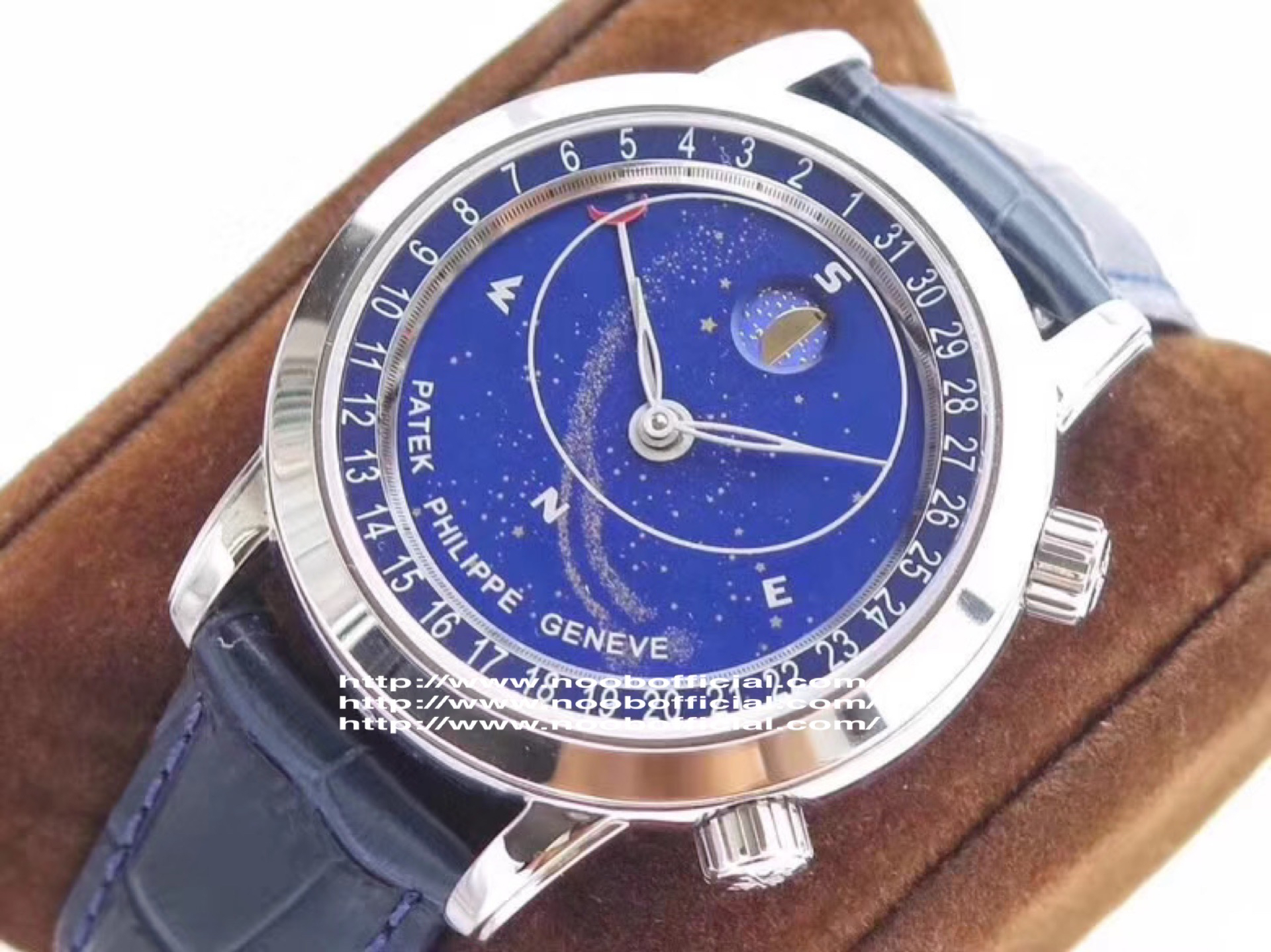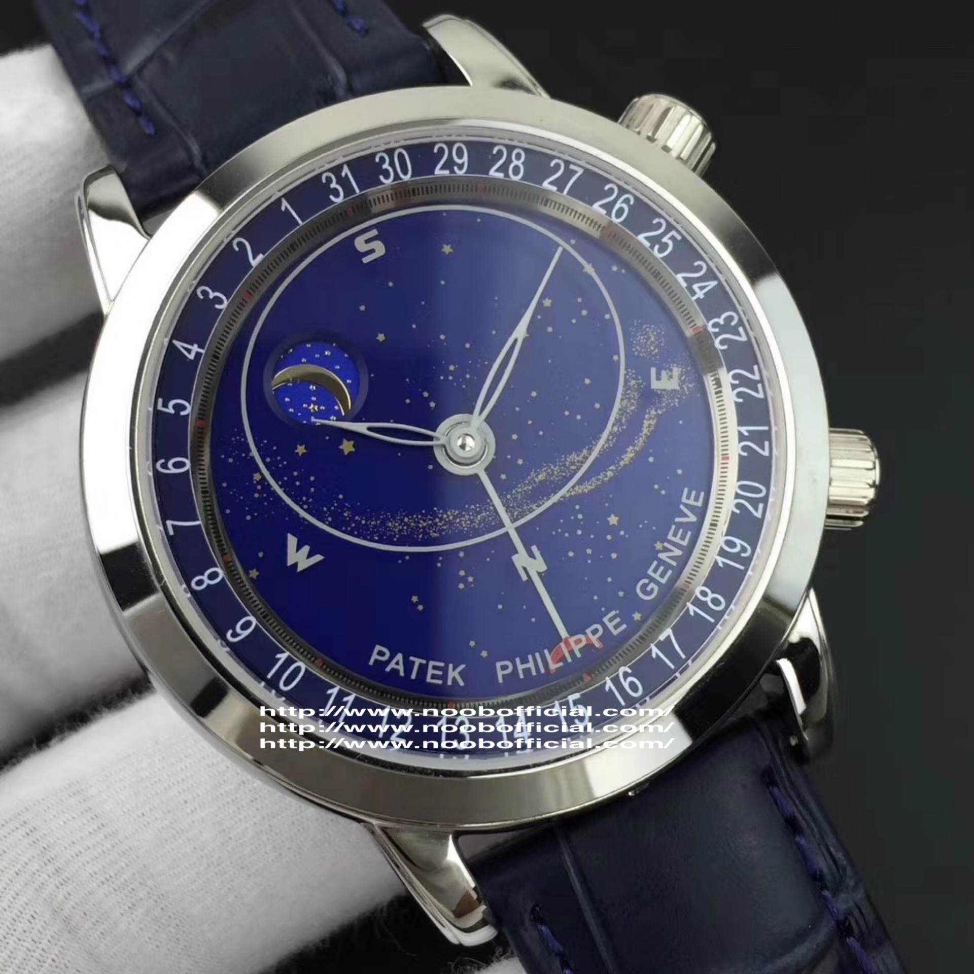 百达翡丽星空升级终极版6102款|6104款超级复杂功能系列。日内瓦苍穹系列你可想象把星空佩戴在腕上吗?这款星空腕表独具特别星象功能,蓝色圆表盘上就能欣赏日内瓦苍穹图,还有金色月球运行轨迹,熬时20个月 采用日本9015改造而成的珍珠陀,和正品一样机心 表盘上的月亮会根据天空的月亮月满圆月蚀弯的情况自动变化 表壳前后玻璃采用先进技术处理让玻璃折射光提高,让表盘看起来更加通透 似乎没有玻璃的感觉 后盖和玻璃也采用和正品一样凹型 打破传统手表后盖和玻璃平行,白光表壳在6字位表壳和表带连接处的宝石采用南非真钻 支持宝石检验,2字把头调时间,日历,月亮盘 5字位把头调星空盘转动。此表在手别无所求。