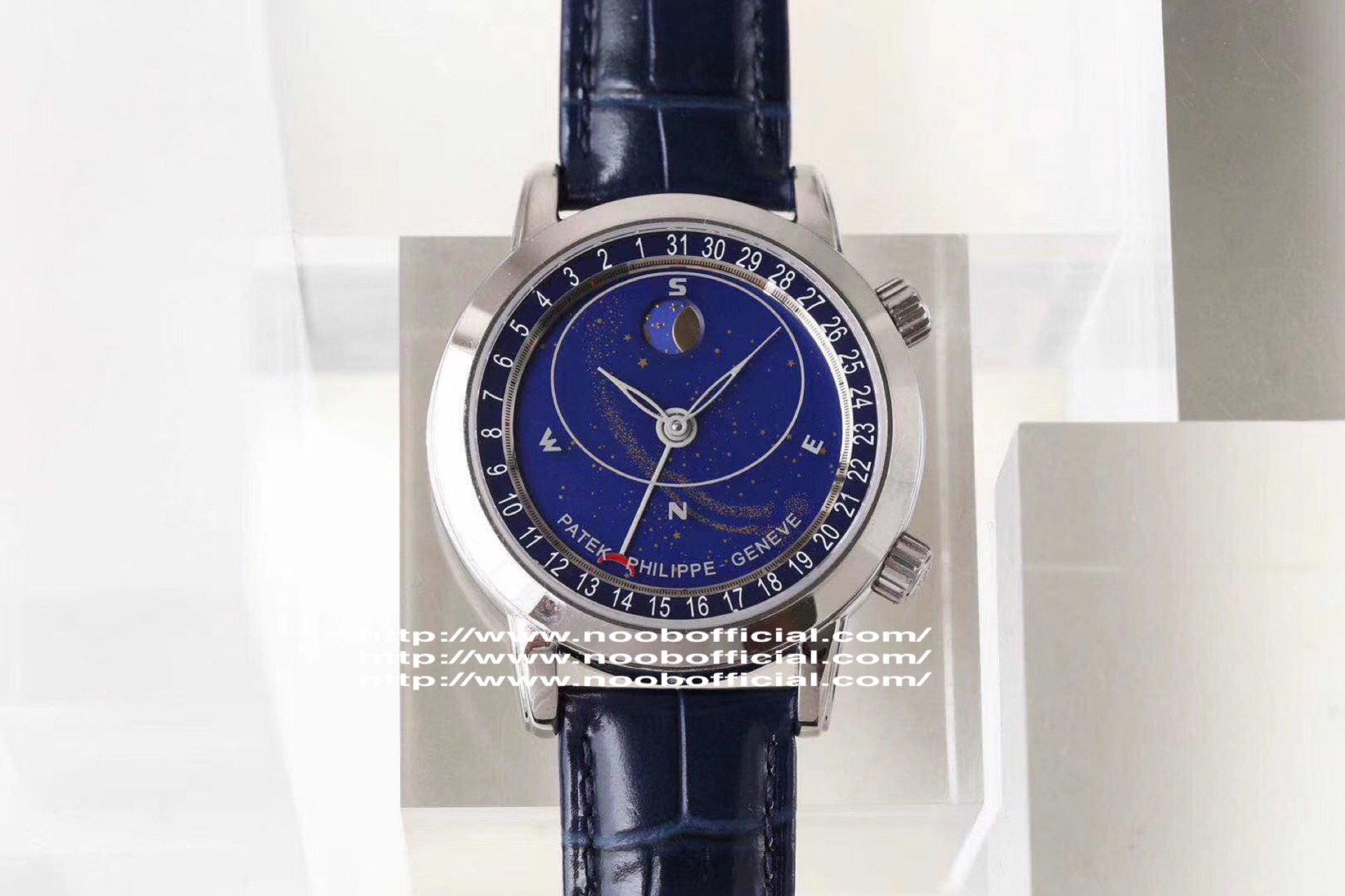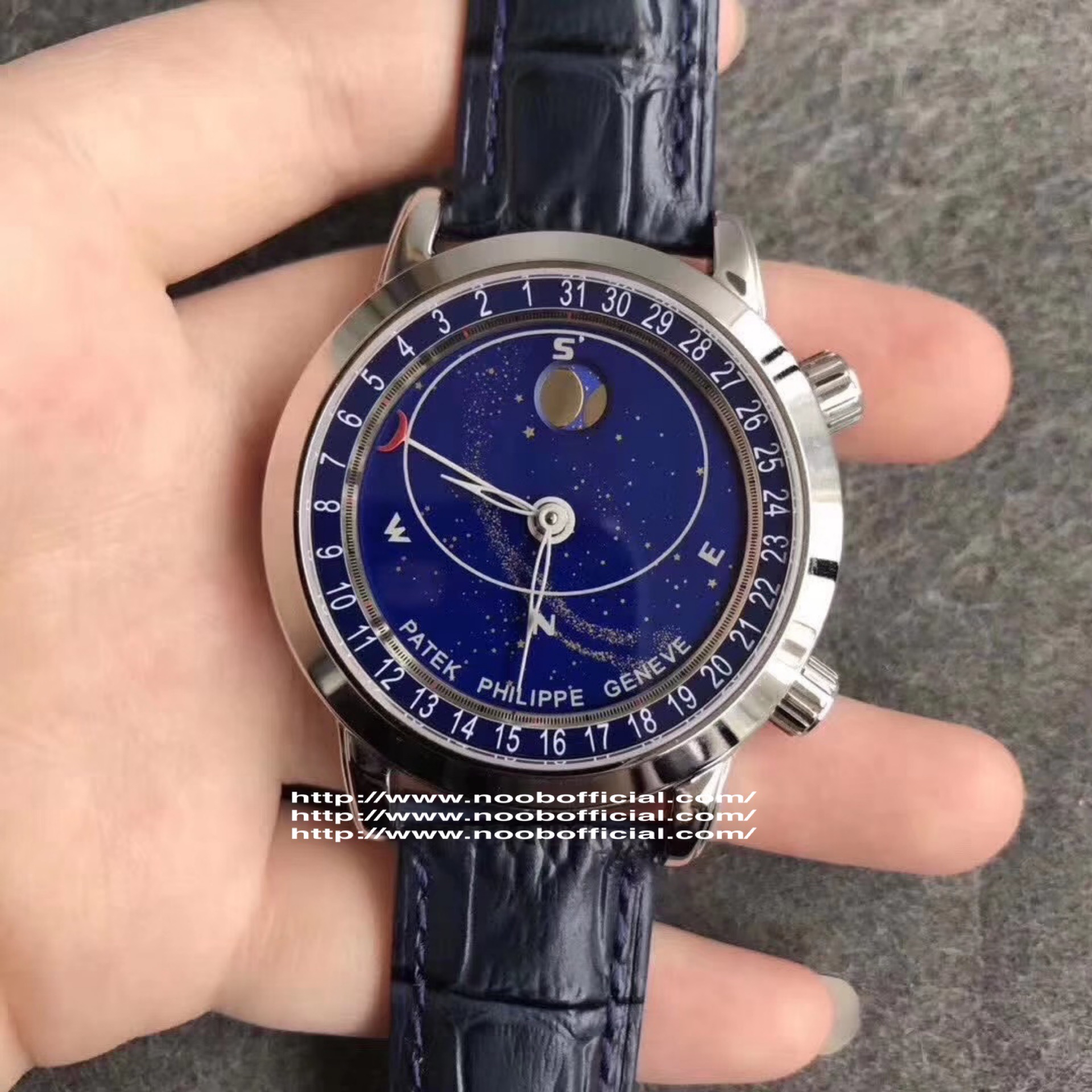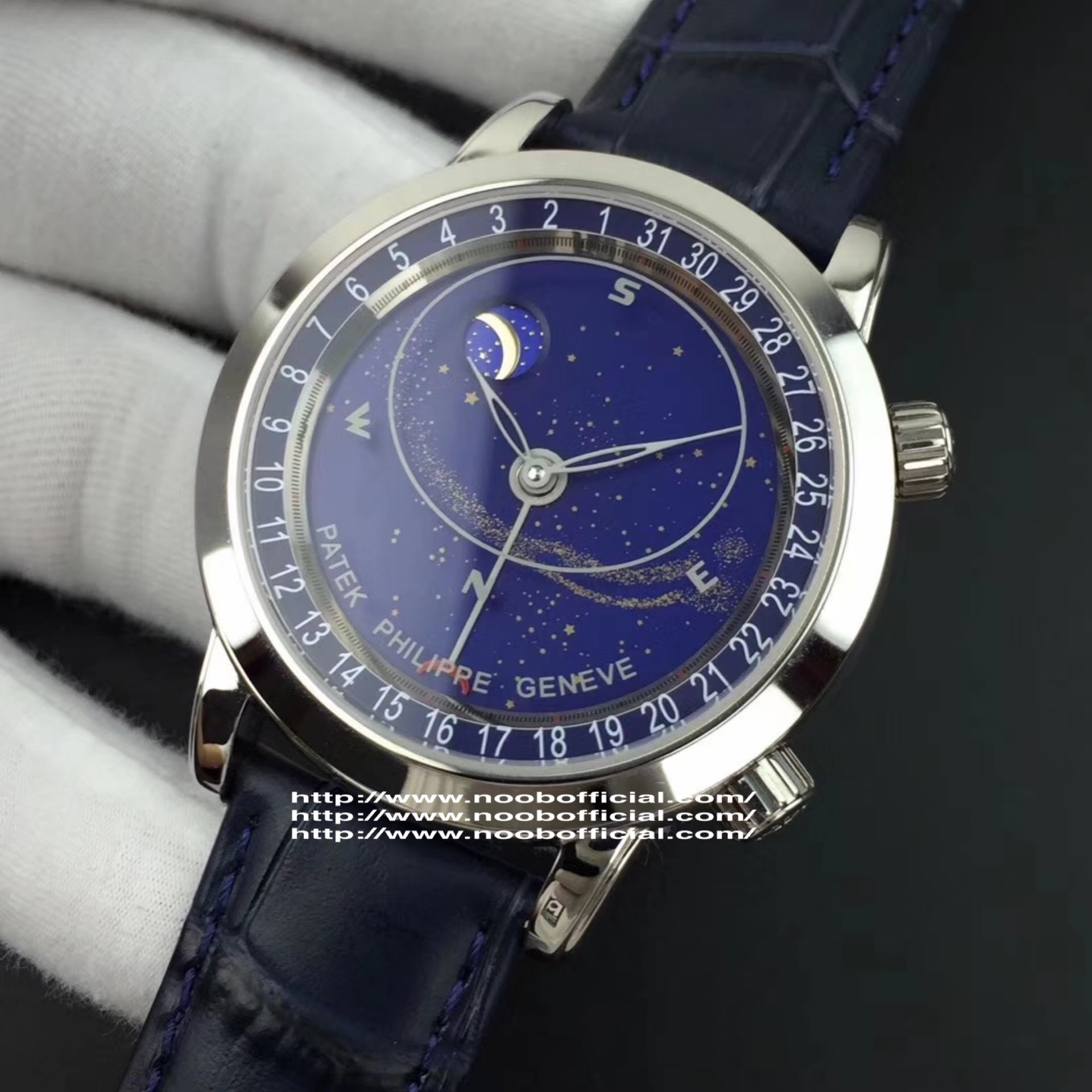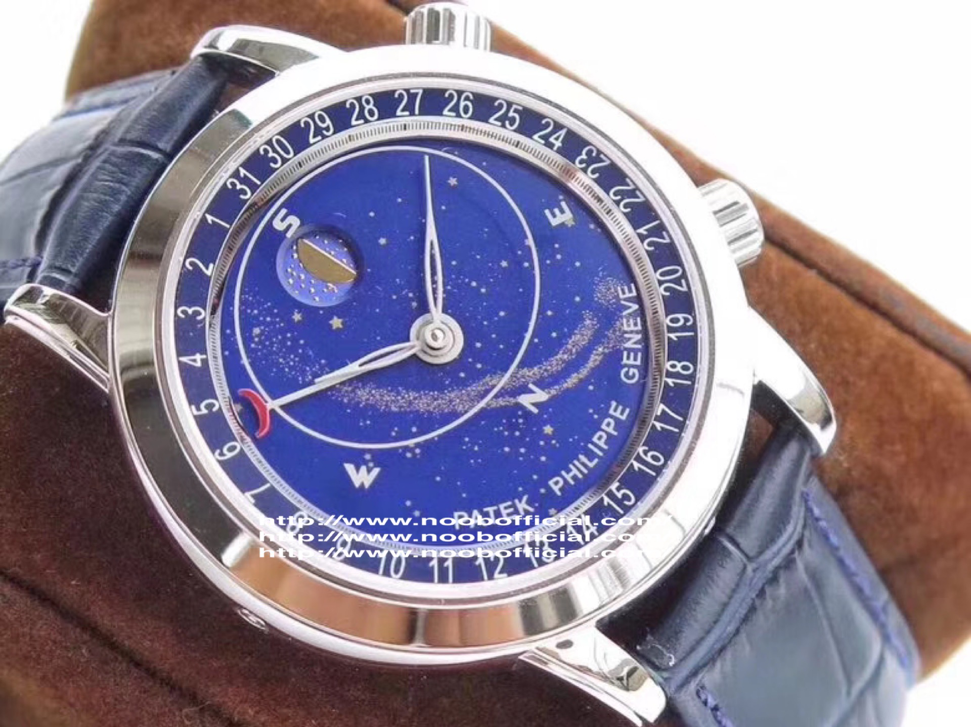 百达翡丽星空升级终极版6102款|6104款超级复杂功能系列。日内瓦苍穹系列你可想象把星空佩戴在腕上吗?这款星空腕表独具特别星象功能,蓝色圆表盘上就能欣赏日内瓦苍穹图,还有金色月球运行轨迹,熬时20个月 采用日本9015改造而成的珍珠陀,和正品一样机心 表盘上的月亮会根据天空的月亮月满圆月蚀弯的情况自动变化 表壳前后玻璃采用先进技术处理让玻璃折射光提高,让表盘看起来更加通透 似乎没有玻璃的感觉 后盖和玻璃也采用和正品一样凹型 打破传统手表后盖和玻璃平行,白光表壳在6字位表壳和表带连接处的宝石采用南非真钻 支持宝石检验,2字把头调时间,日历,月亮盘 5字位把头调星空盘转动。此表在手别无所求。