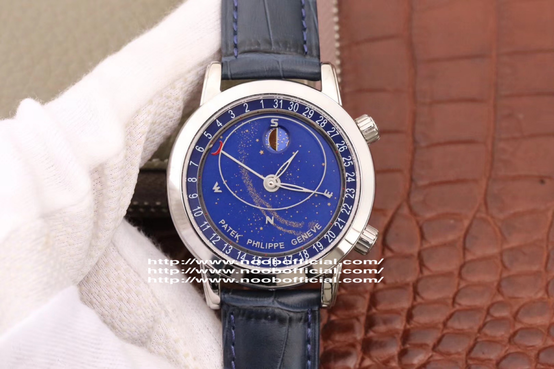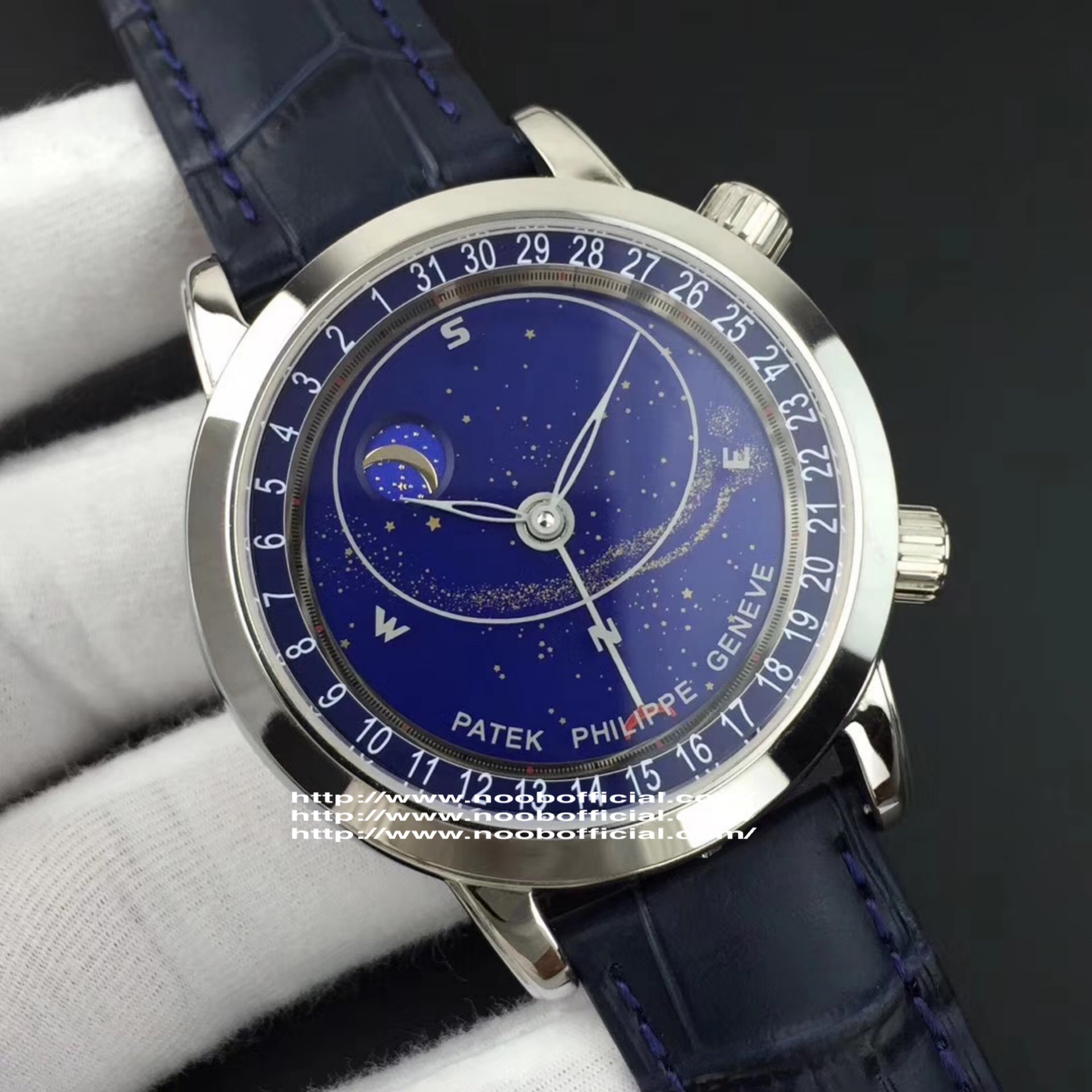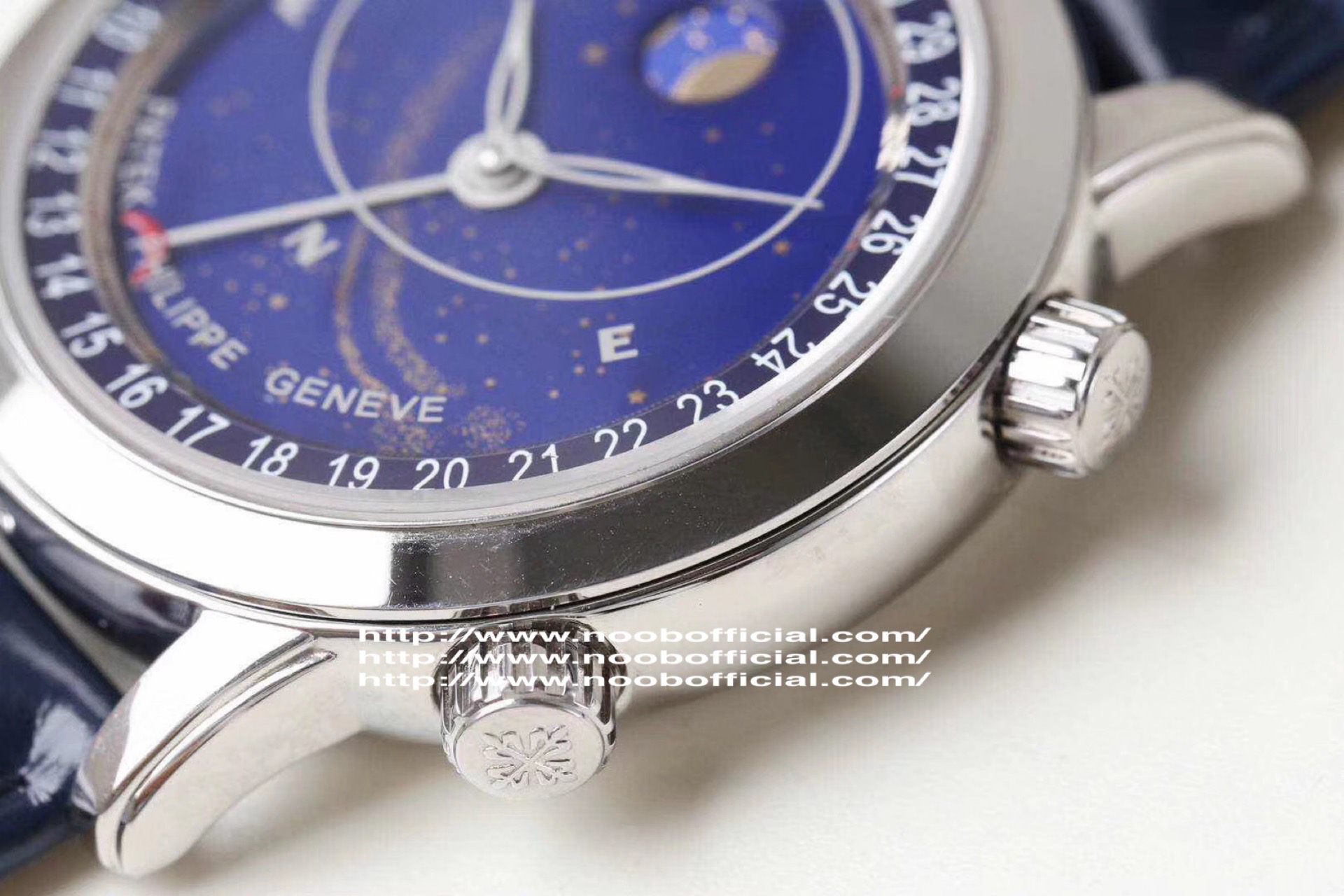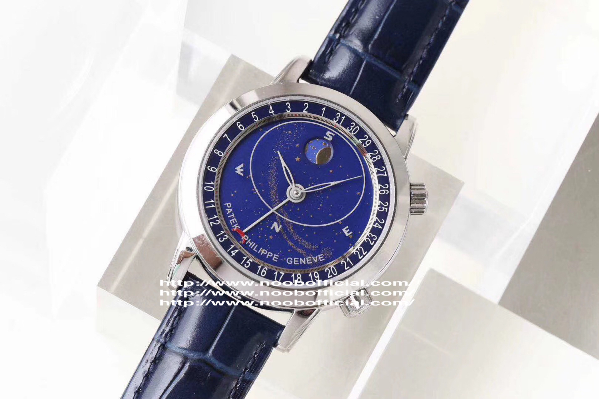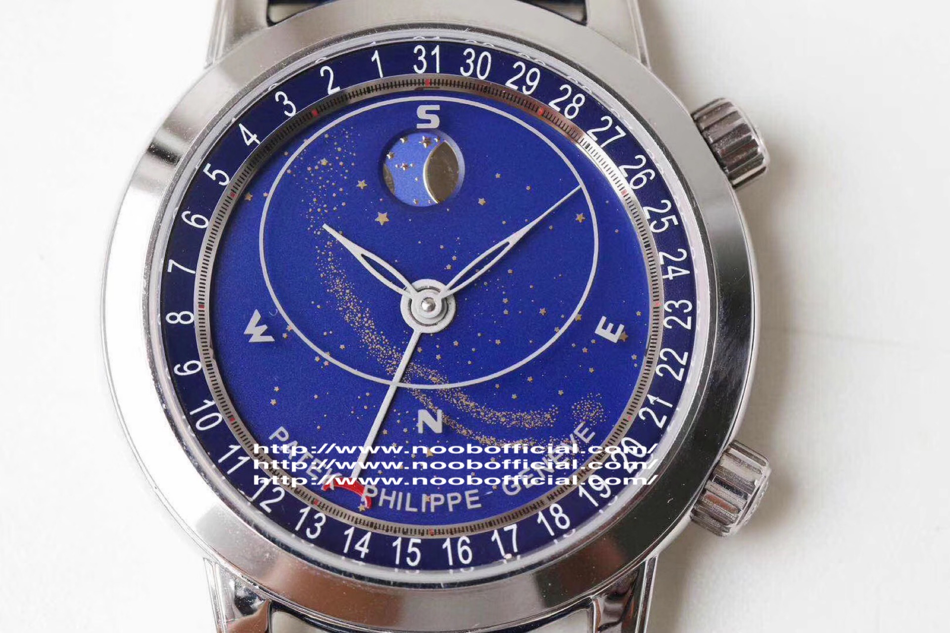 百达翡丽星空升级终极版6102款|6104款超级复杂功能系列。日内瓦苍穹系列你可想象把星空佩戴在腕上吗?这款星空腕表独具特别星象功能,蓝色圆表盘上就能欣赏日内瓦苍穹图,还有金色月球运行轨迹,熬时20个月 采用日本9015改造而成的珍珠陀,和正品一样机心 表盘上的月亮会根据天空的月亮月满圆月蚀弯的情况自动变化 表壳前后玻璃采用先进技术处理让玻璃折射光提高,让表盘看起来更加通透 似乎没有玻璃的感觉 后盖和玻璃也采用和正品一样凹型 打破传统手表后盖和玻璃平行,白光表壳在6字位表壳和表带连接处的宝石采用南非真钻 支持宝石检验,2字把头调时间,日历,月亮盘 5字位把头调星空盘转动。此表在手别无所求。