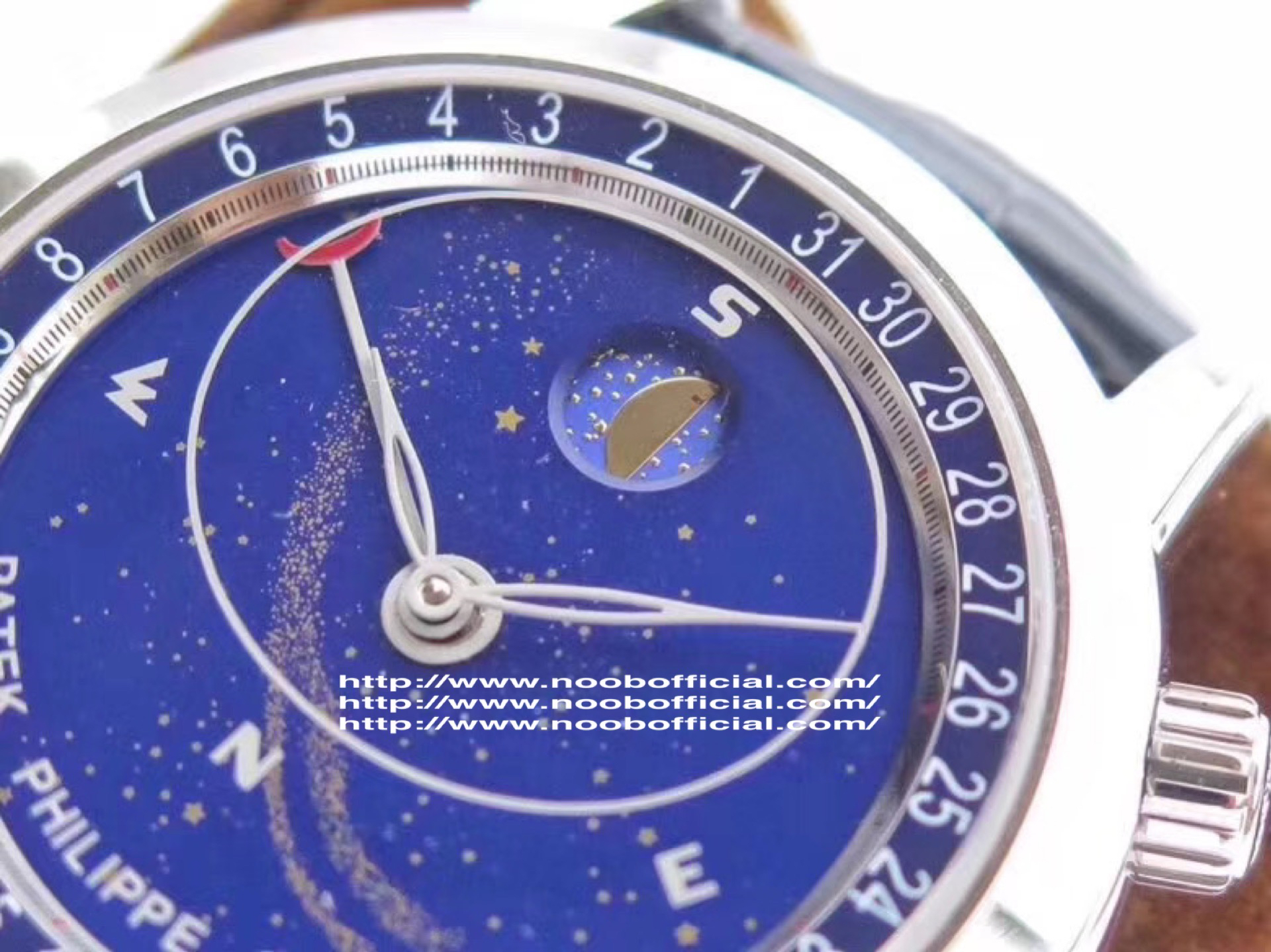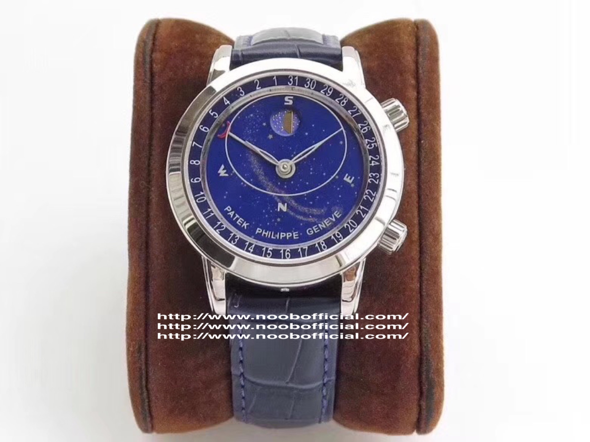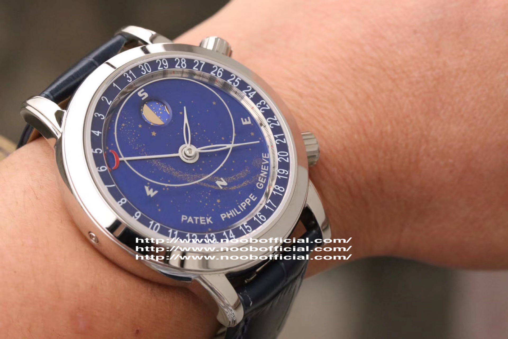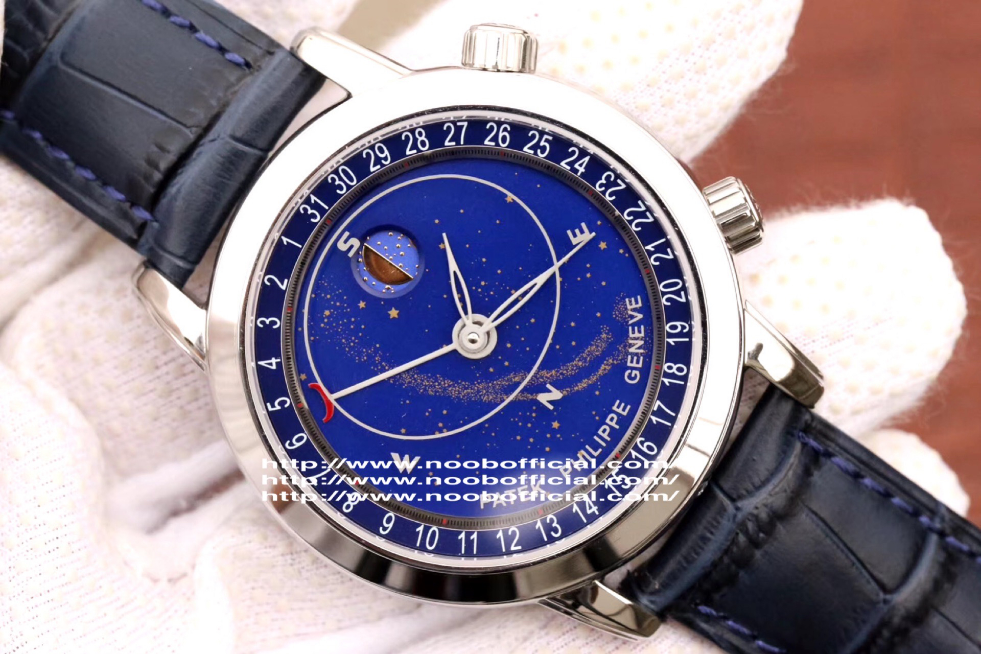 百达翡丽星空升级终极版6102款|6104款超级复杂功能系列。日内瓦苍穹系列你可想象把星空佩戴在腕上吗?这款星空腕表独具特别星象功能,蓝色圆表盘上就能欣赏日内瓦苍穹图,还有金色月球运行轨迹,熬时20个月 采用日本9015改造而成的珍珠陀,和正品一样机心 表盘上的月亮会根据天空的月亮月满圆月蚀弯的情况自动变化 表壳前后玻璃采用先进技术处理让玻璃折射光提高,让表盘看起来更加通透 似乎没有玻璃的感觉 后盖和玻璃也采用和正品一样凹型 打破传统手表后盖和玻璃平行,白光表壳在6字位表壳和表带连接处的宝石采用南非真钻 支持宝石检验,2字把头调时间,日历,月亮盘 5字位把头调星空盘转动。此表在手别无所求。