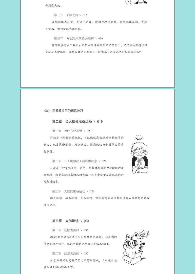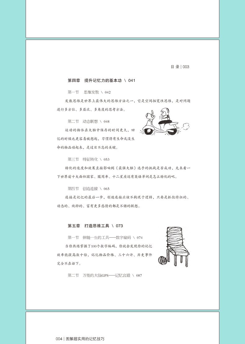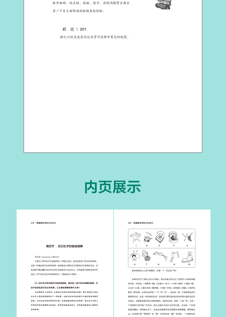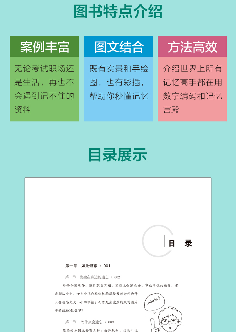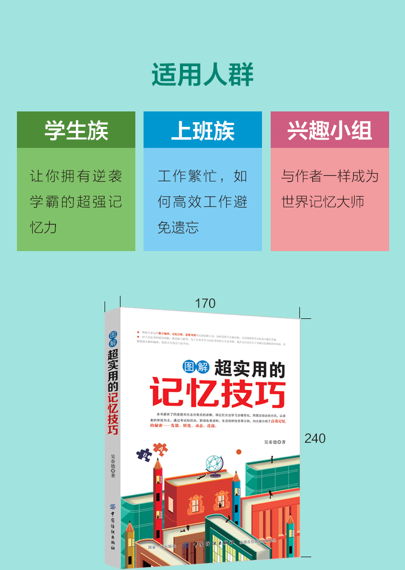 在《图解超实用的记忆技巧》中,我摒弃了同类图书方法分类式的讲解,将记忆方法学习步骤简化,用图文结合的方式,以读者的体验为主,通过考试知识点、职场各类资料、生活琐碎信息等示例,向大家介绍了高效记忆的秘密——发散、转化、动态、连接,帮助大家运用数字编码、记忆宫殿、思维导图等高效思维工具,同时发挥左右脑功能,灵活地将所有记忆技巧融会贯通。对于记忆术的错误理解,我也做了解答,为了让更多学习记忆术的同人少走弯路,我在文后还分享了突破记忆极限的经验谈。掌握*强大脑的秘密,你的人生将会与众不同。