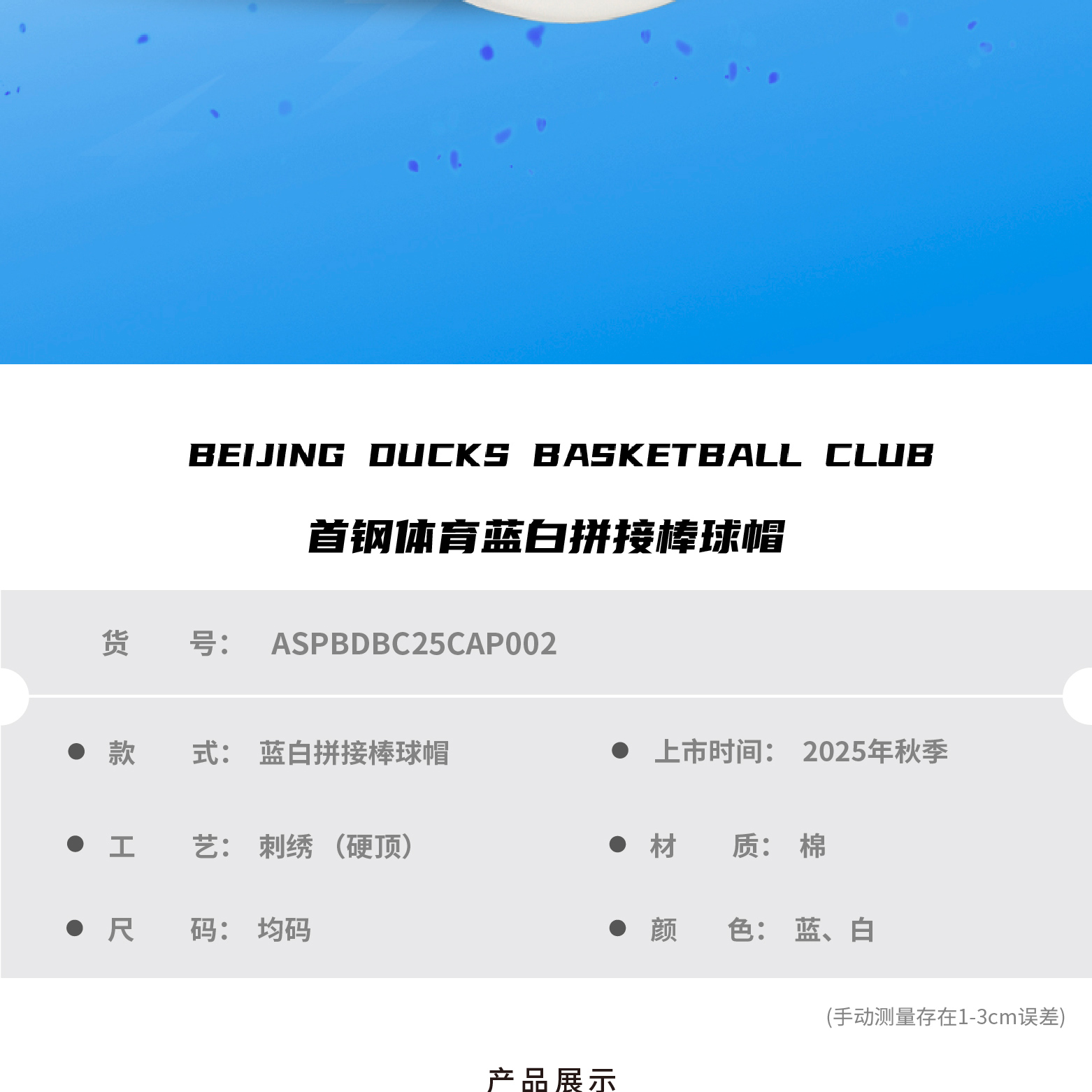 【官方正版】北京首钢俱乐部 | 蓝白拼接棒球帽男女款鸭舌帽