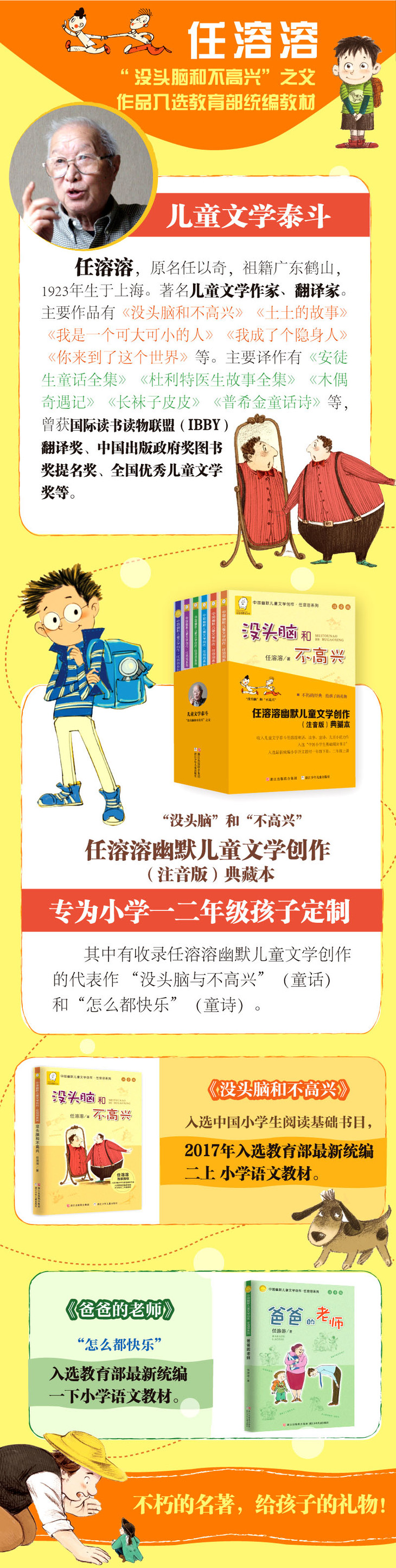 自从2012年开发中国幽默儿童文学创作。任溶溶系列(注音版)以来,形成《没头脑和不高兴》《土土的故事》》《大大大和小小小历险记》《爸爸的老师》《小锡兵的故事》完善了任溶溶幽默原创故事、童话、童诗、《丁丁探案》这部儿童小说加入,任溶溶原创力作品种齐全。系列延伸,独家授权,对任溶溶原创注音系列会有一个很好的拉动。