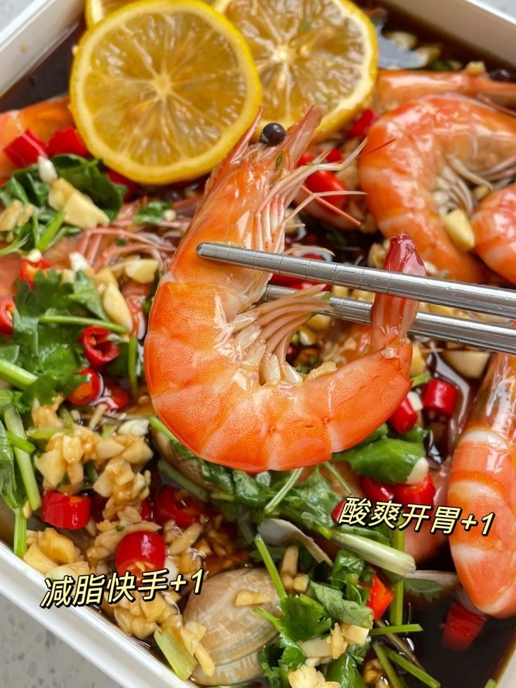 用青岛大虾焯熟过冰水后泡进去 自己可以再随心情加点柠檬 大蒜,洋葱,香菜……一整个腌入味的酸甜鲜辣爽 夏季刷脂瘦身餐吃它啊 太容易坚持了,不吃都想❗