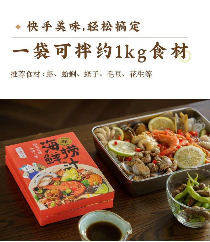 我们做的是有点稠的那种,非常足料。 你可以按每袋加200g饮用水的比例浸泡食材 也可直接当蘸料,一袋可拌约1KG食材 用量按个人口味增减