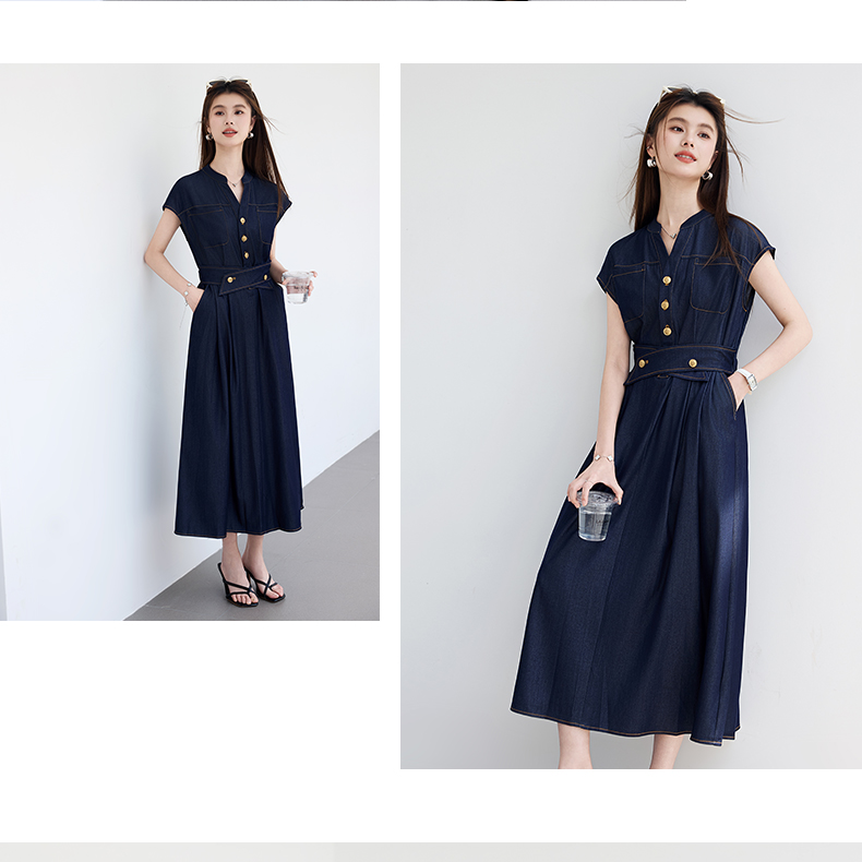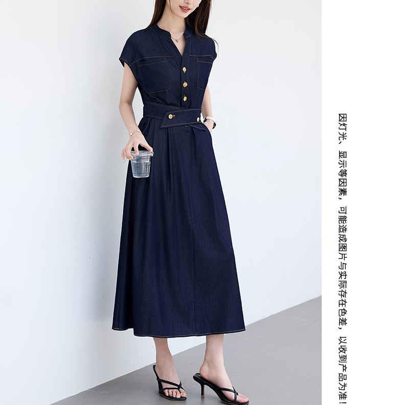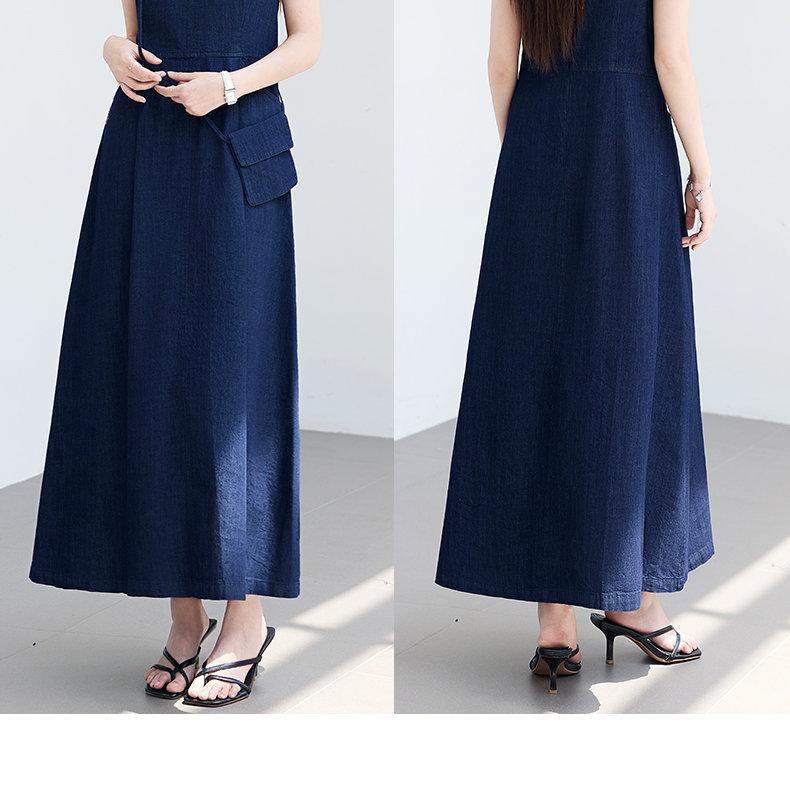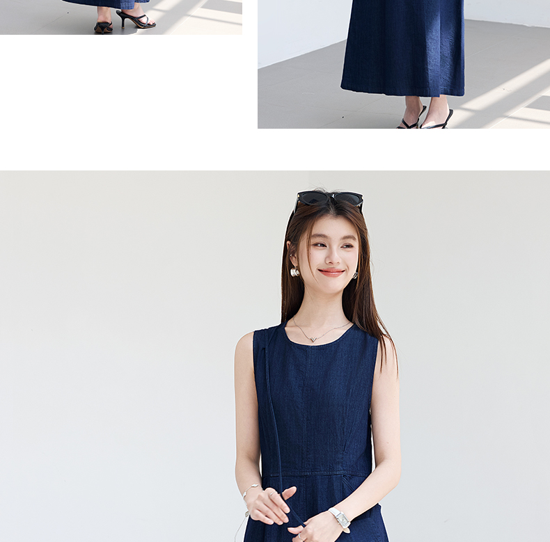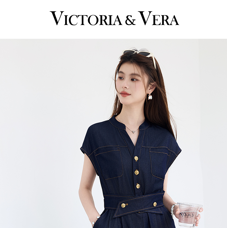 VICTORIA&VERA夏季“影迹交织”仿牛仔无袖连衣裙中长款交叉腰纽扣装饰显瘦遮胯休闲裙---V9013L18