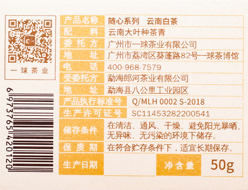 一球2020年随心系列云南月光白茶 散茶 银毫蜜香办公室泡茶50g