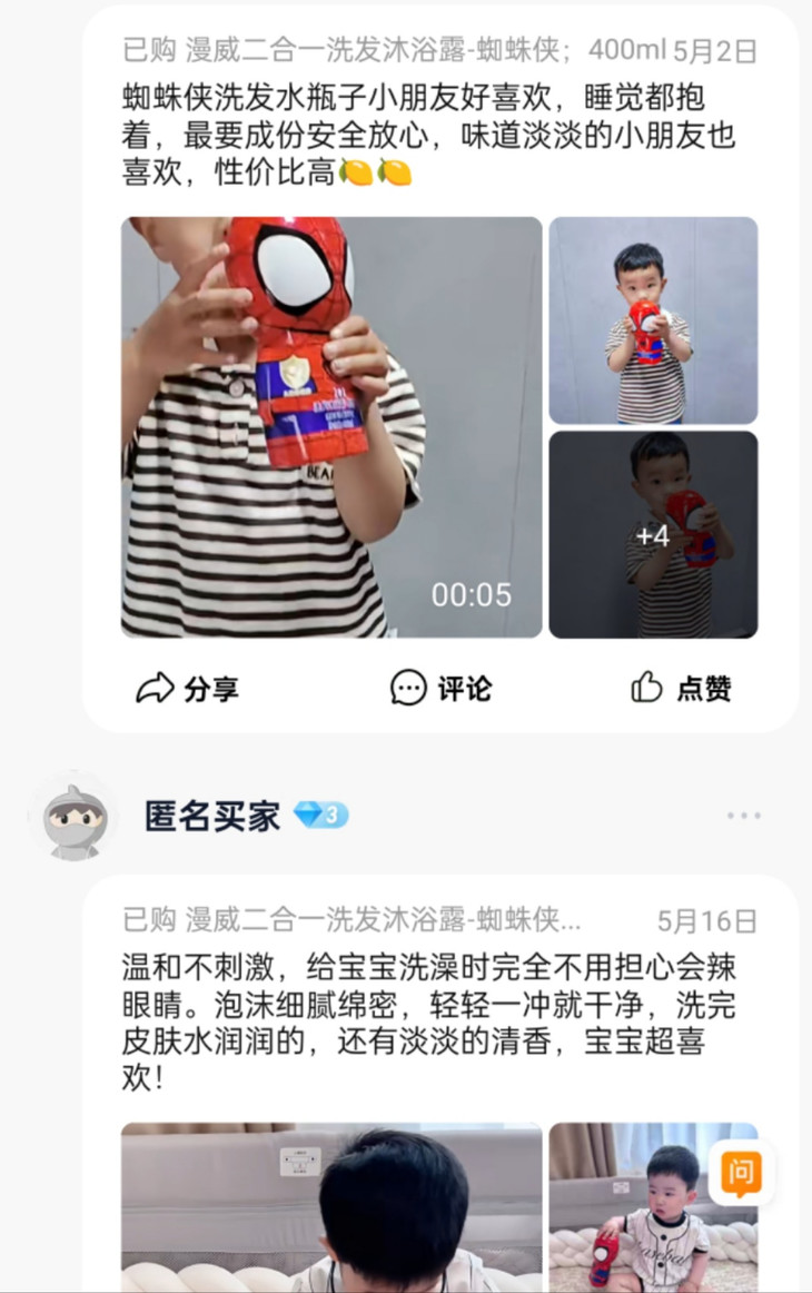 先说颜值!! 迪士尼真的太懂小朋友的心了 送给朋友家娃的蜘蛛侠沐浴露 他以为是玩具,就这样一直抱着玩 看电视都要抱着它~ 叫他吃饭了也不肯放下 跟他说了这是洗澡用的,他还是要抱着