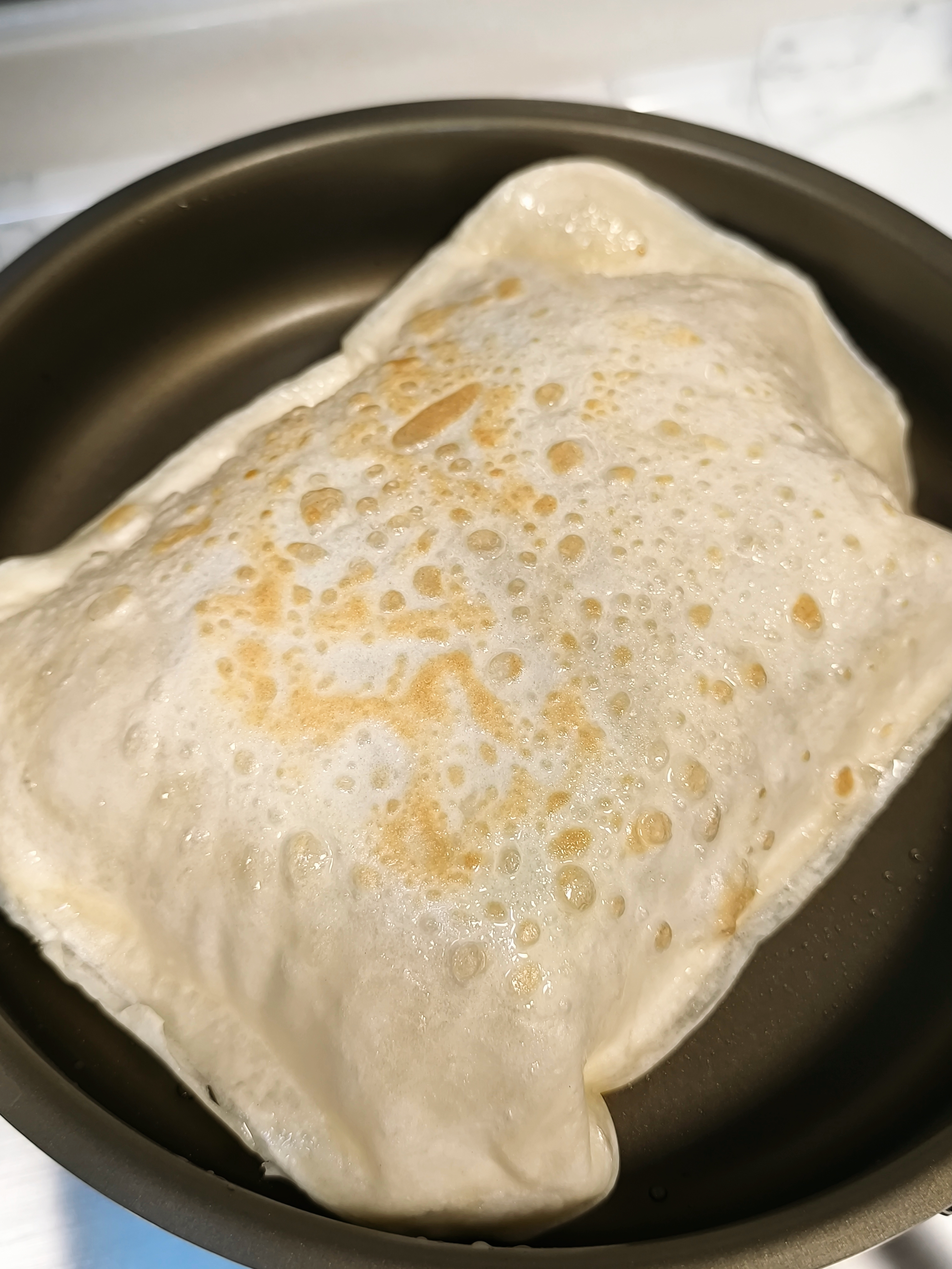 开袋直接下锅,平底锅刷一层薄油,中小火煎30秒就开始鼓出饱满大泡,像吹气球一样超治愈🥰,用筷子轻轻戳个小洞,倒入打散的鸡蛋液,翻面再煎30秒,金黄焦香、外酥里软的灌饼就搞定了,全程不超过5分钟,早起刷牙洗脸的功夫,营养早餐就上桌,再也不用早起半小时赶早餐摊!