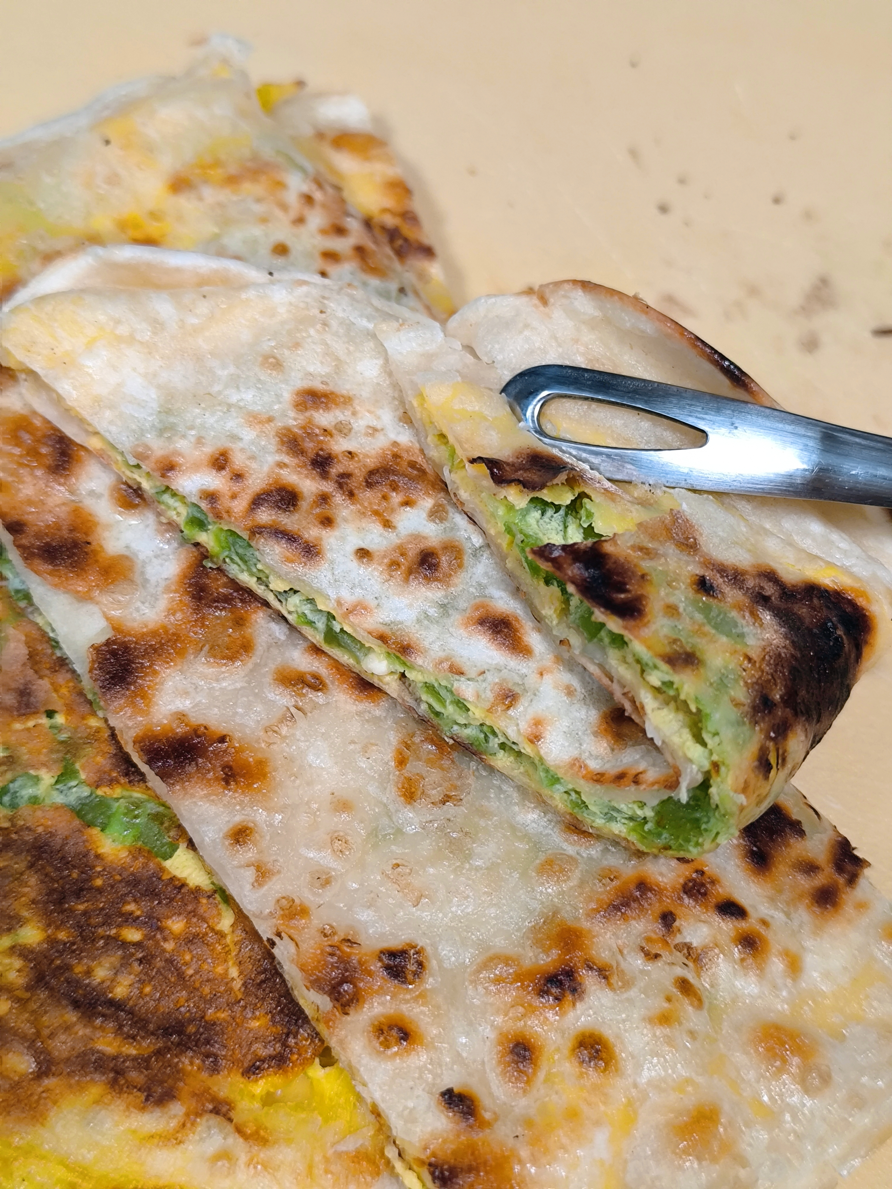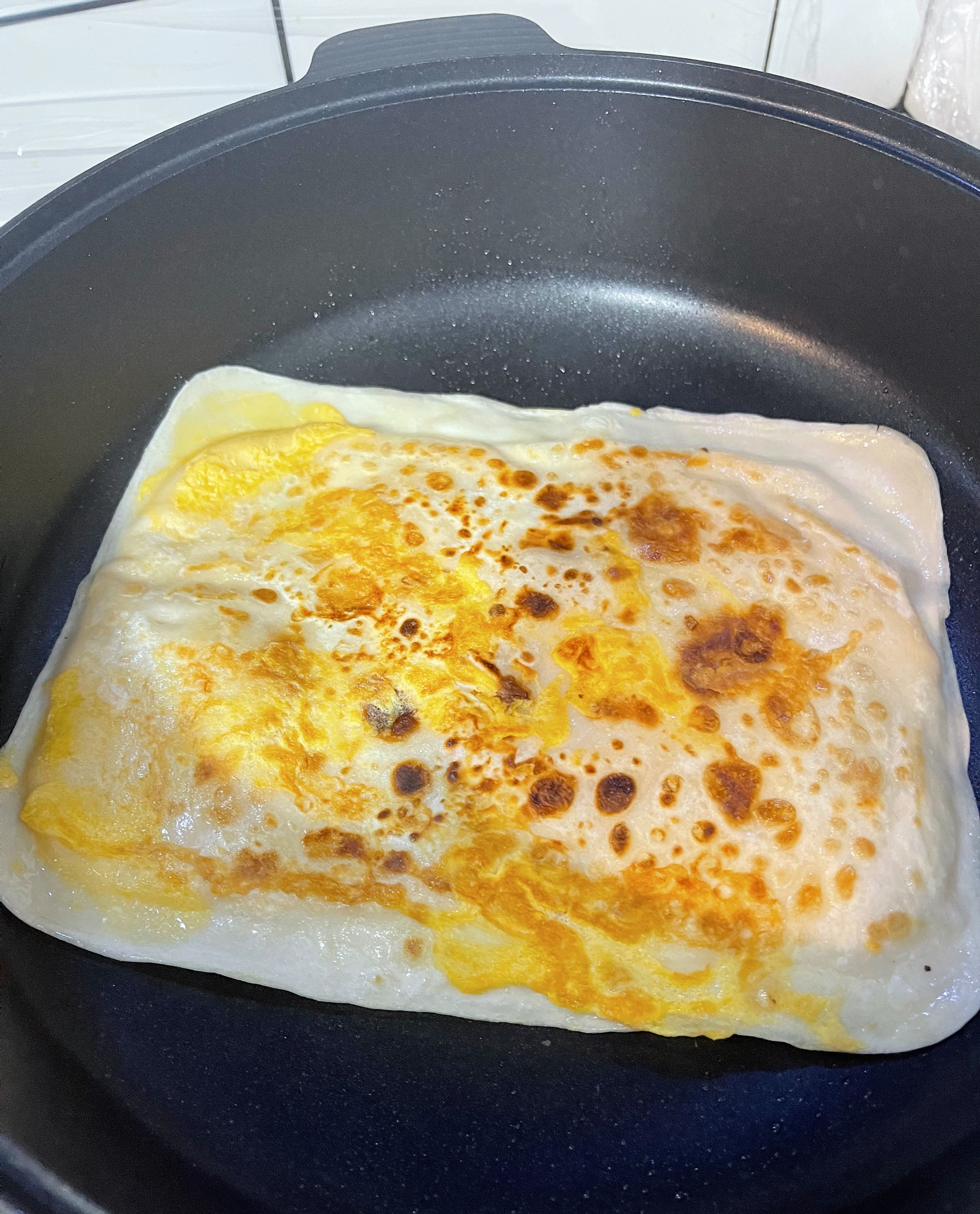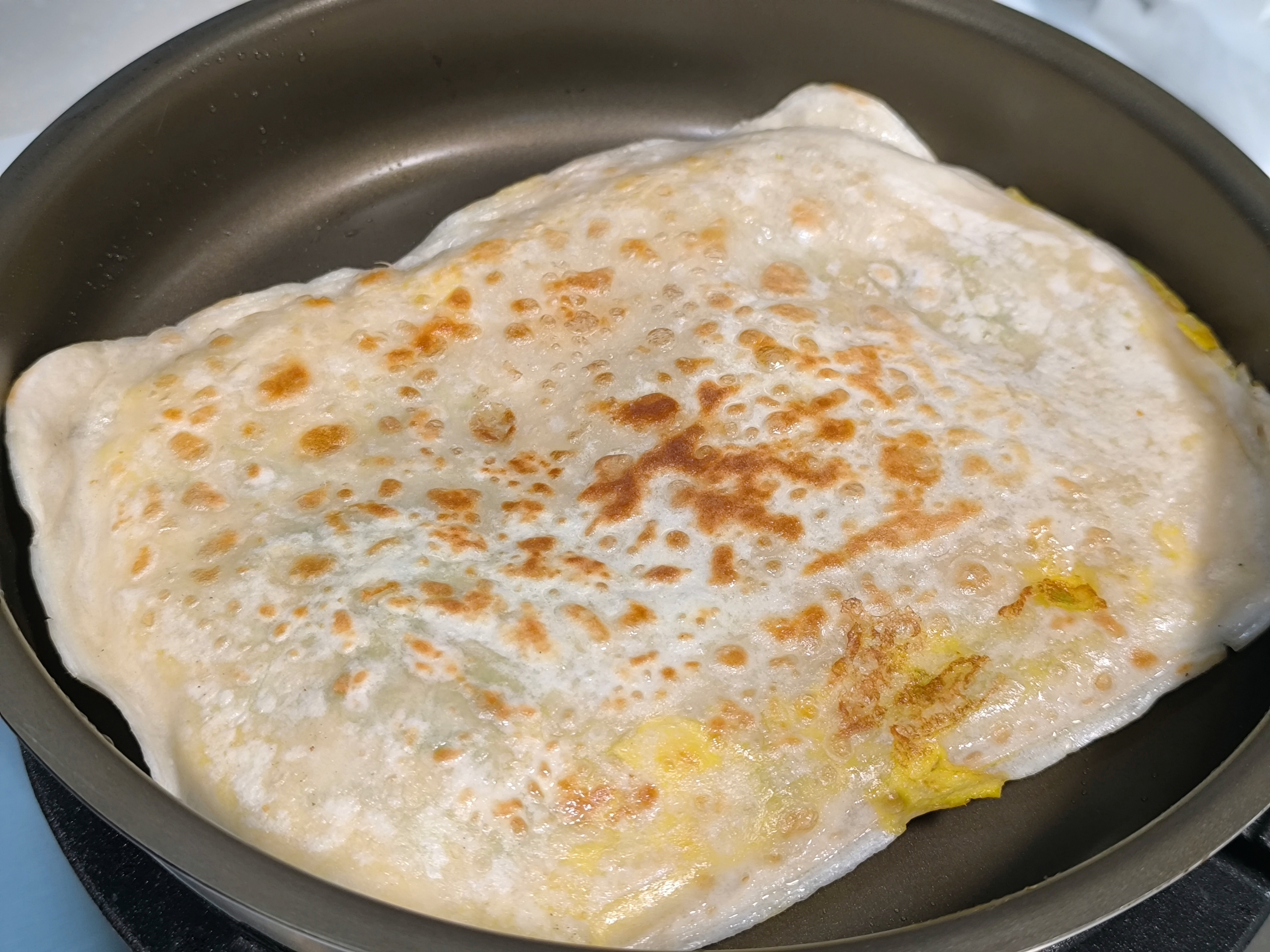 煎到饼皮金黄微焦,蛋液刚好凝固,一口下去外酥里软