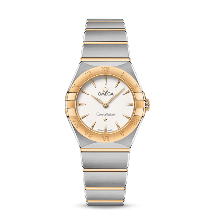 镜面材质 | 蓝宝石水晶玻璃 | 表盘 | 经典的半月形切面、“托爪”以及mono-rang表链。 黄色18K金与精钢打造,表圈镌刻罗马数字刻度,冰霜银表盘晶莹洁白,覆以耐磨损蓝宝石玻璃表镜。指针、欧米茄品牌标识、星座徽标以及小时刻度亦以黄色18K金打造而成。 密底,表背印有星座天文台徽章。 |