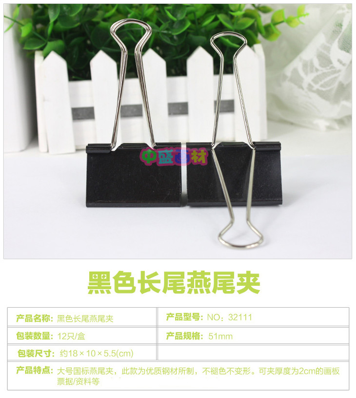 Artoop长尾票夹 黑色燕尾夹/资料试卷夹/夹子 51mm大号夹子