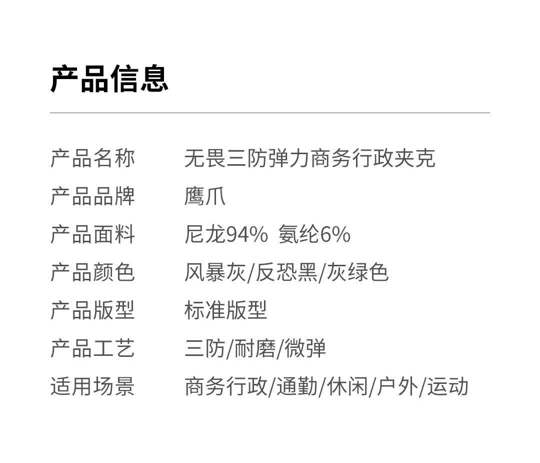 鹰爪,中国功能男装创领品牌,致力于服务中国3亿新中产阶级,着力打造全场景穿着体验创新平台,三十年产业深耕的积淀,以用户的痛点为己任,开创兼具军品与户外装备的功能动态穿着系统。