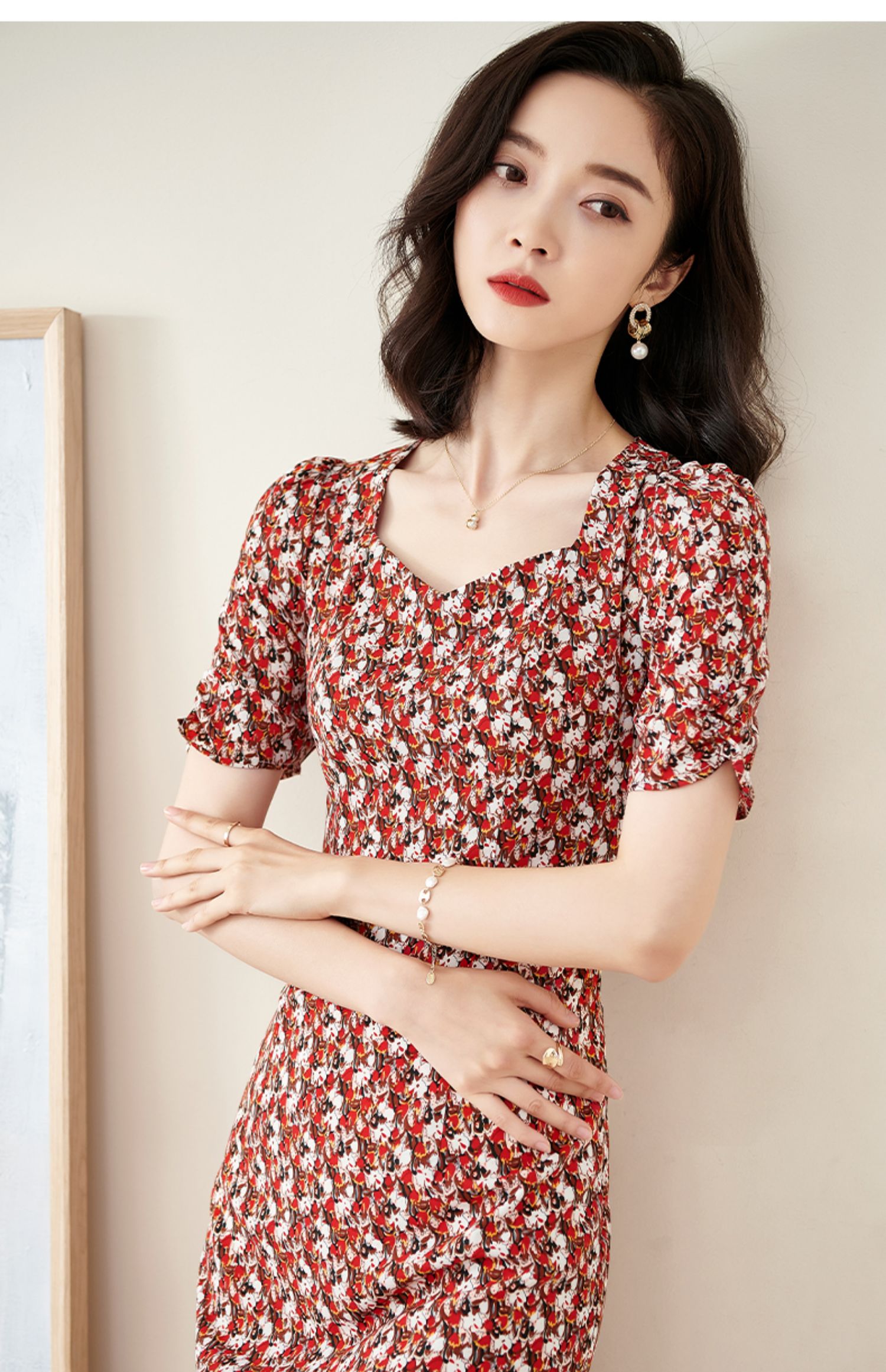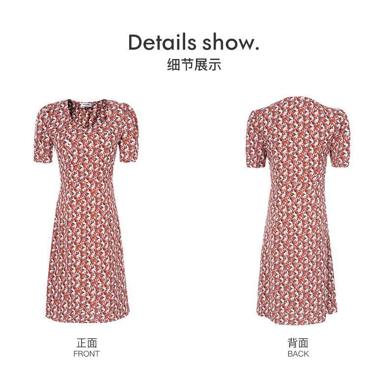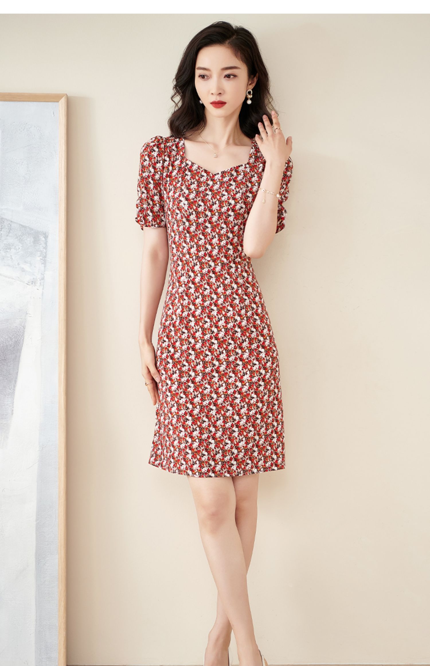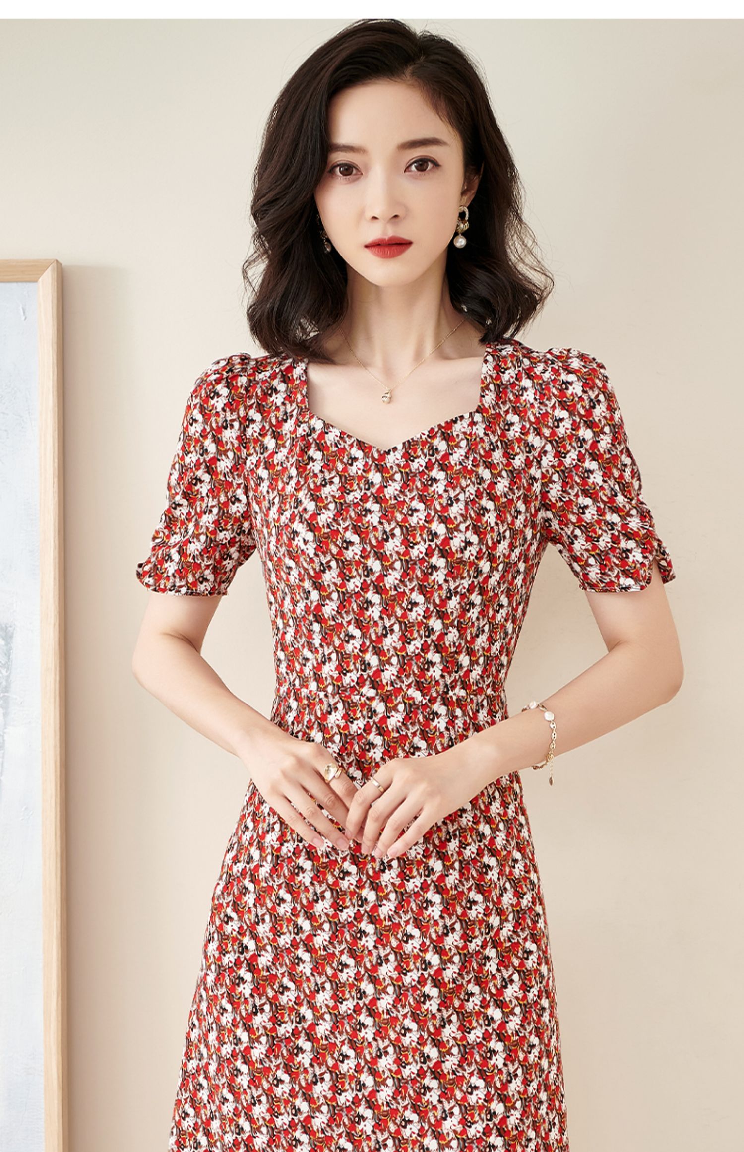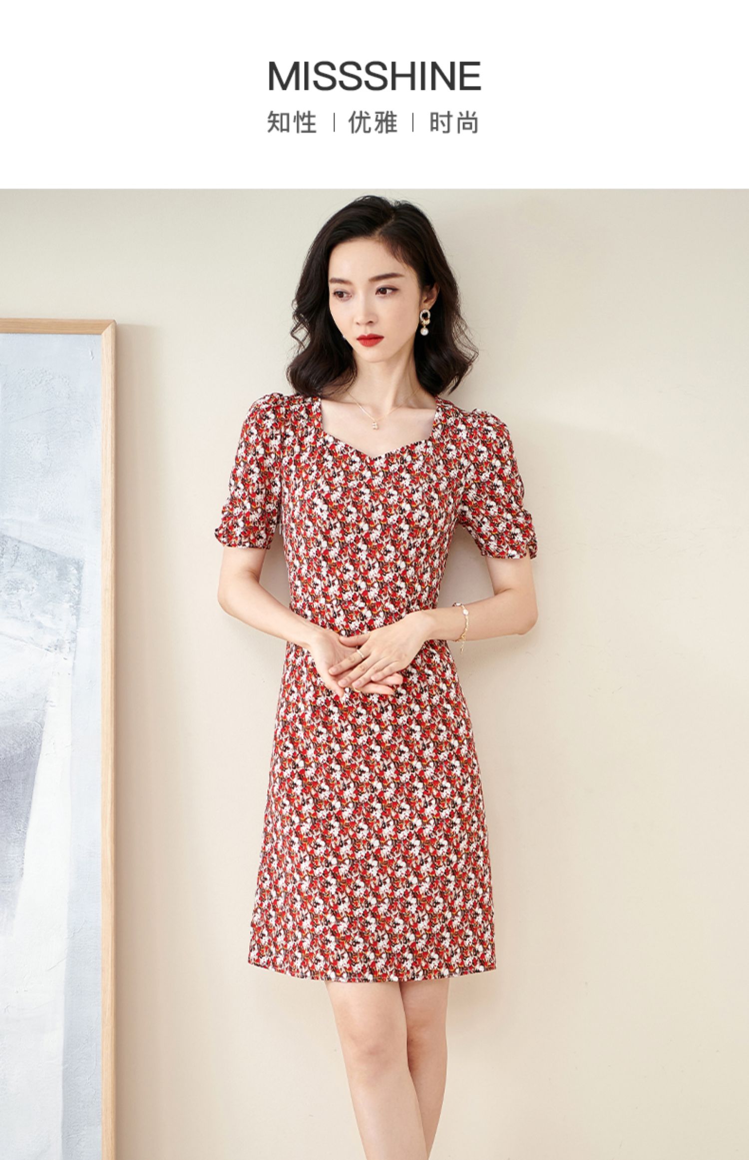 米思阳2025夏季新款法式优雅碎花中长裙修身显瘦泡泡袖连衣裙1172