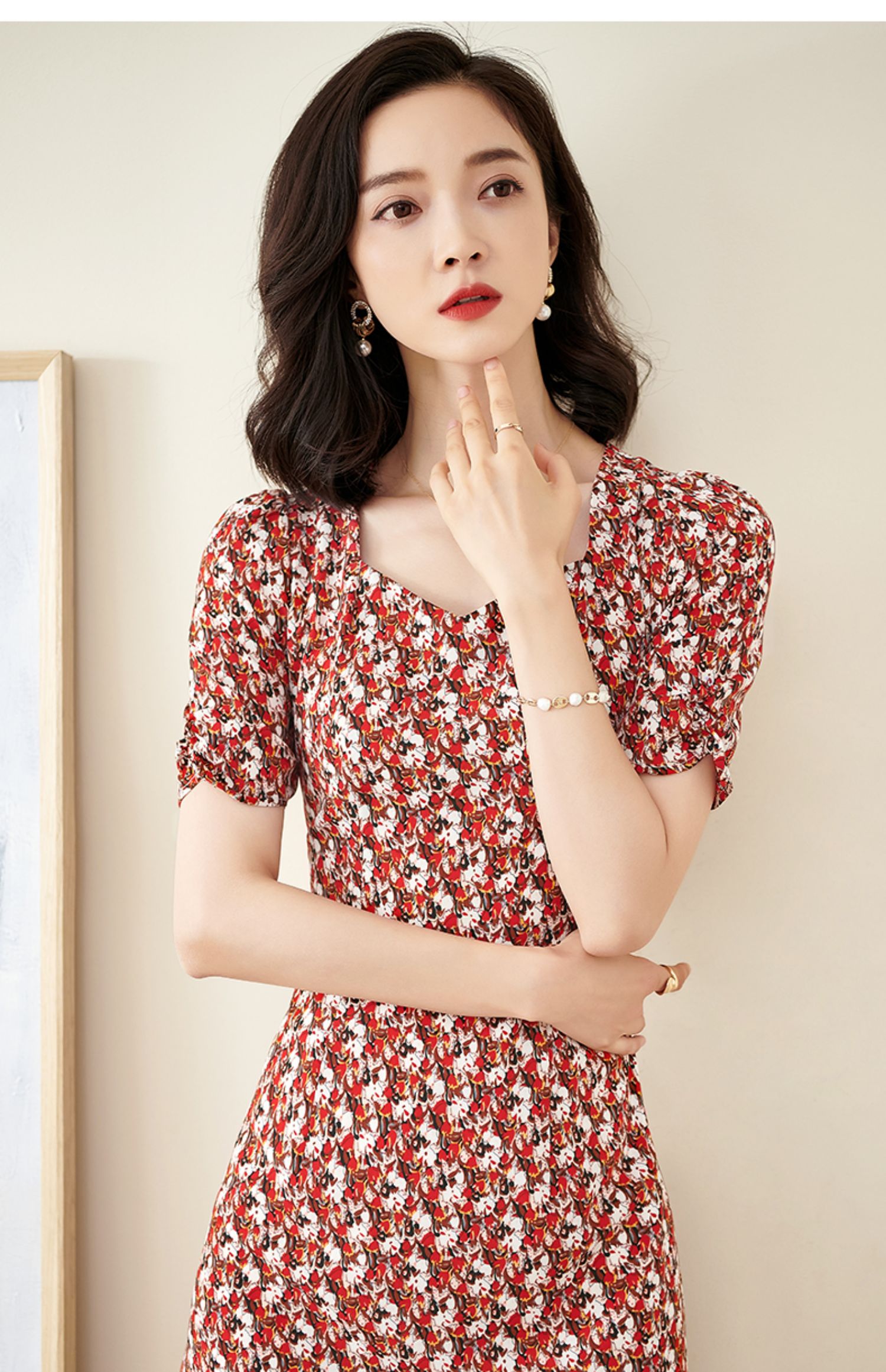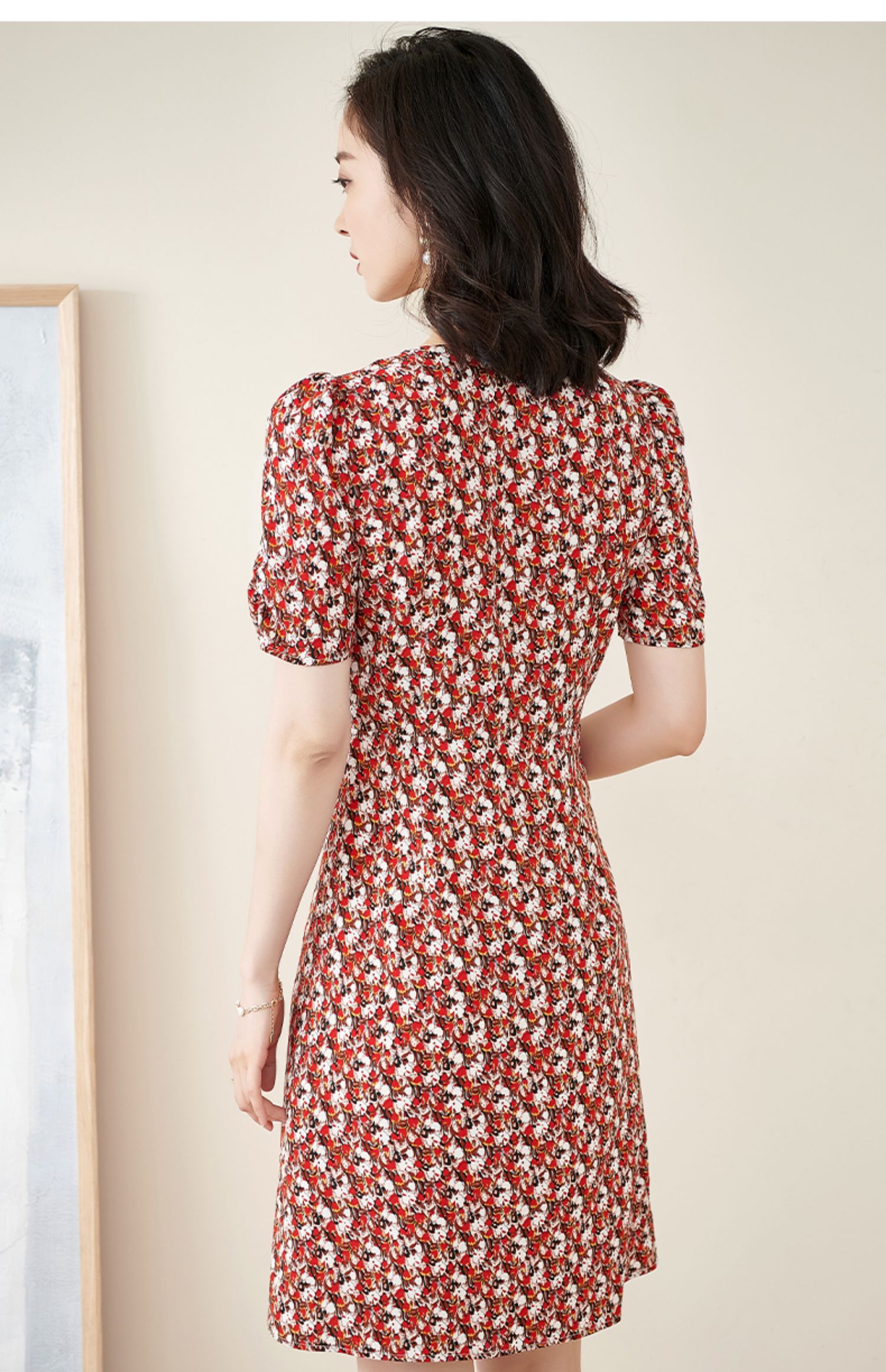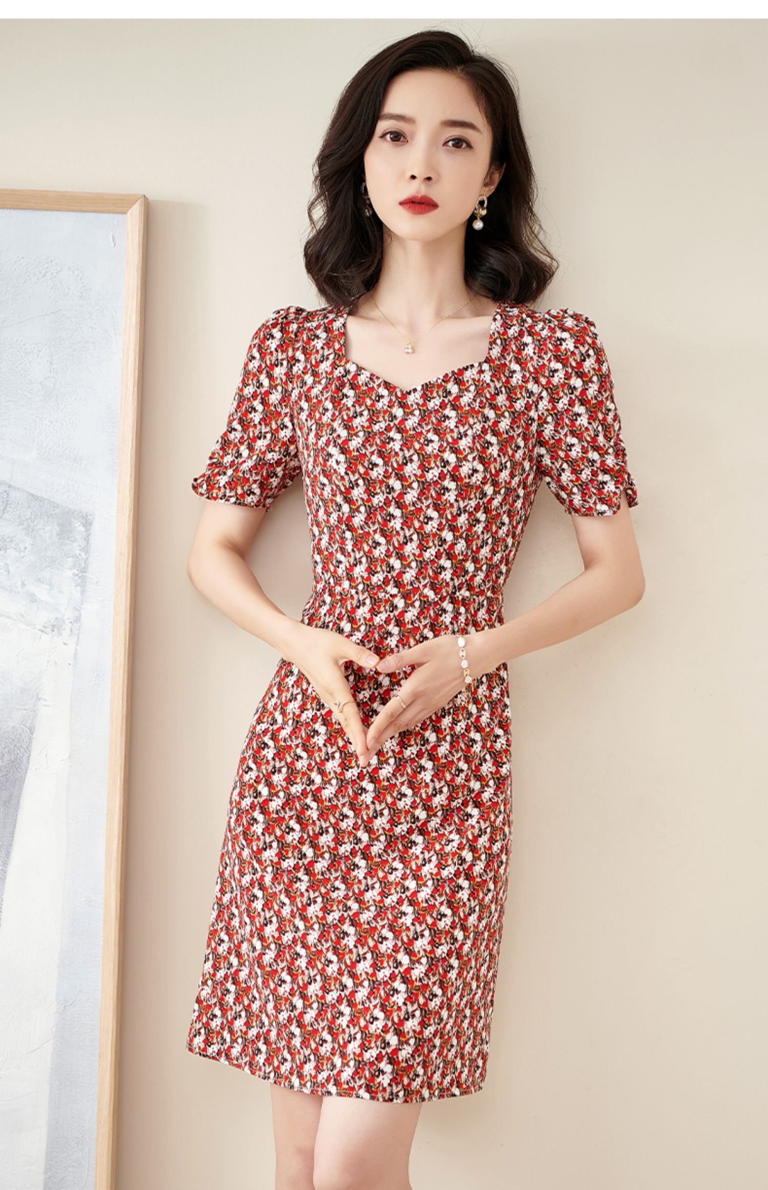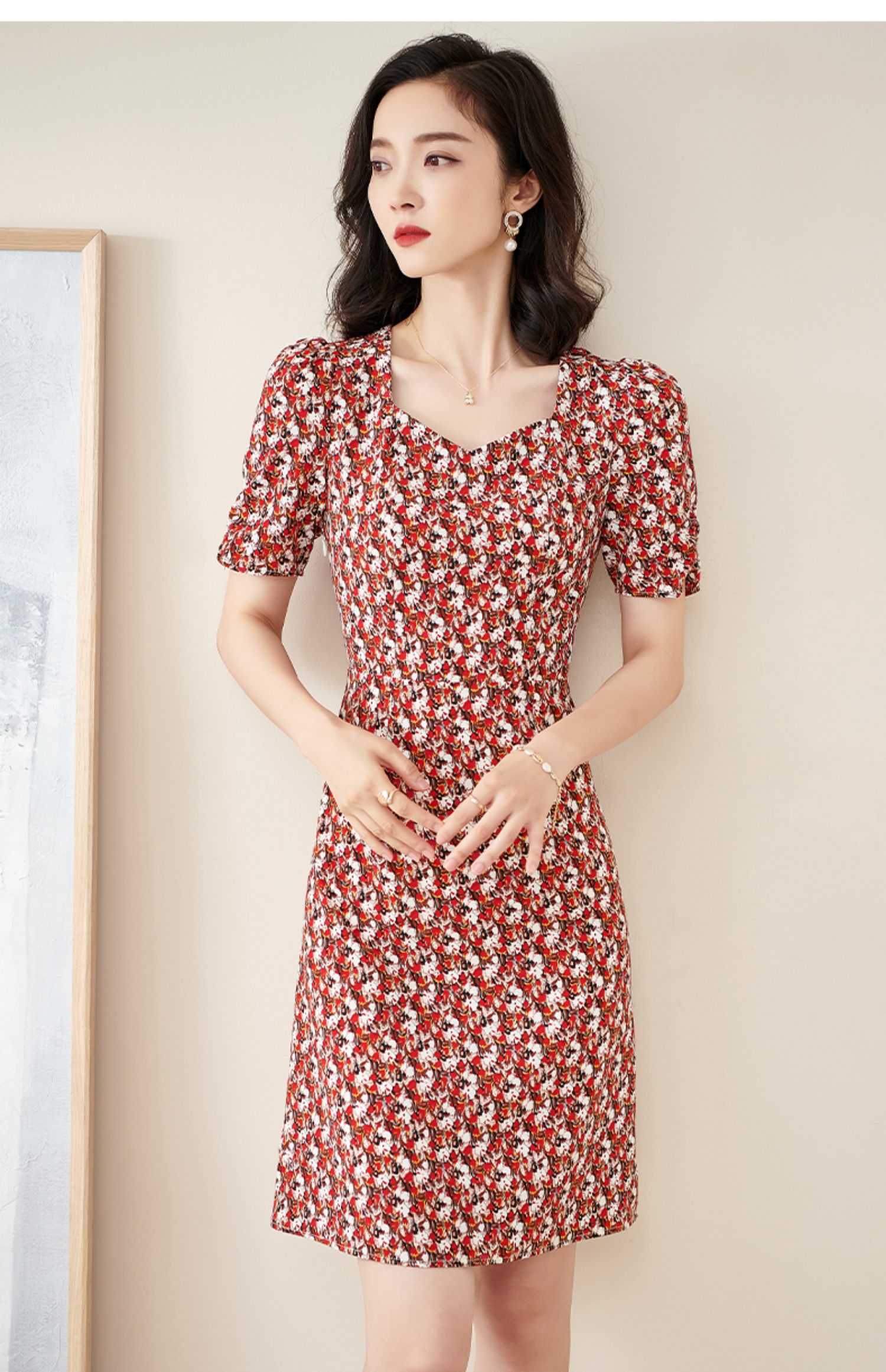 米思阳2025夏季新款法式优雅碎花中长裙修身显瘦泡泡袖连衣裙1172