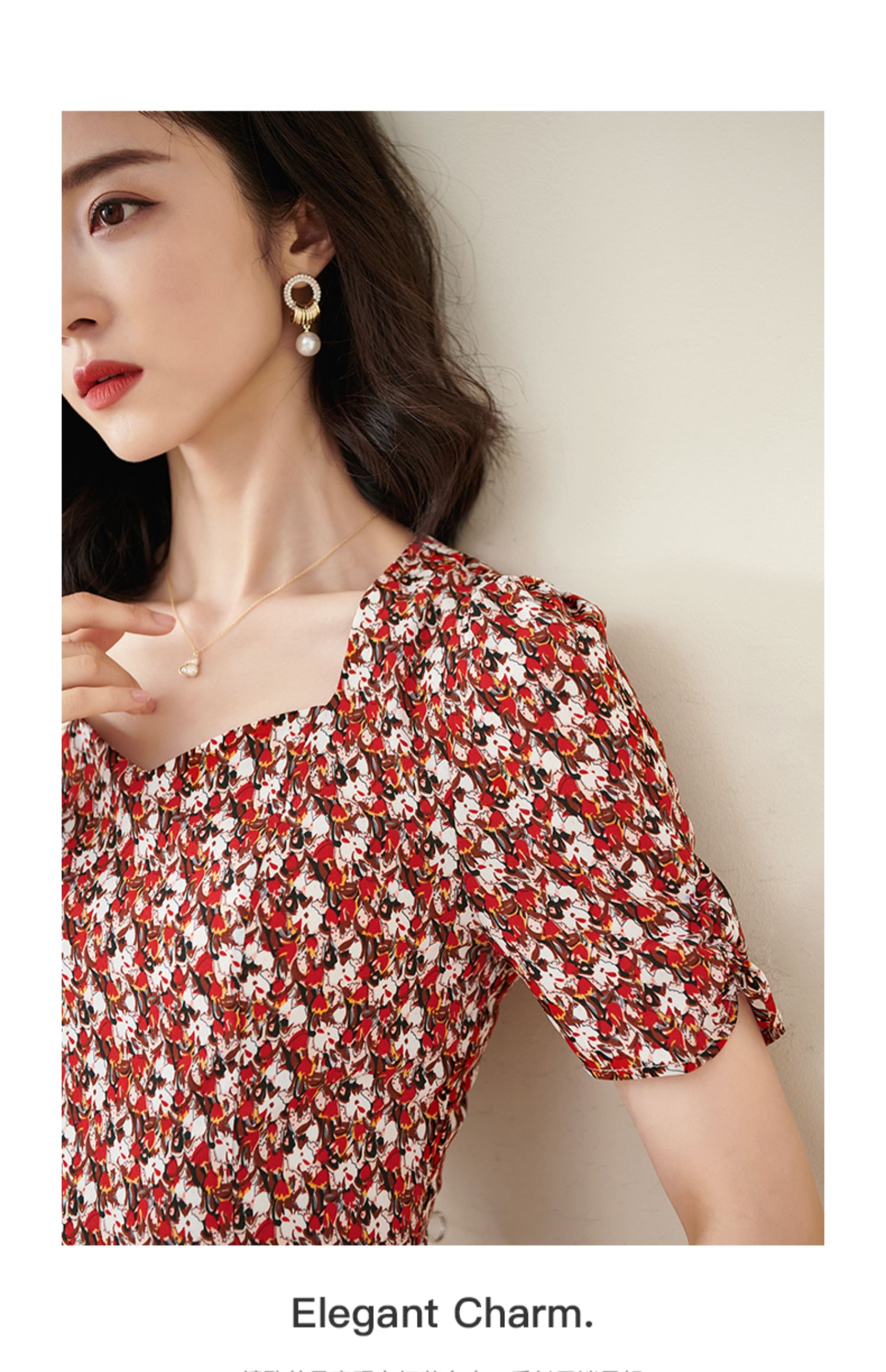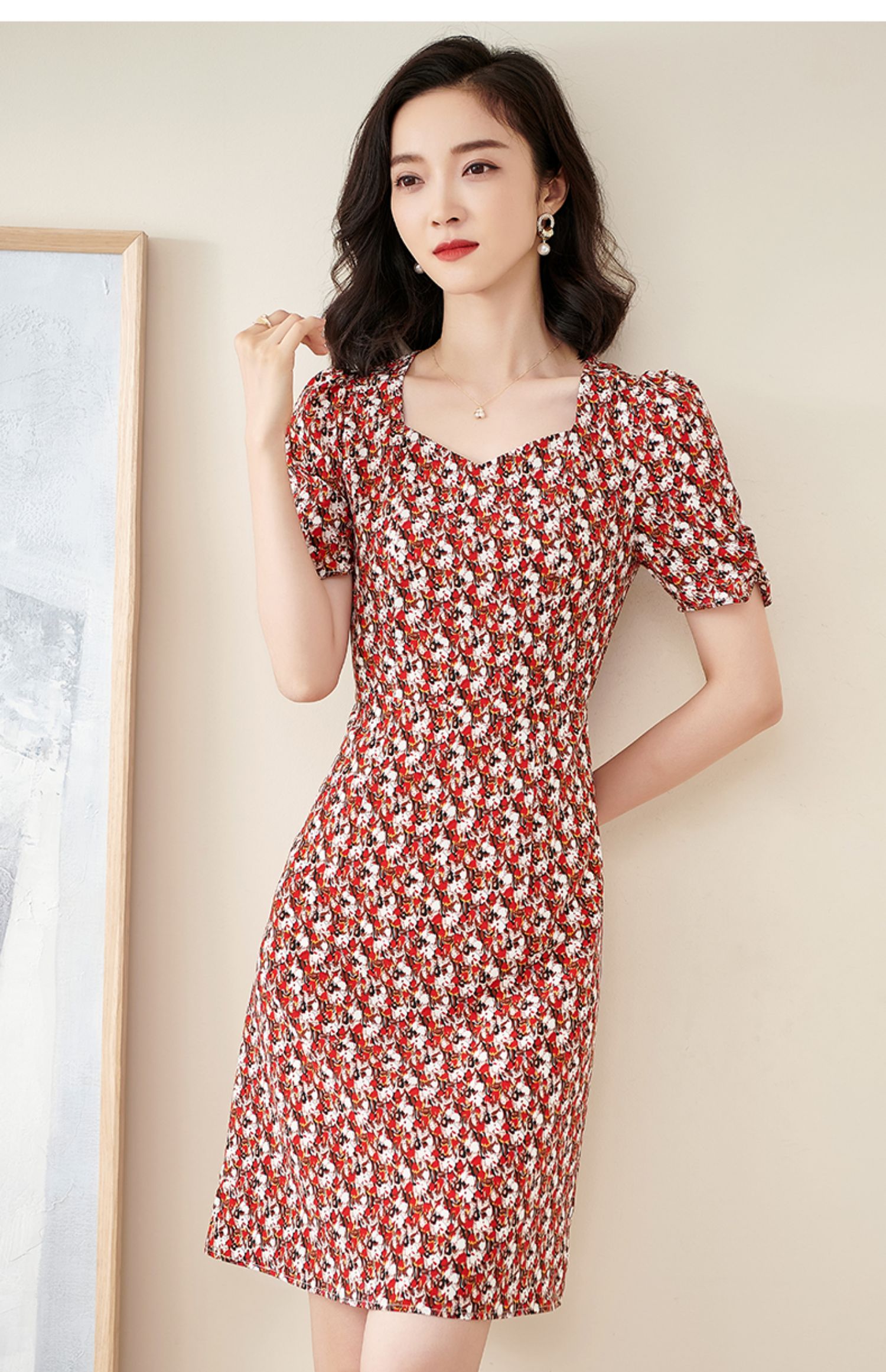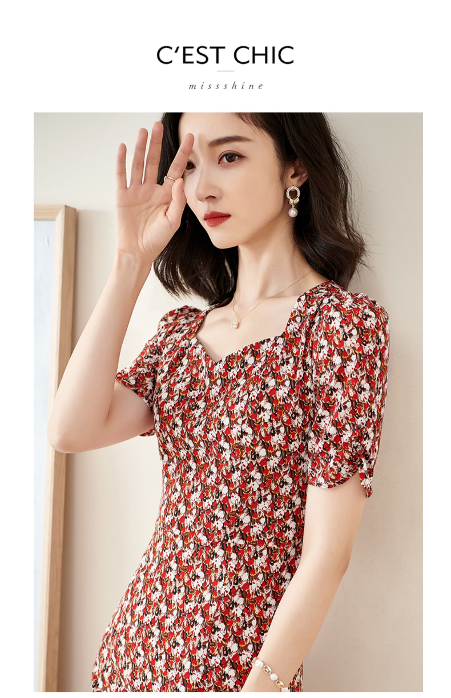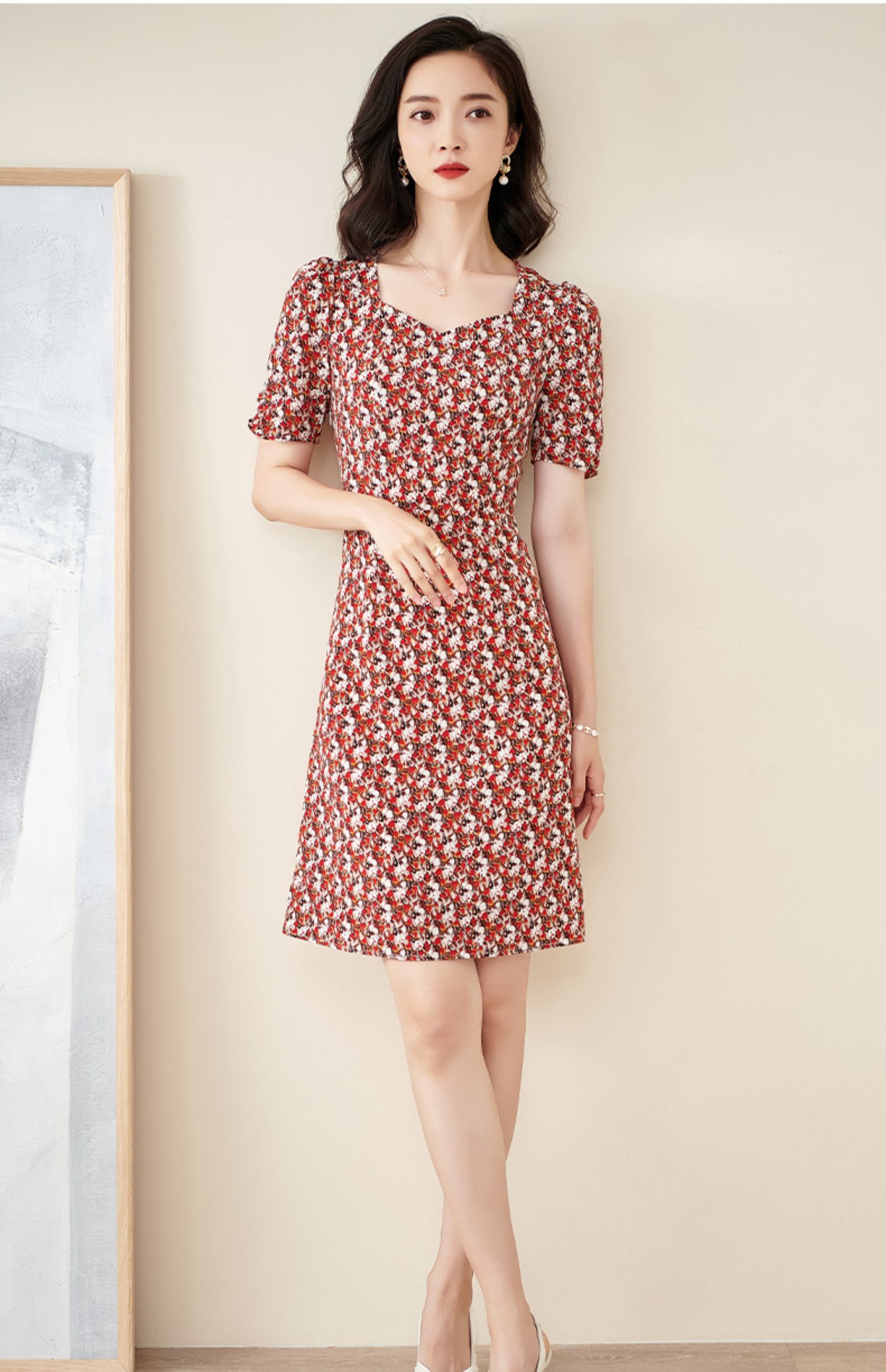 米思阳2025夏季新款法式优雅碎花中长裙修身显瘦泡泡袖连衣裙1172