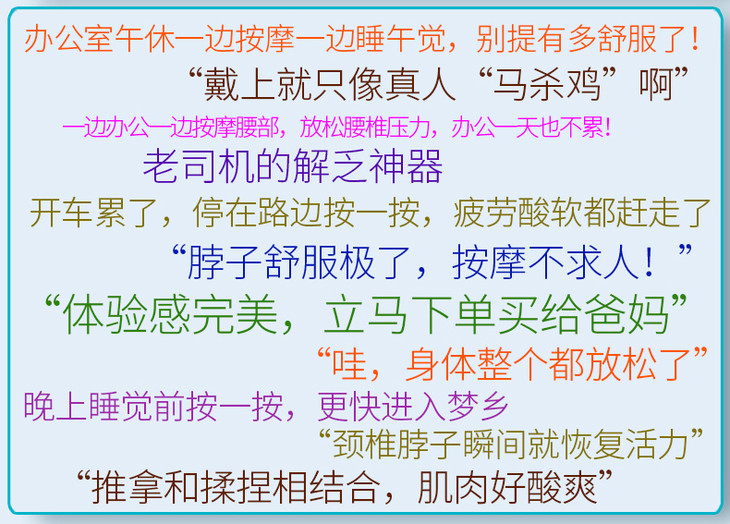 贴在脖子上360°转啊转,和真人用手揉按的感觉差不多。4个一起,别提多爽了。