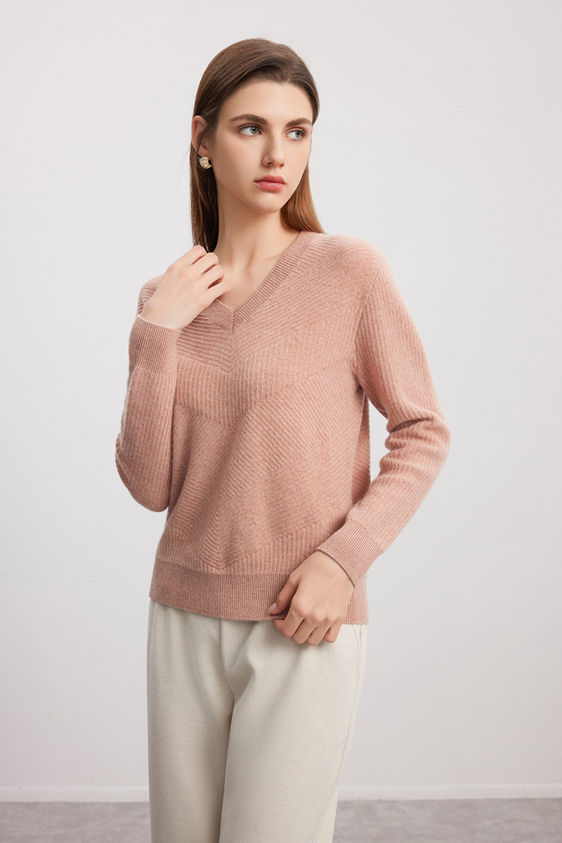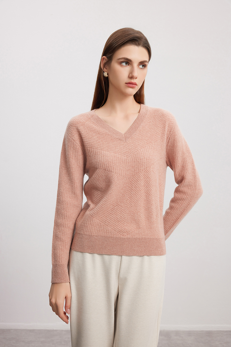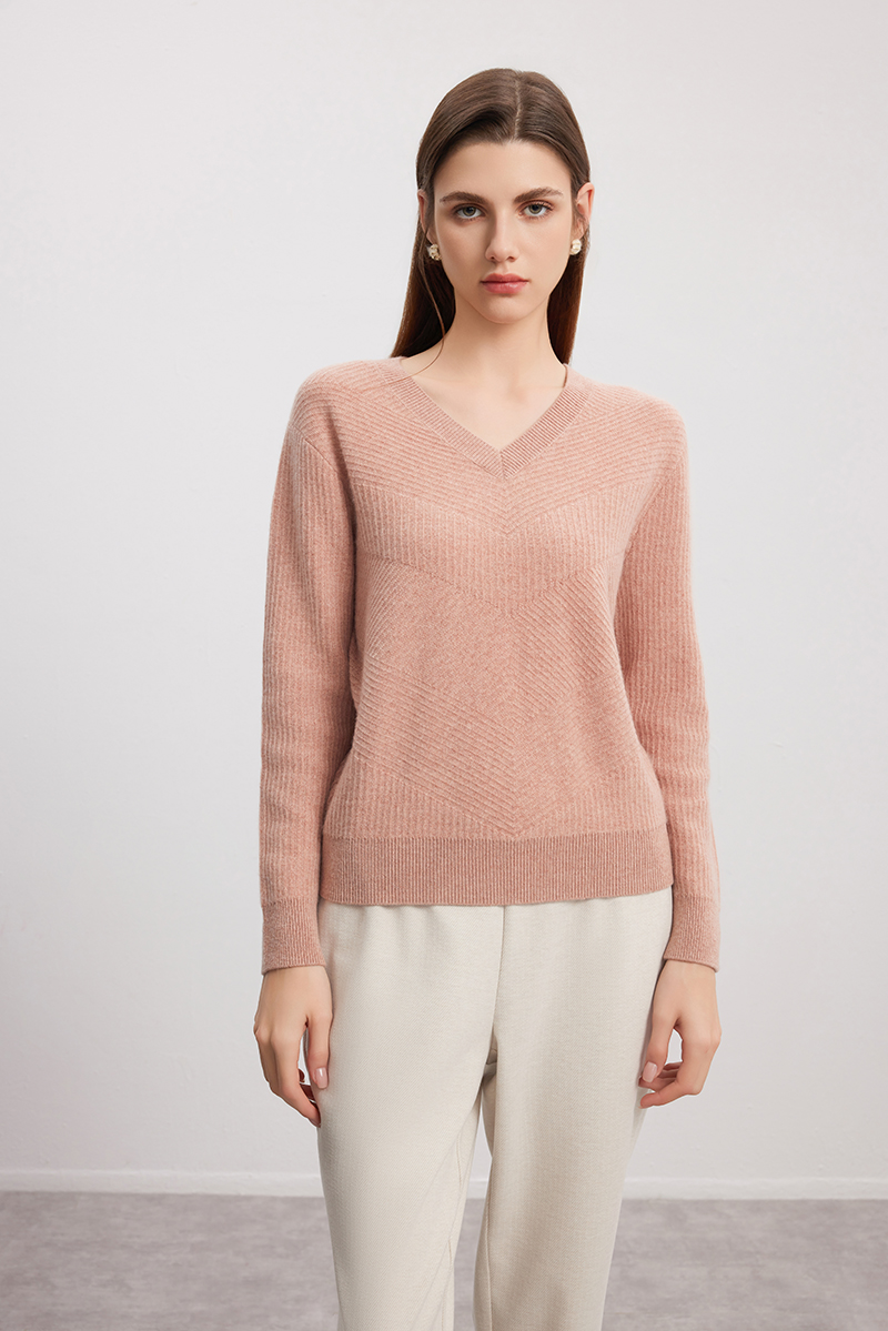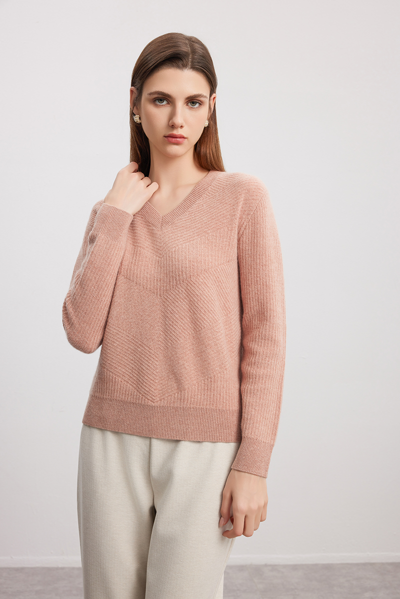 【V领立体条纹羊绒衫】羊绒世家秋冬新品女士100%山羊绒内搭保暖针织衫