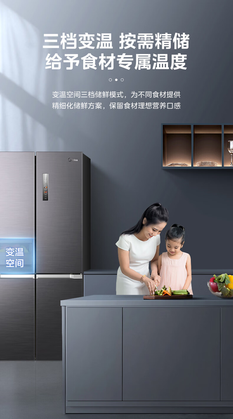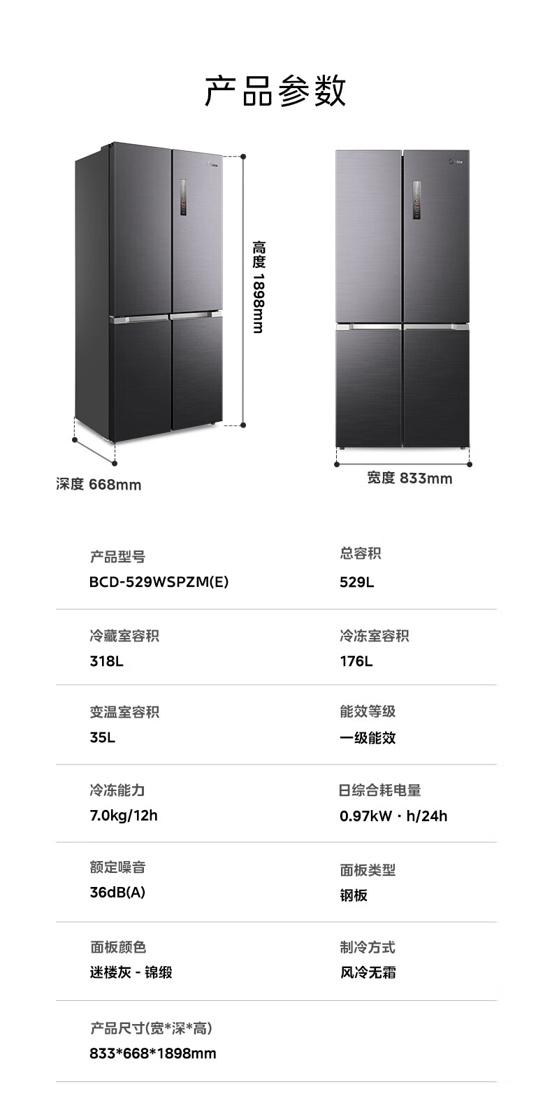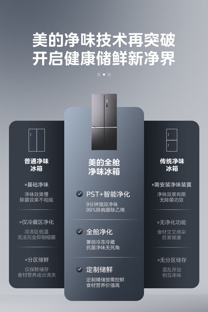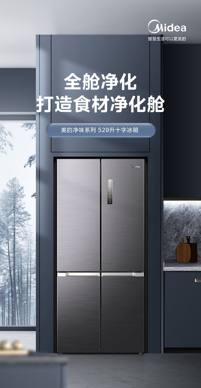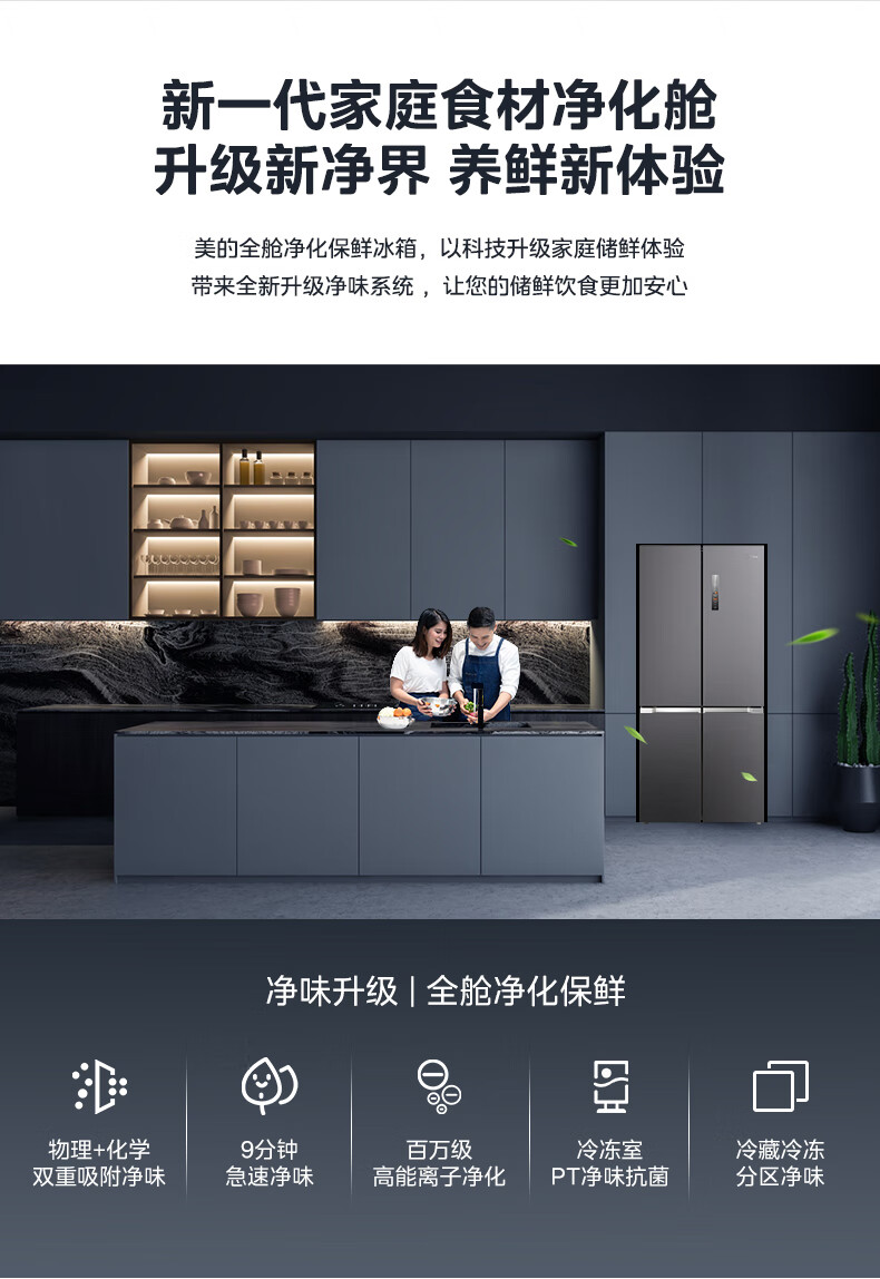 美的(Midea)9分钟急速净味529升一级能效十字对开双开门四开门家用智能电冰箱除菌BCD-529WSPZM(E)超薄大容量