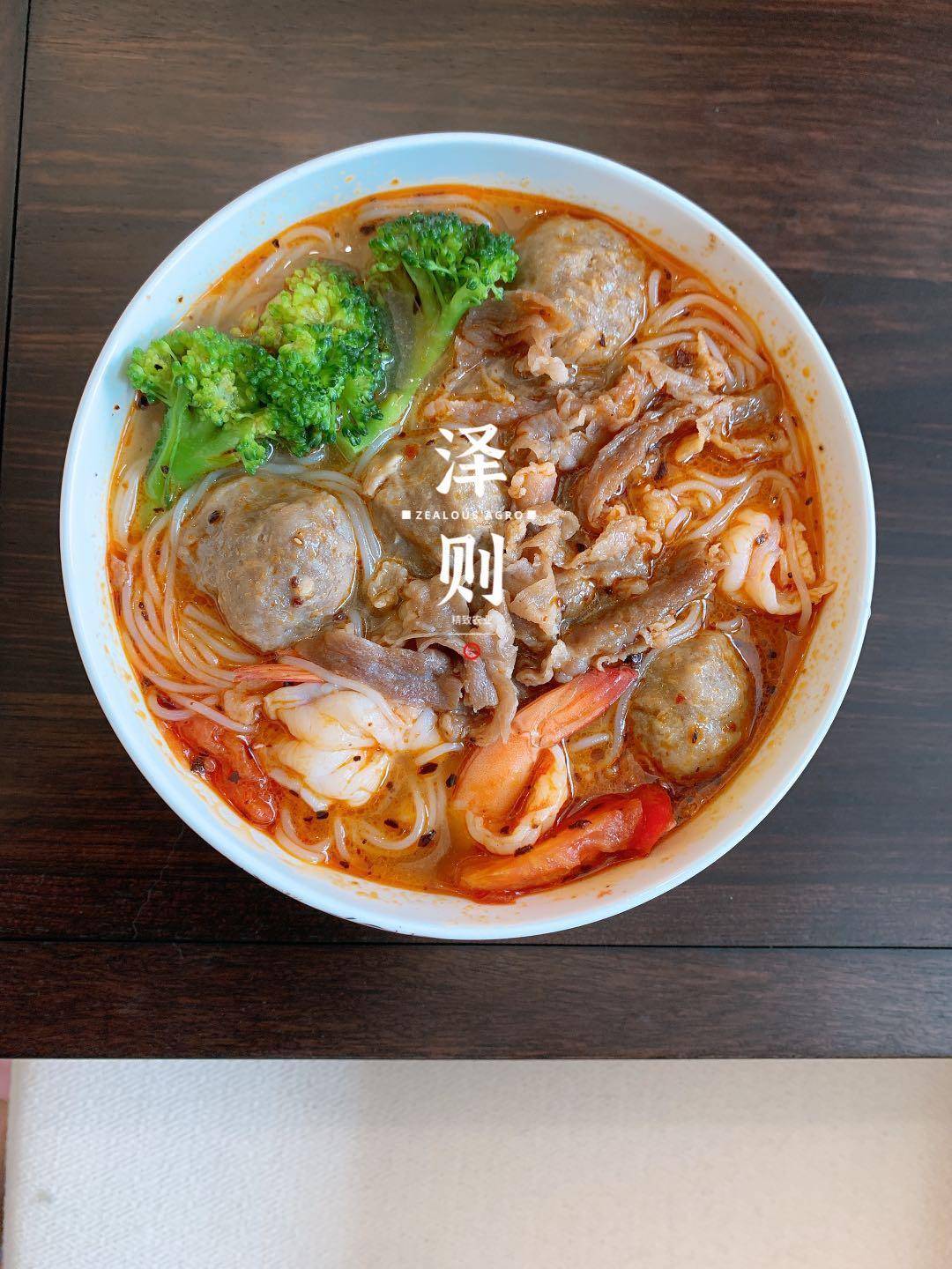 3.将煮好的米线倒入稀释后的鸡汤,根据个人口味适当加入麻辣料包后即可食用(可根据个人喜好适当加入各种蔬菜或者肉类)