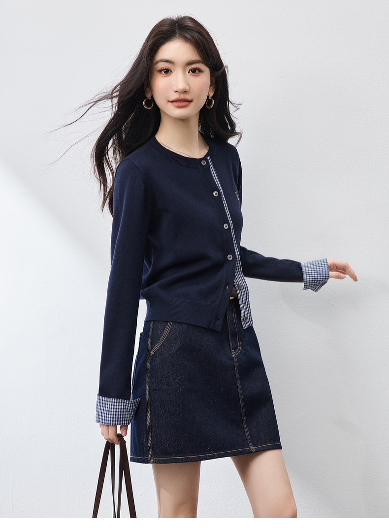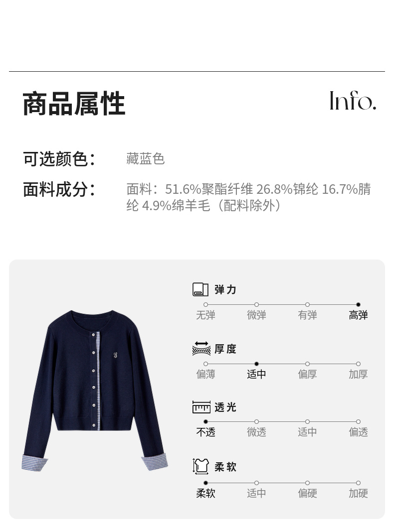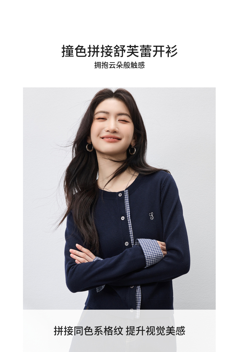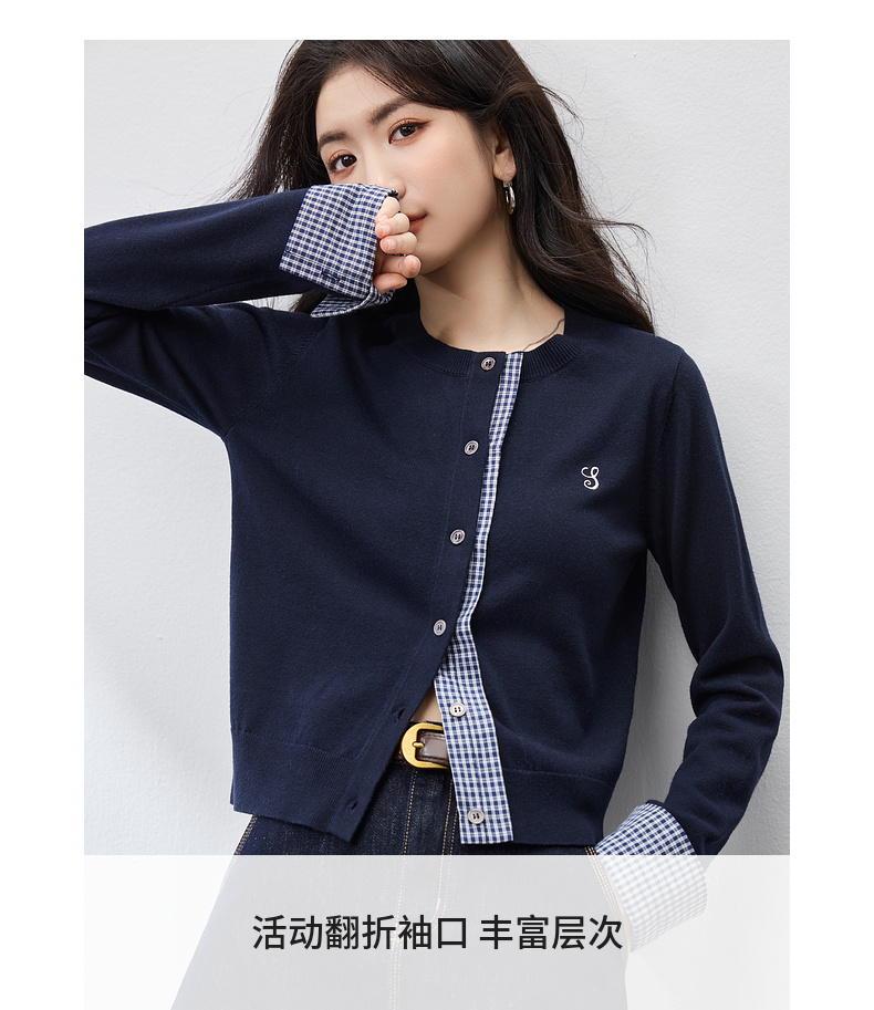 【内购】【撞色拼接】简约通勤设计感圆领同色系格纹假两件短款针织开衫-W53H80430