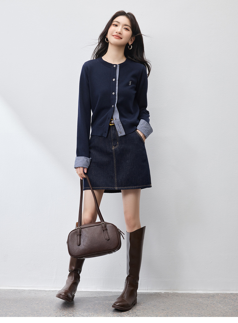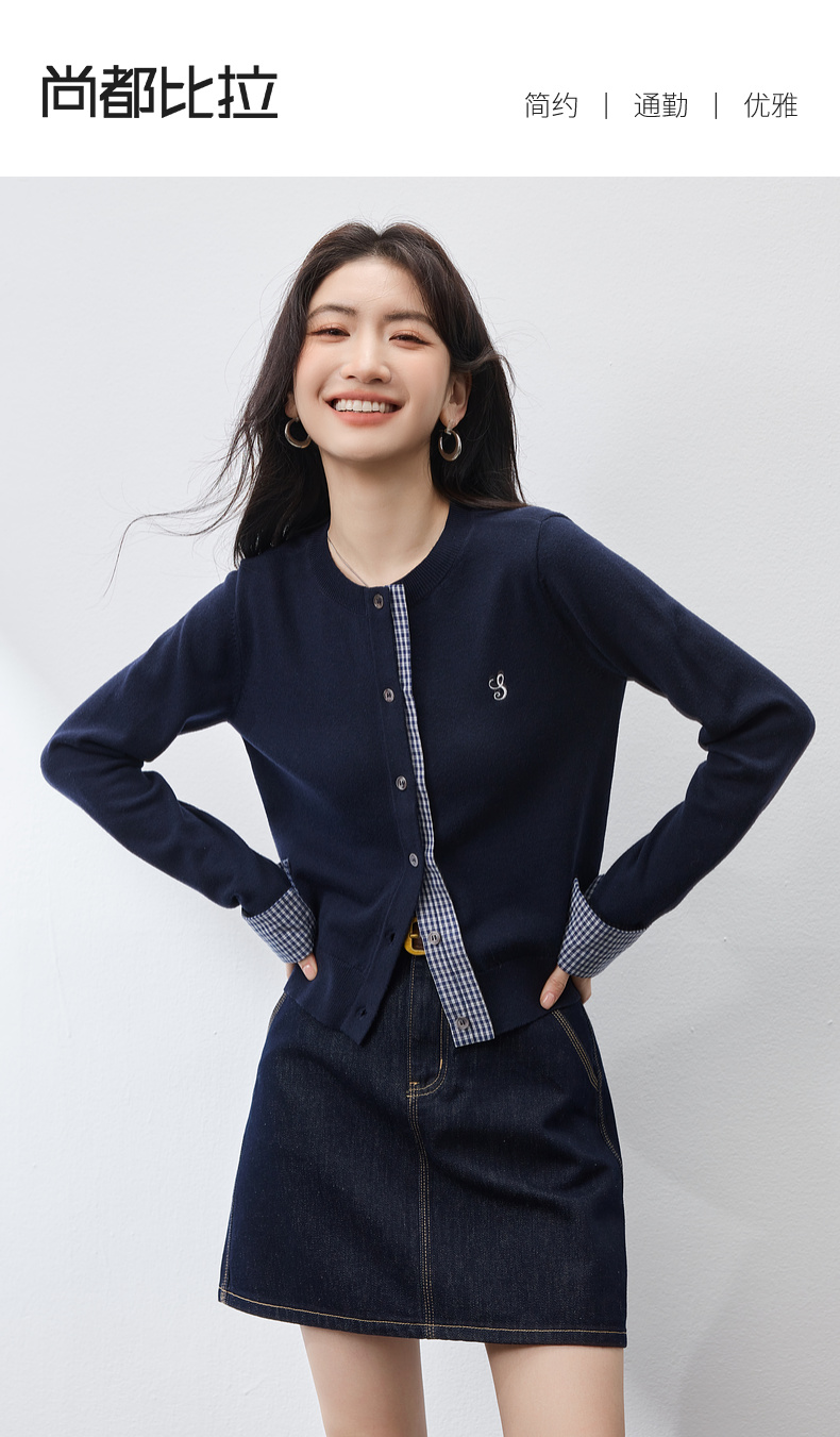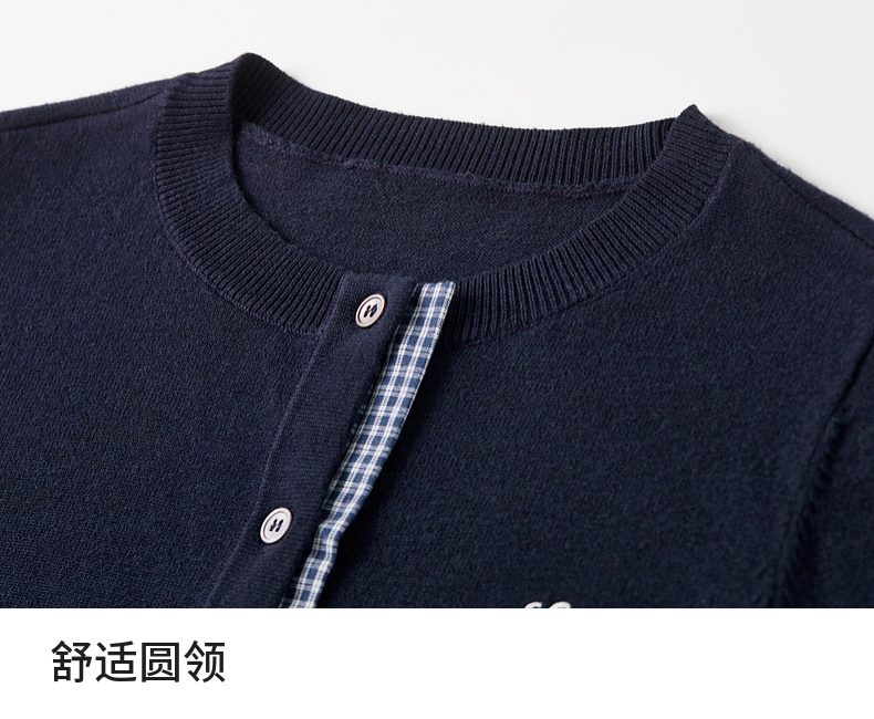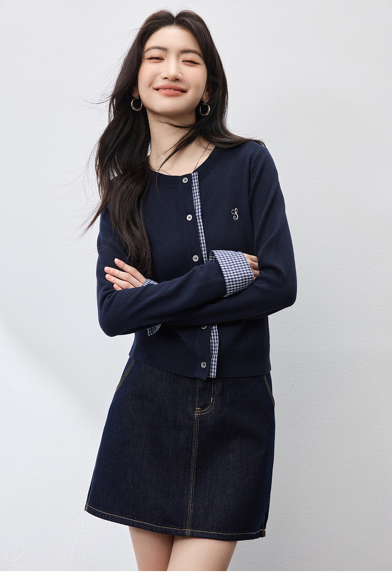 【内购】【撞色拼接】简约通勤设计感圆领同色系格纹假两件短款针织开衫-W53H80430