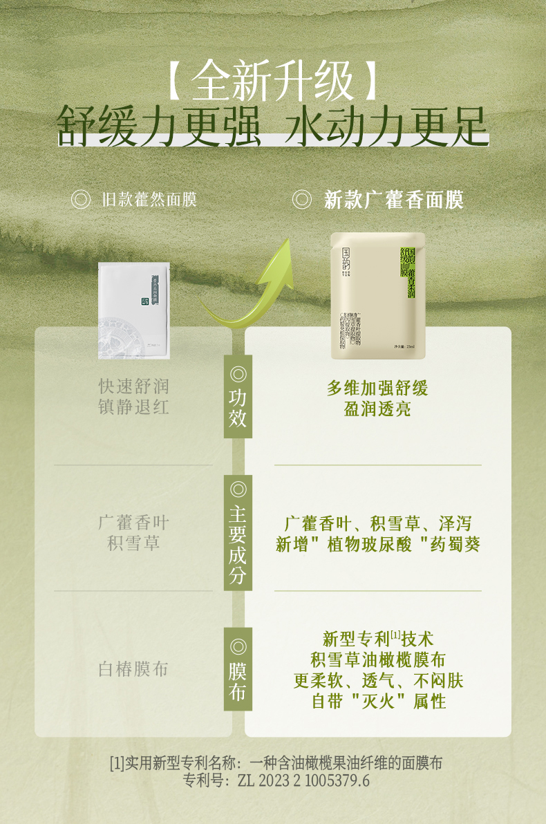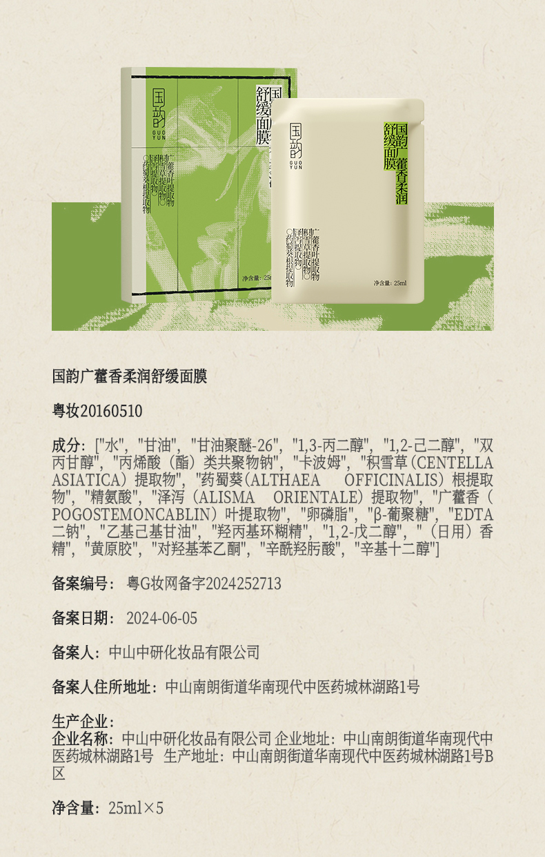国韵广藿香柔润舒缓面膜1盒(25ml*5片),多维加强舒缓,水动力更足,赠同款面膜1片@