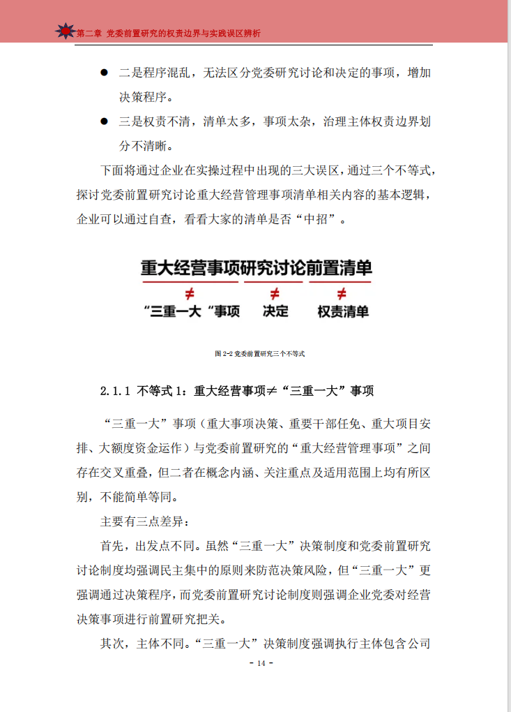 其次,通过探讨党委前置研究必须明确的“三个不等式”、剖析党委前置研究实践中常见的“四大偏差”,以及分析制定党委前置研究事项清单过程中的“五个高频问题”,明确党委前置研究的权责边界和实践误区;