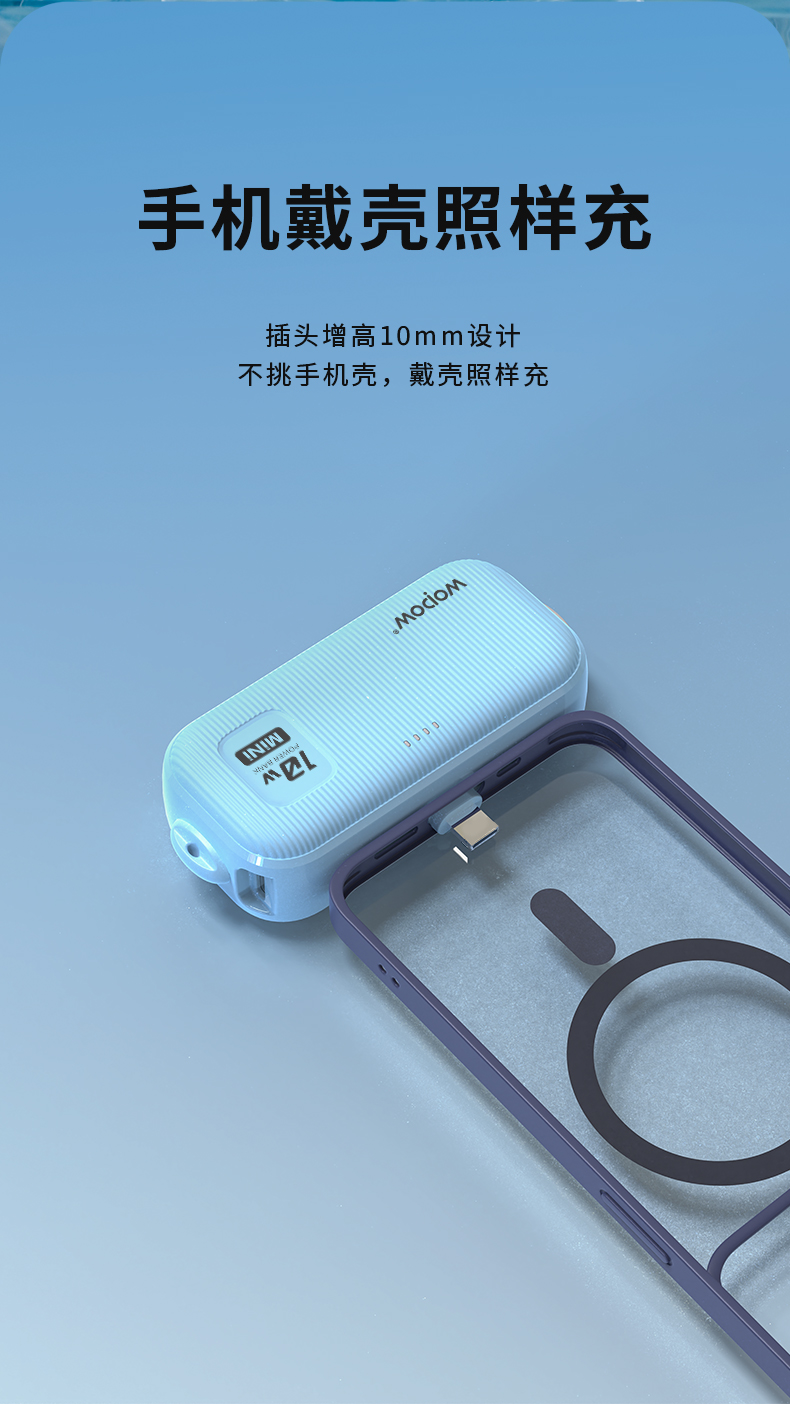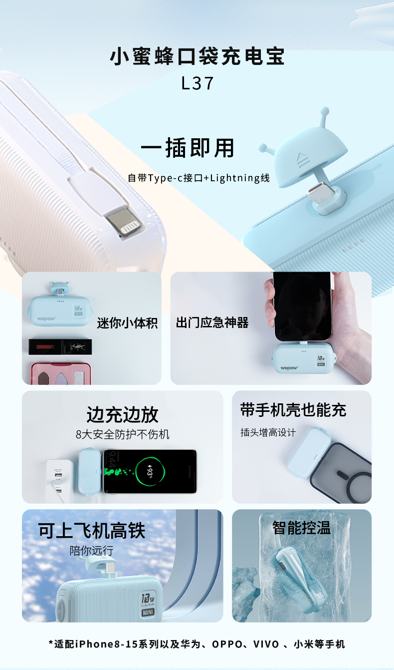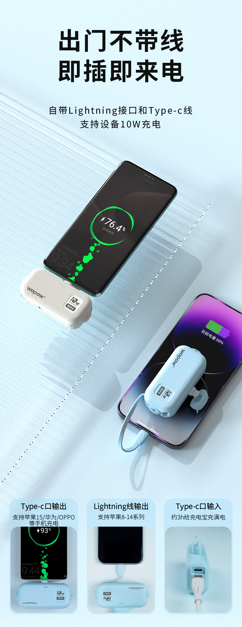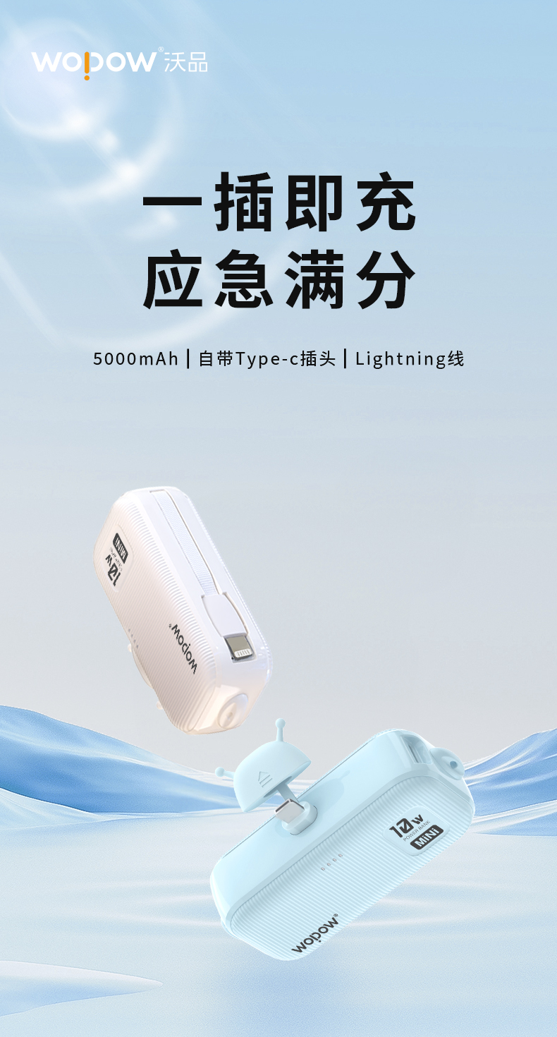 【自营】 沃品WOPOW 3C认证 小蜜蜂口袋 充电宝 自带Lightning接口 Type-c线 5000mAh 2色可选