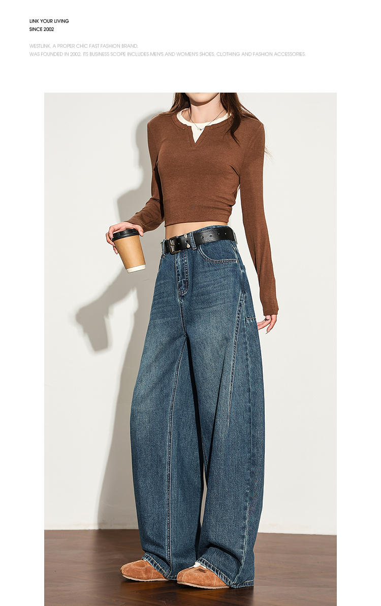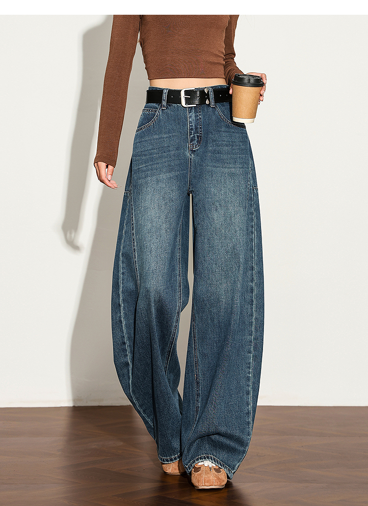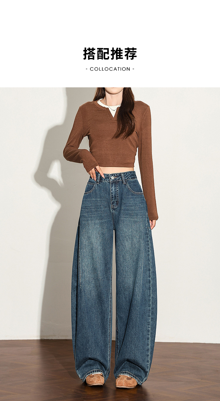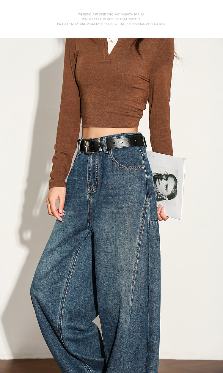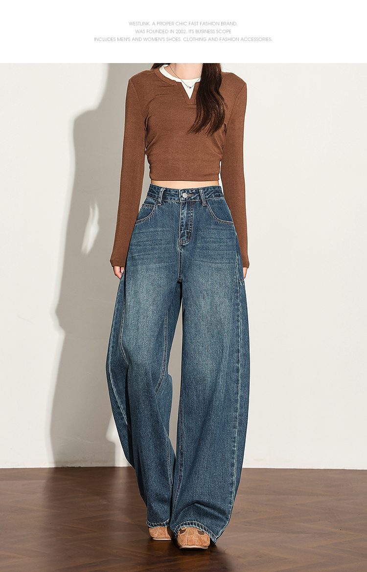 【限时秒杀】西遇复古水洗猫须阔腿牛仔裤女秋季高腰显瘦百搭宽松弯刀裤H0051300