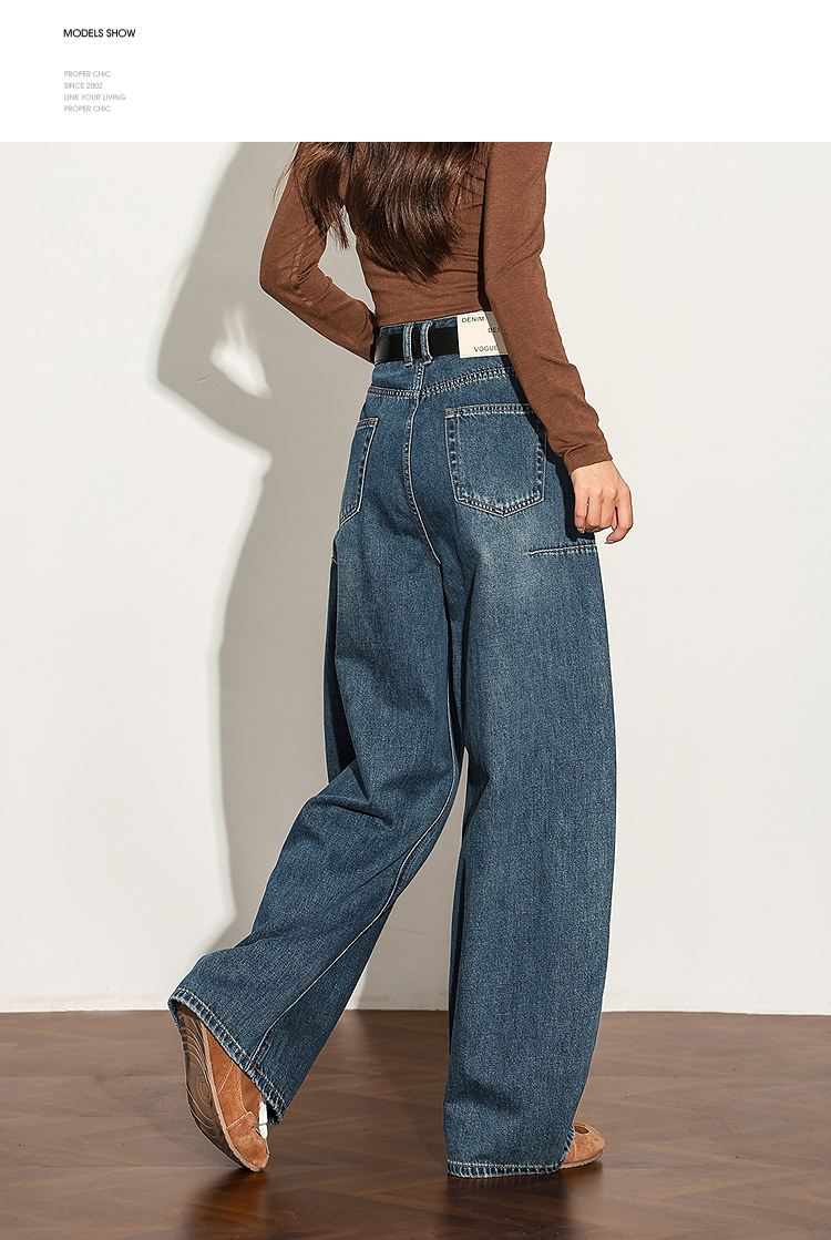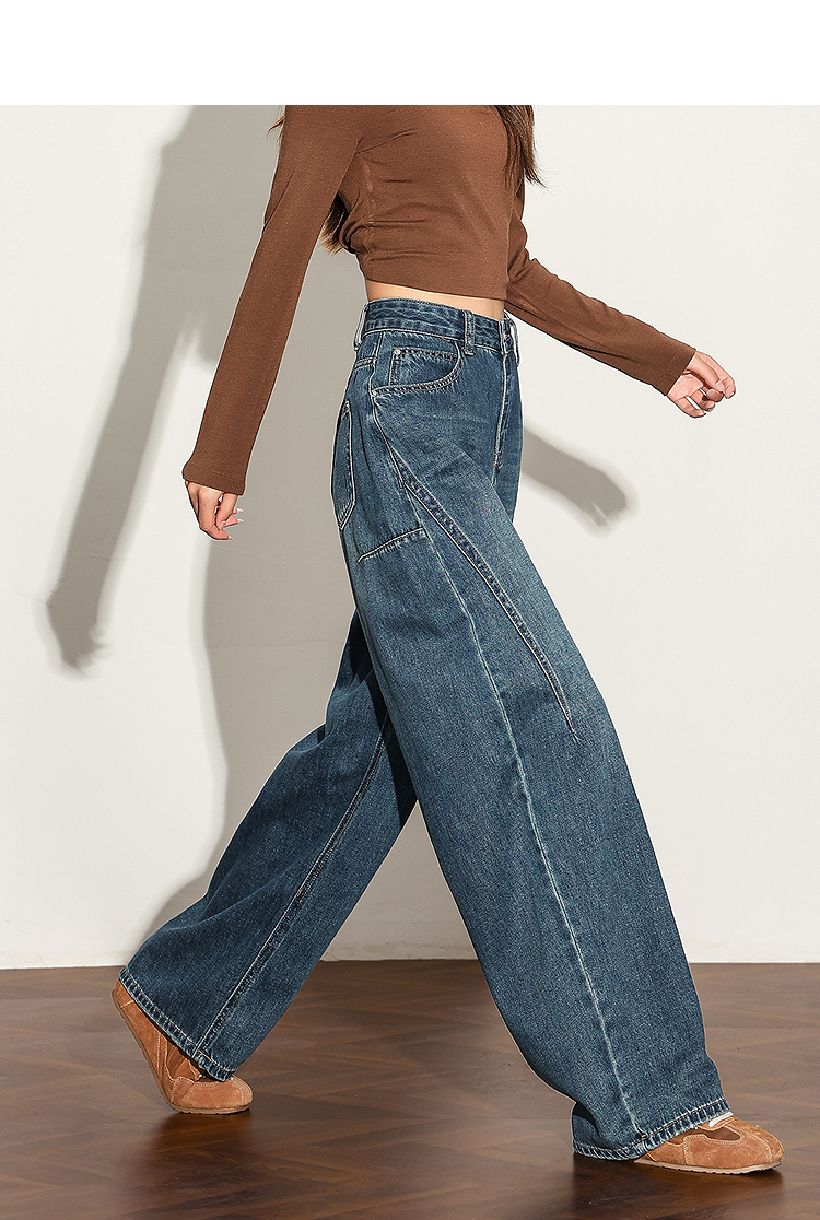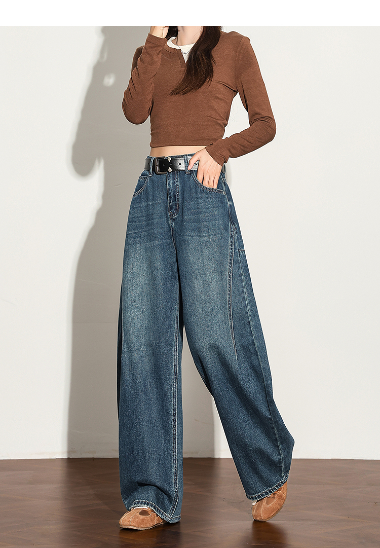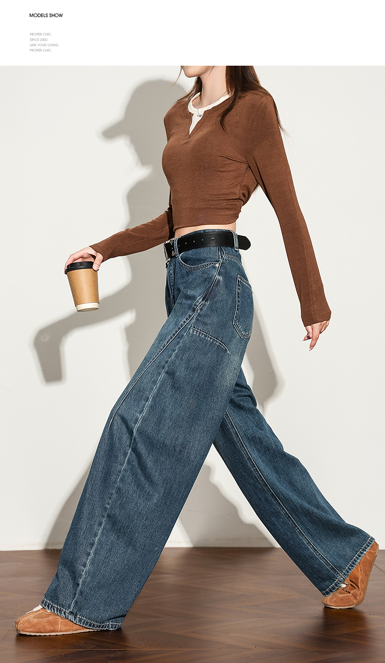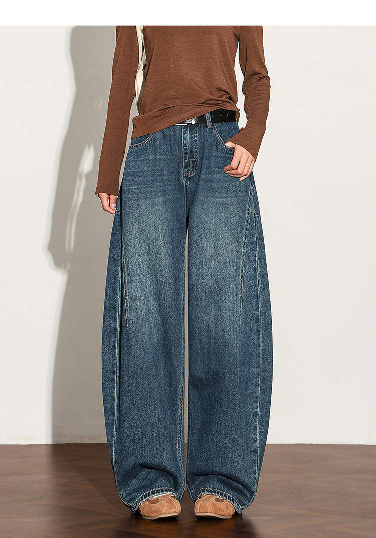 【限时秒杀】西遇复古水洗猫须阔腿牛仔裤女秋季高腰显瘦百搭宽松弯刀裤H0051300