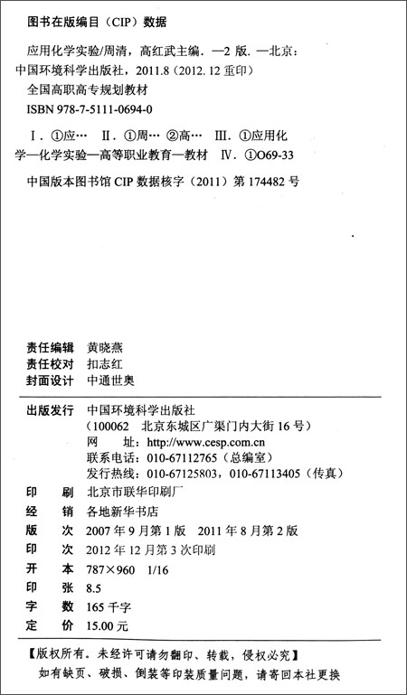 《教育部高等学校高职高专环保与气象类专业教学指导委员会推荐教材·全国高职高专规划教材:应用化学实验(第二版)》由中国环境科学出版社出版。