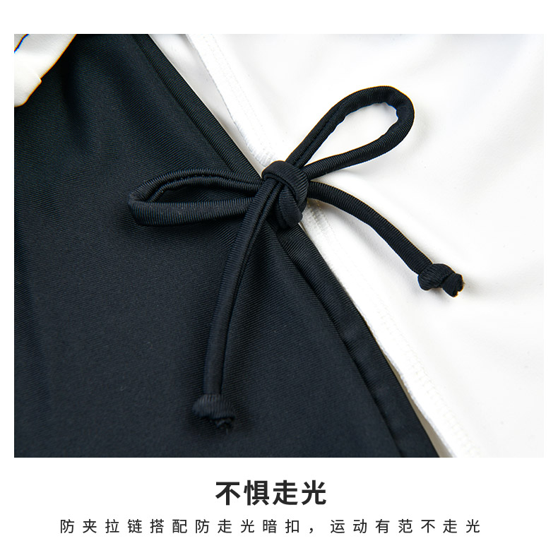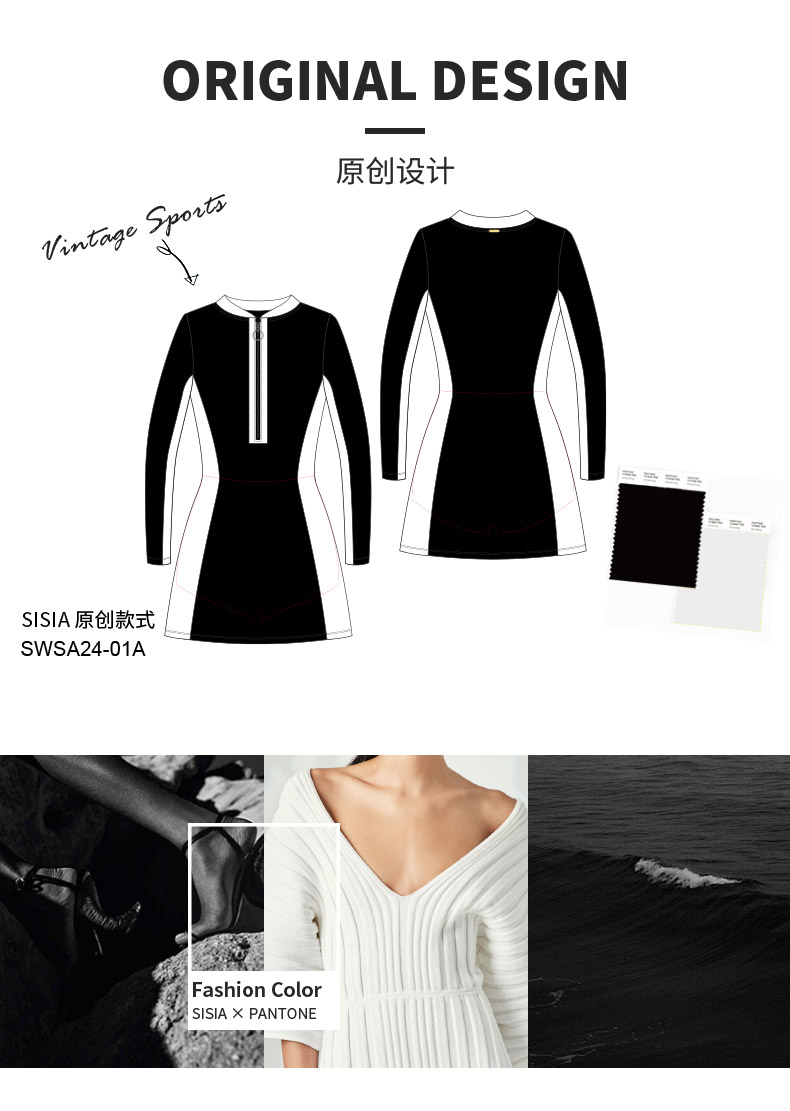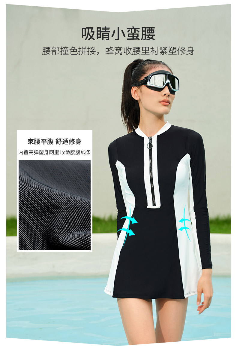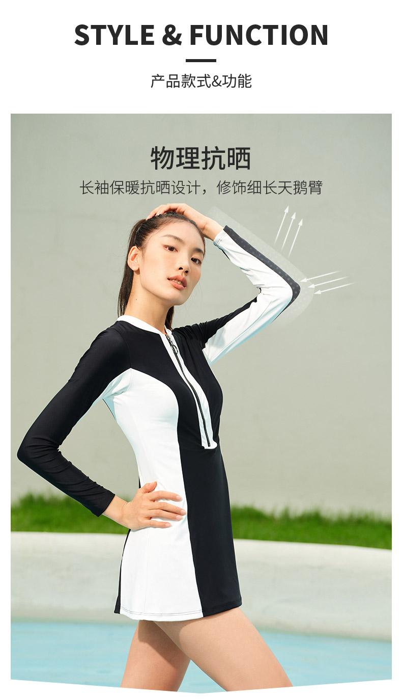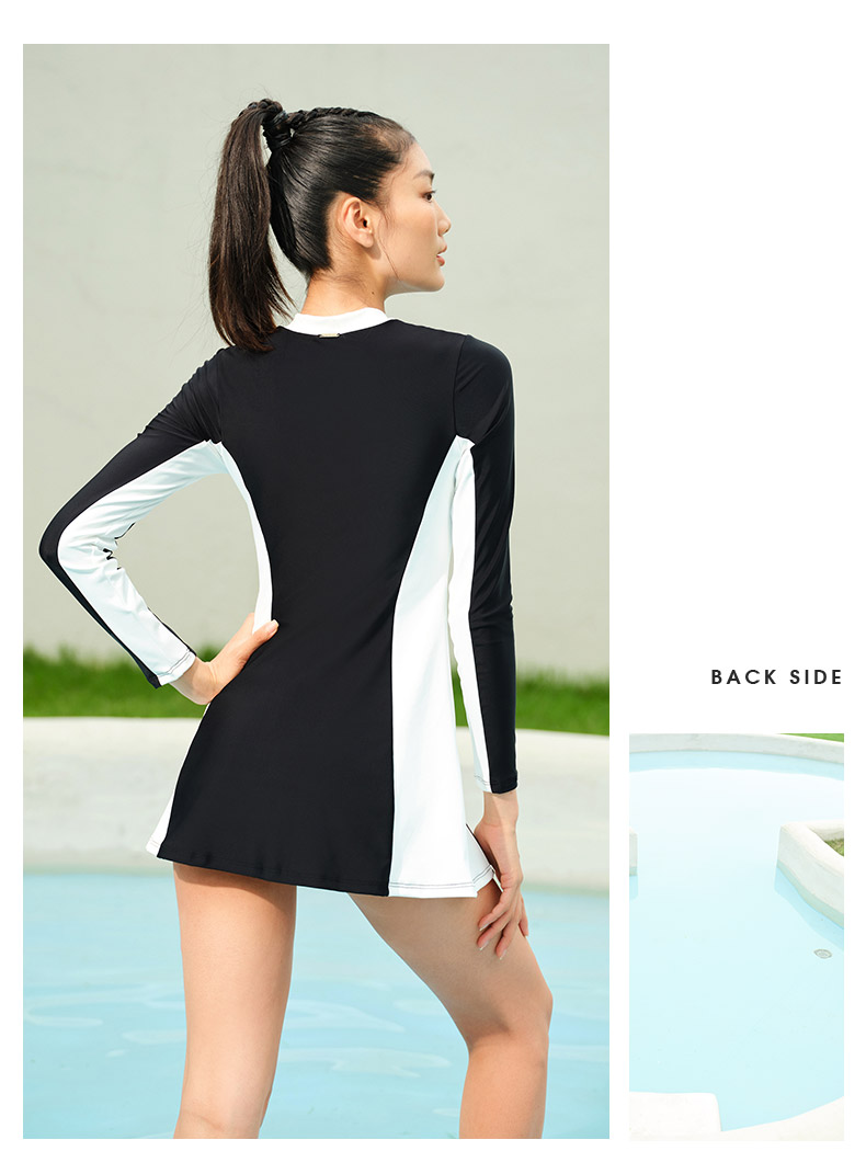 sisia2024新款泳衣女黑白撞色长袖防晒显瘦遮肚温泉连体裙式泳衣SWSA24-01A