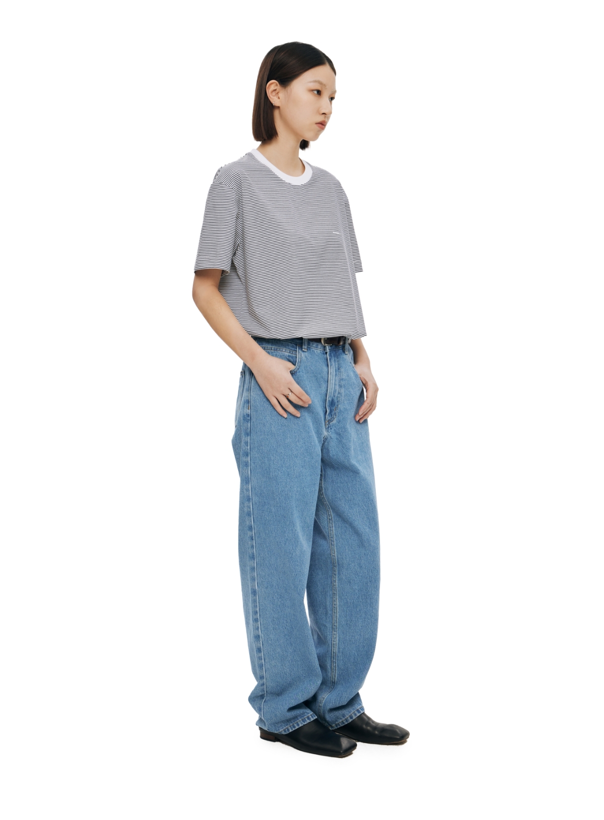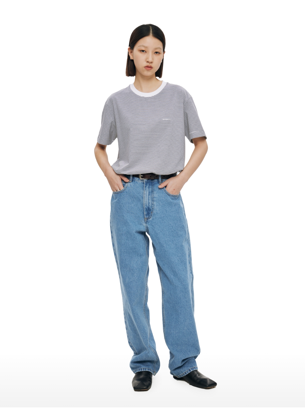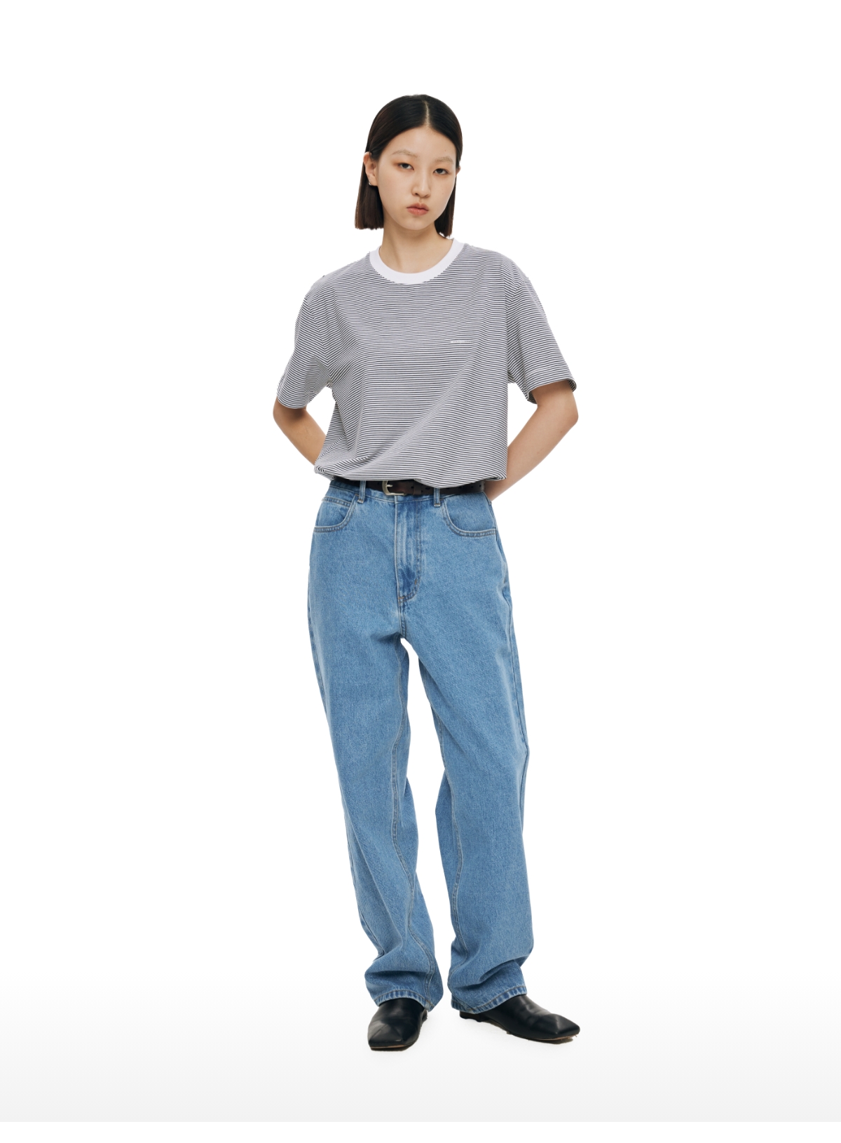 复古水洗蓝高腰直筒牛仔裤