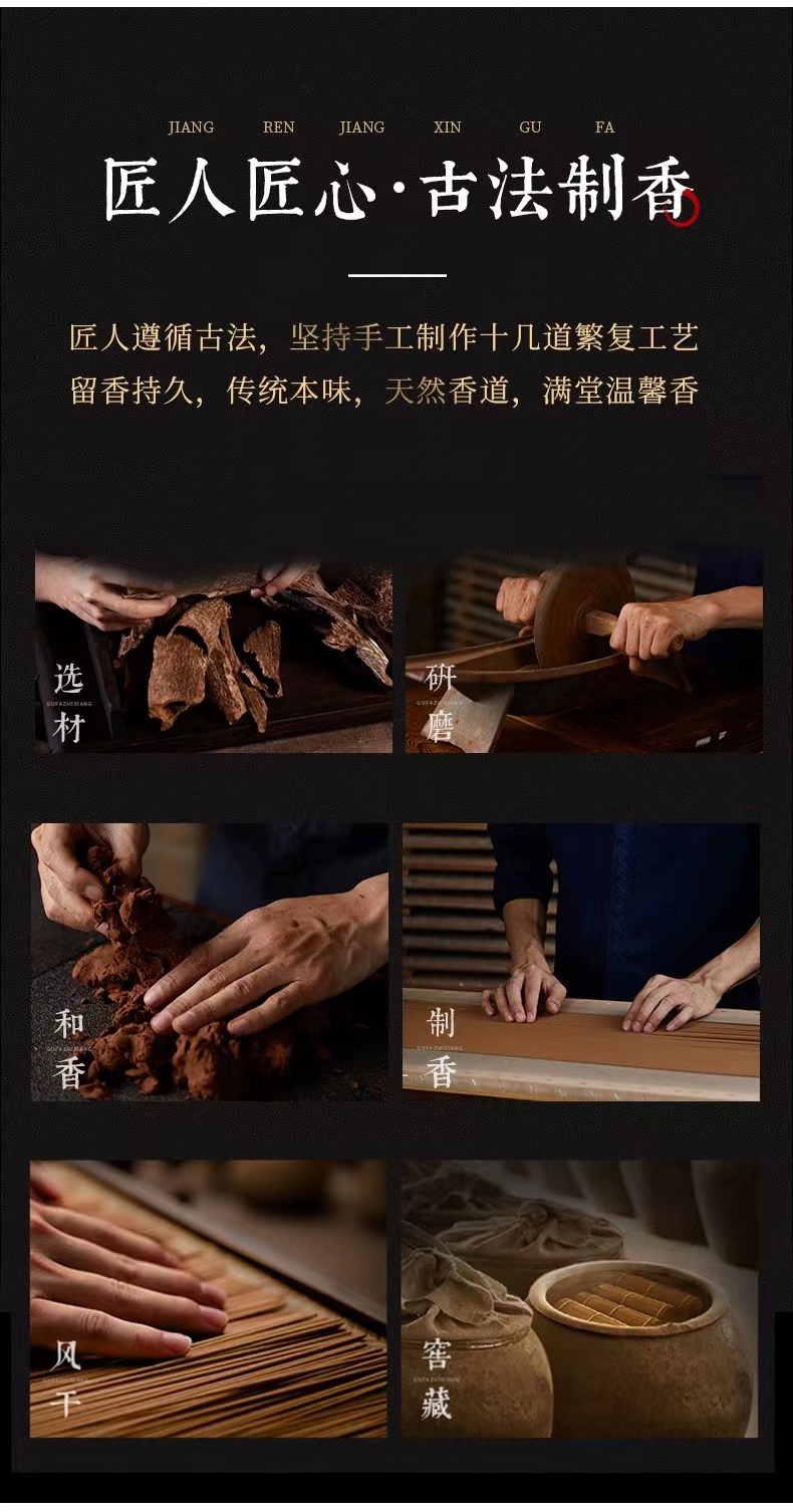 本品采用纯天然沉香木研磨成粉,参照传统制香秘方精心配制而成,绝不添加任何化学香精等染料,做工如法,成品精细,闻之清新淡雅,略带微凉,香气持久。