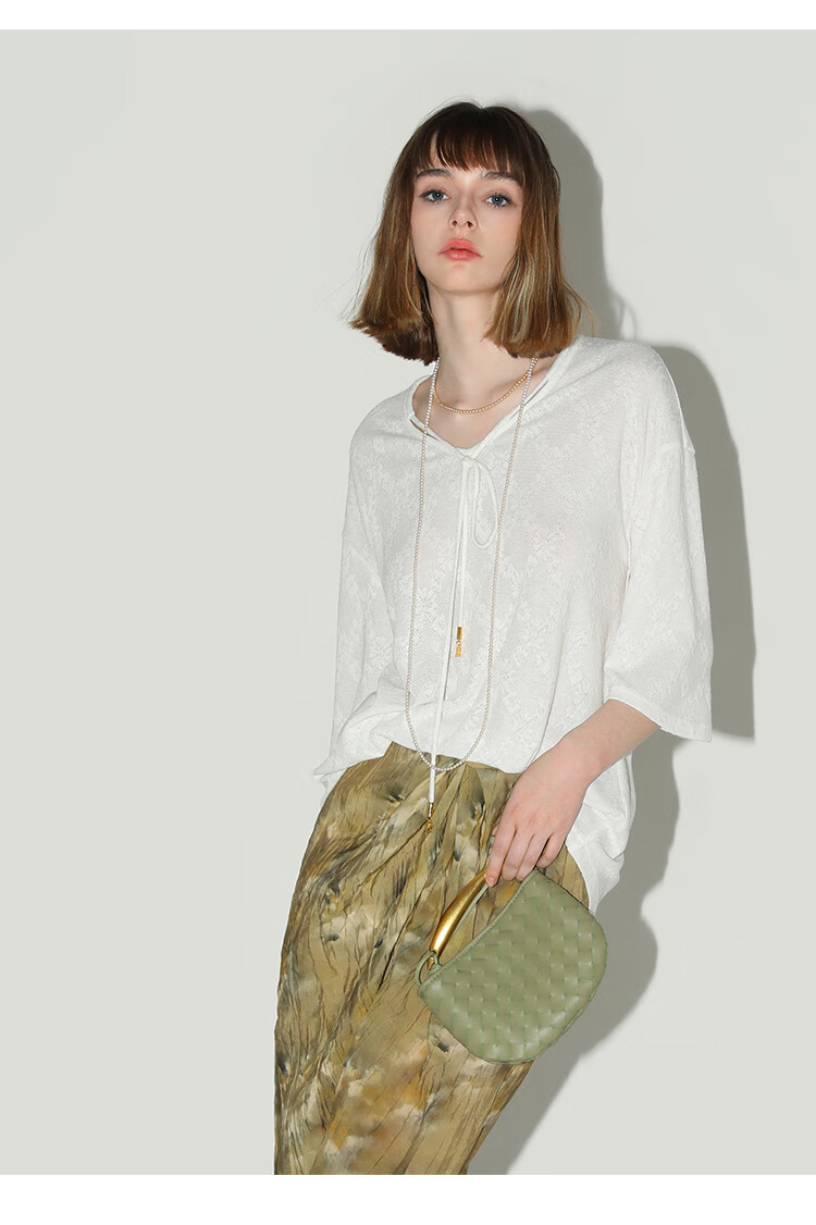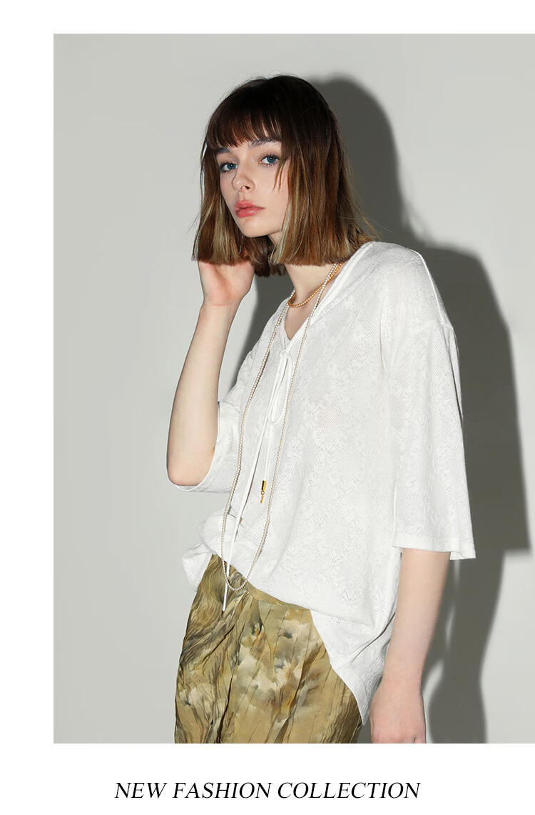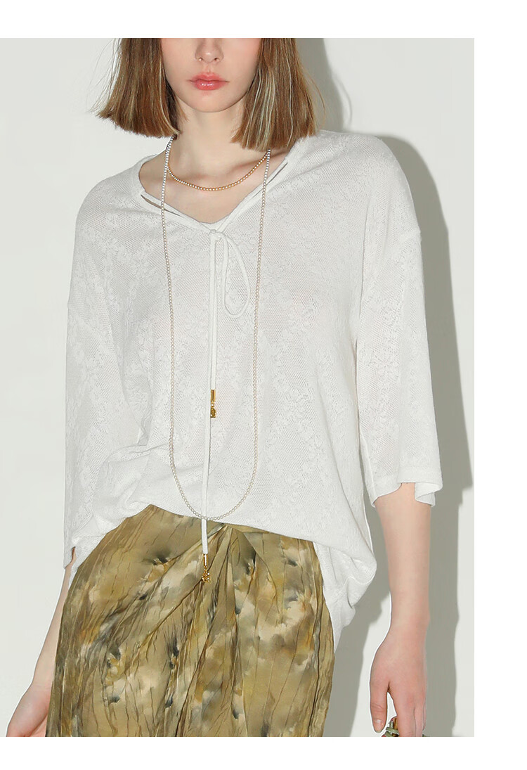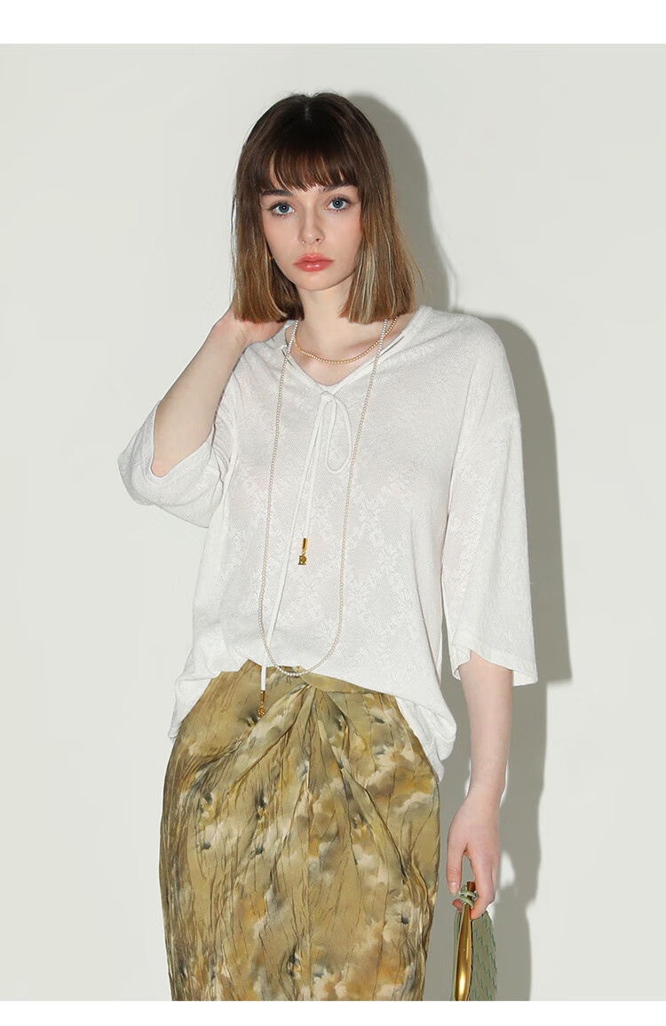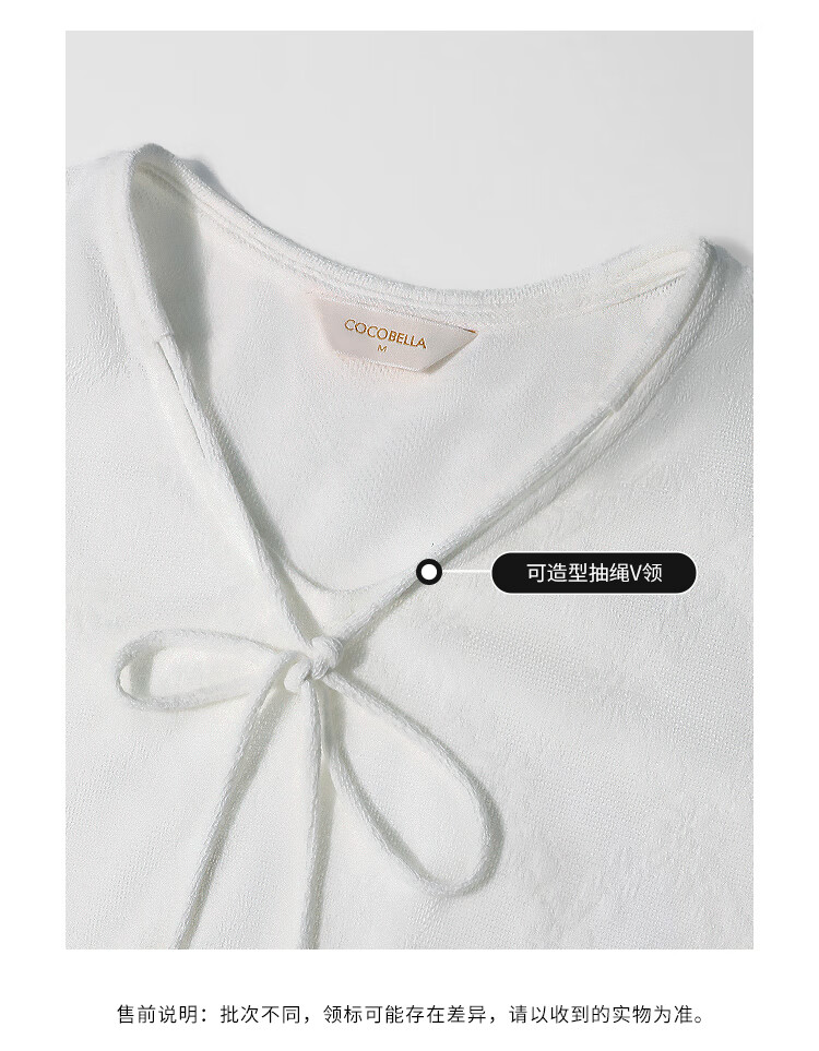 COCOBELLA镂空提花V领系带五分袖针织衫宽松蝙蝠袖上衣TS3002B