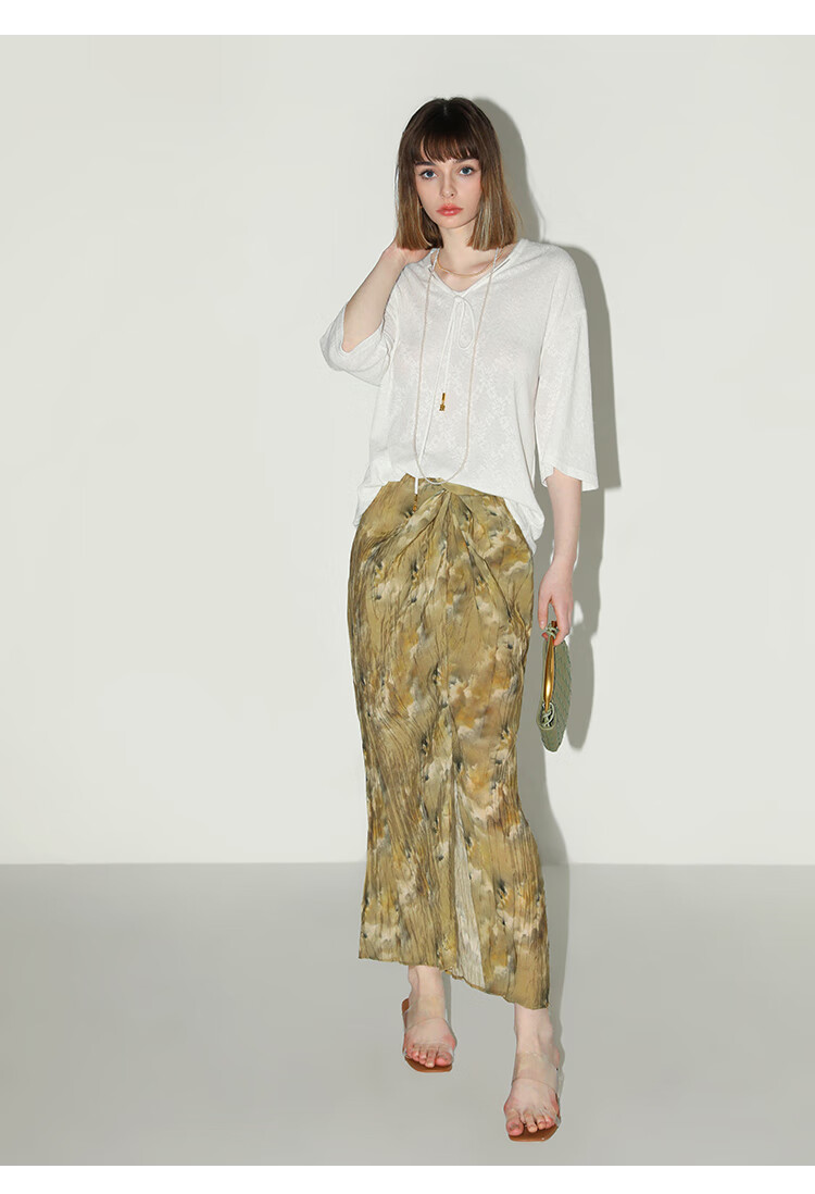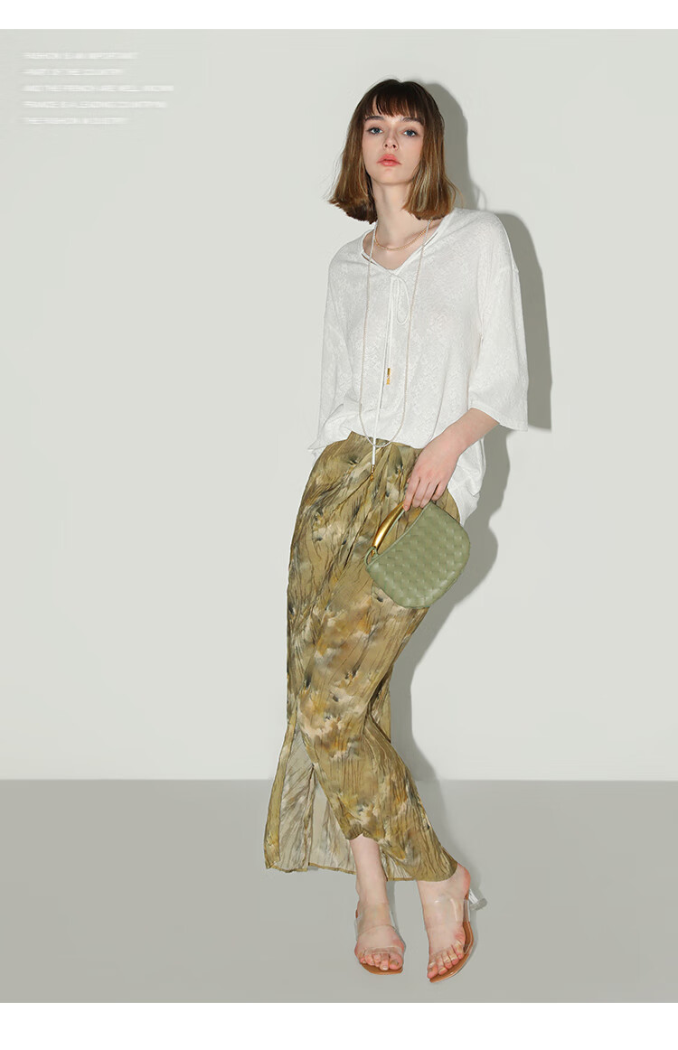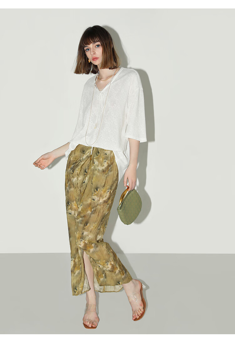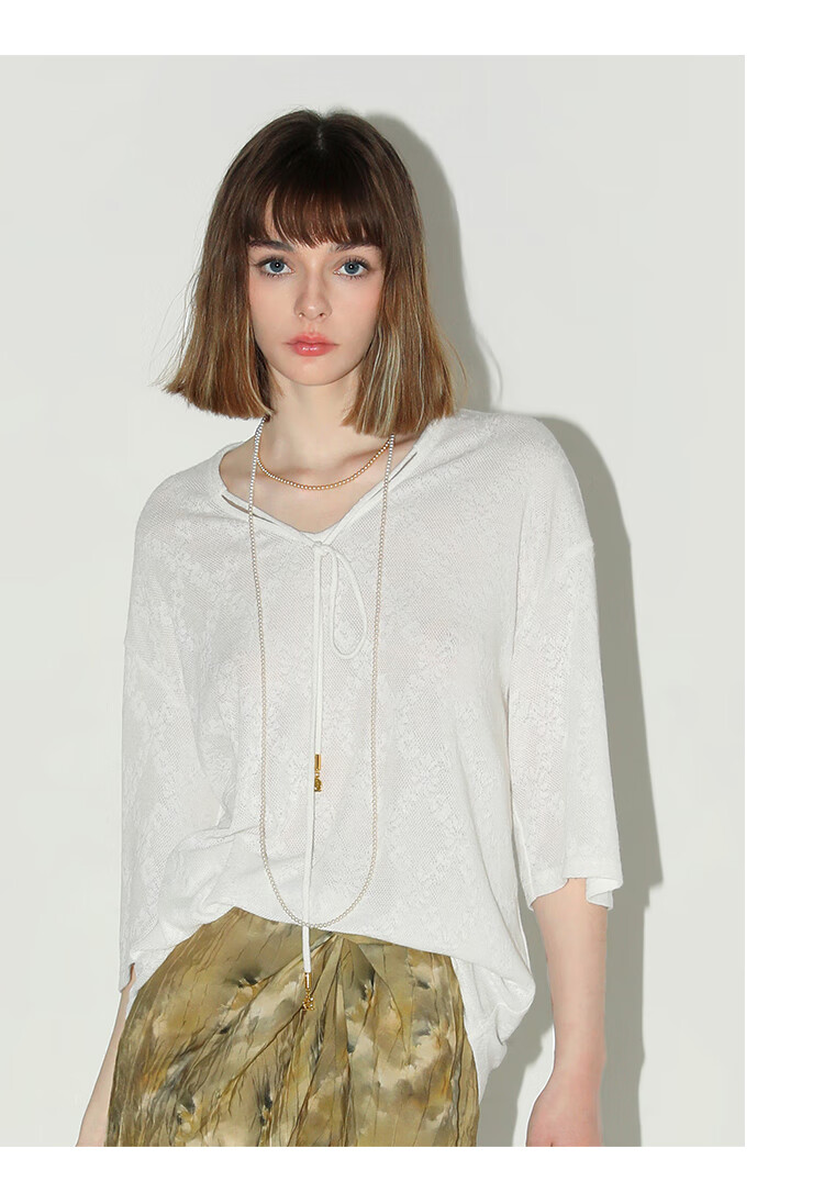 COCOBELLA镂空提花V领系带五分袖针织衫宽松蝙蝠袖上衣TS3002B