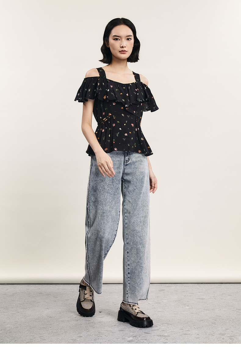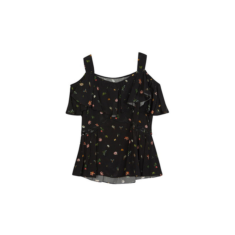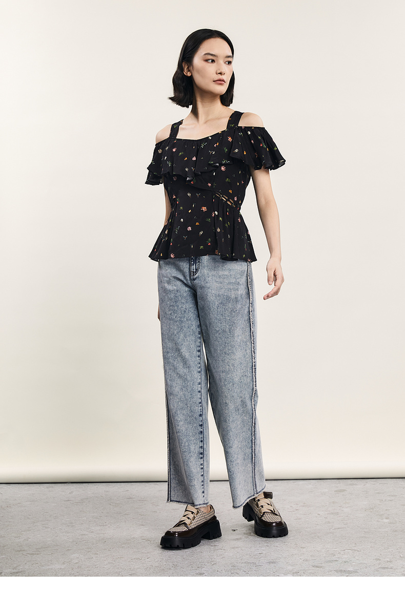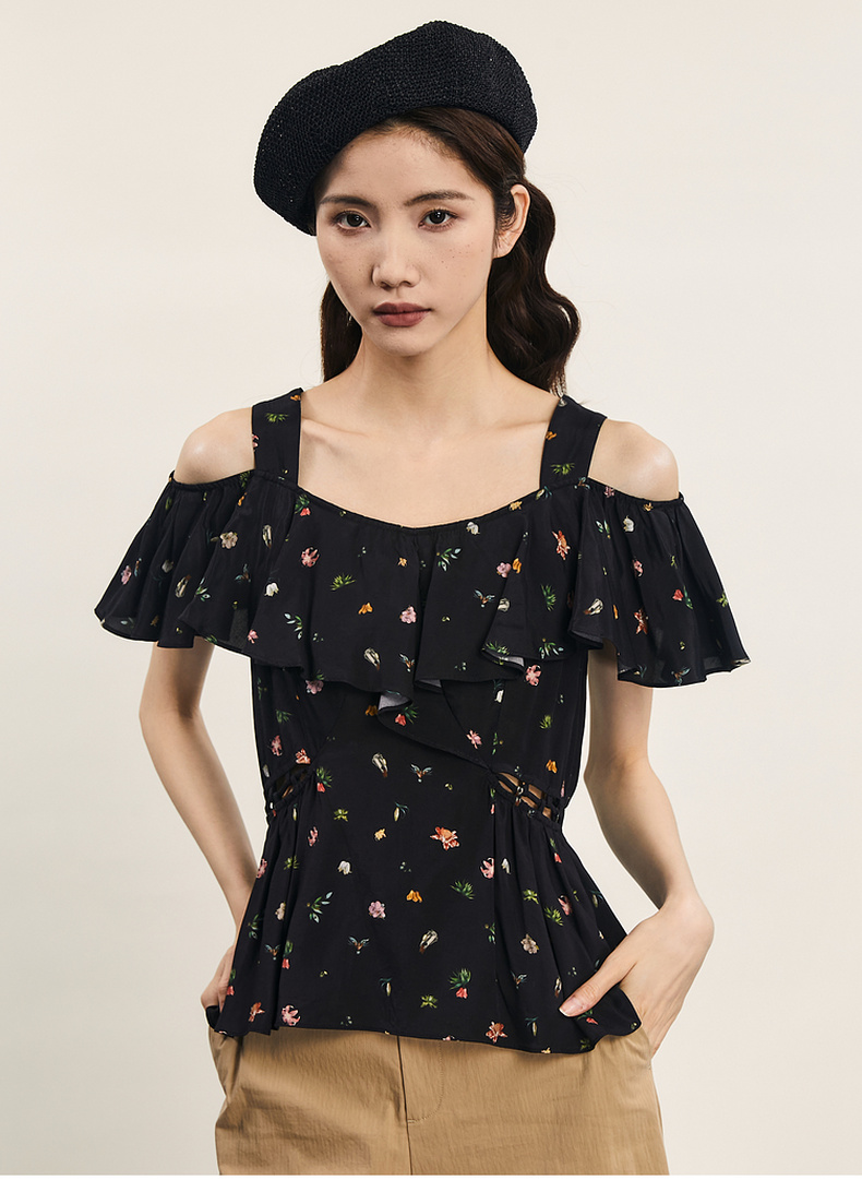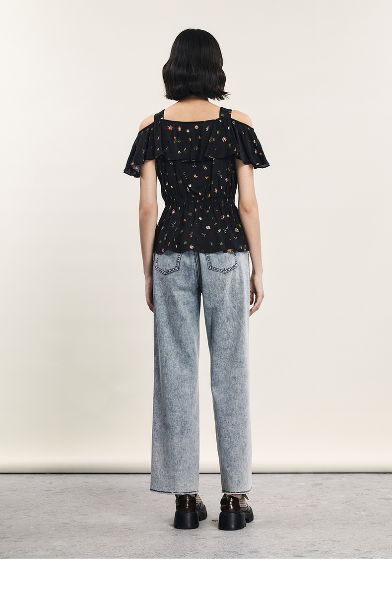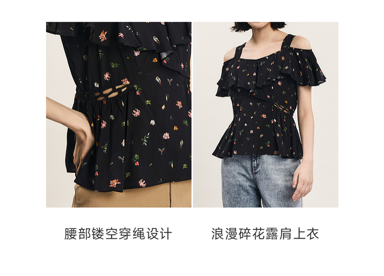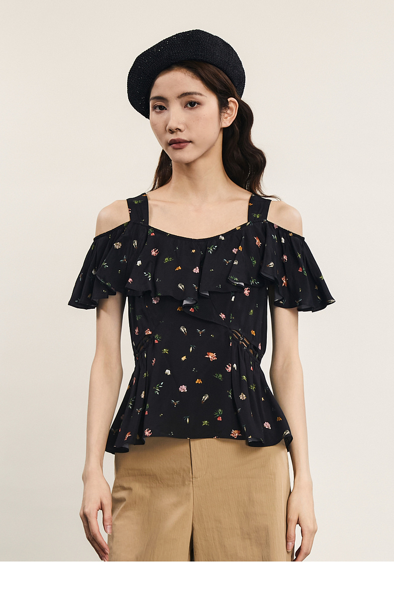 谜底露肩修身上衣短袖女2024夏季新品优雅浪漫碎花小衫242MS0717