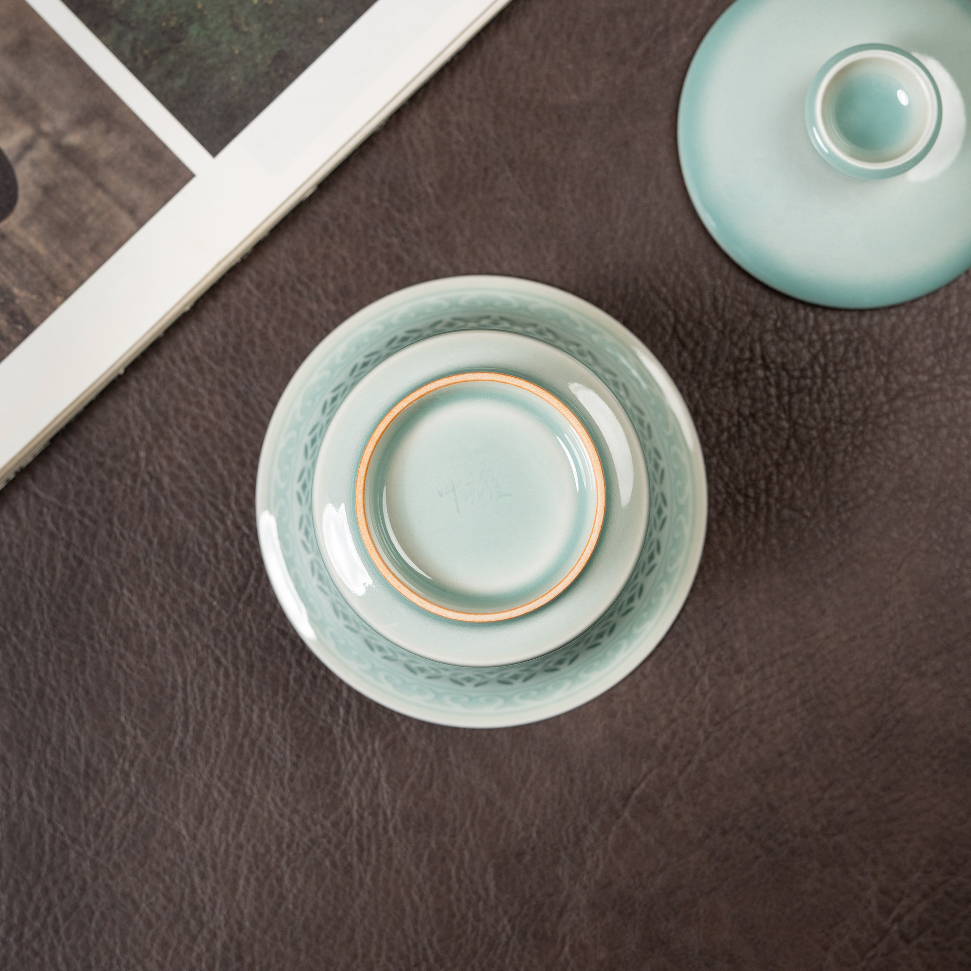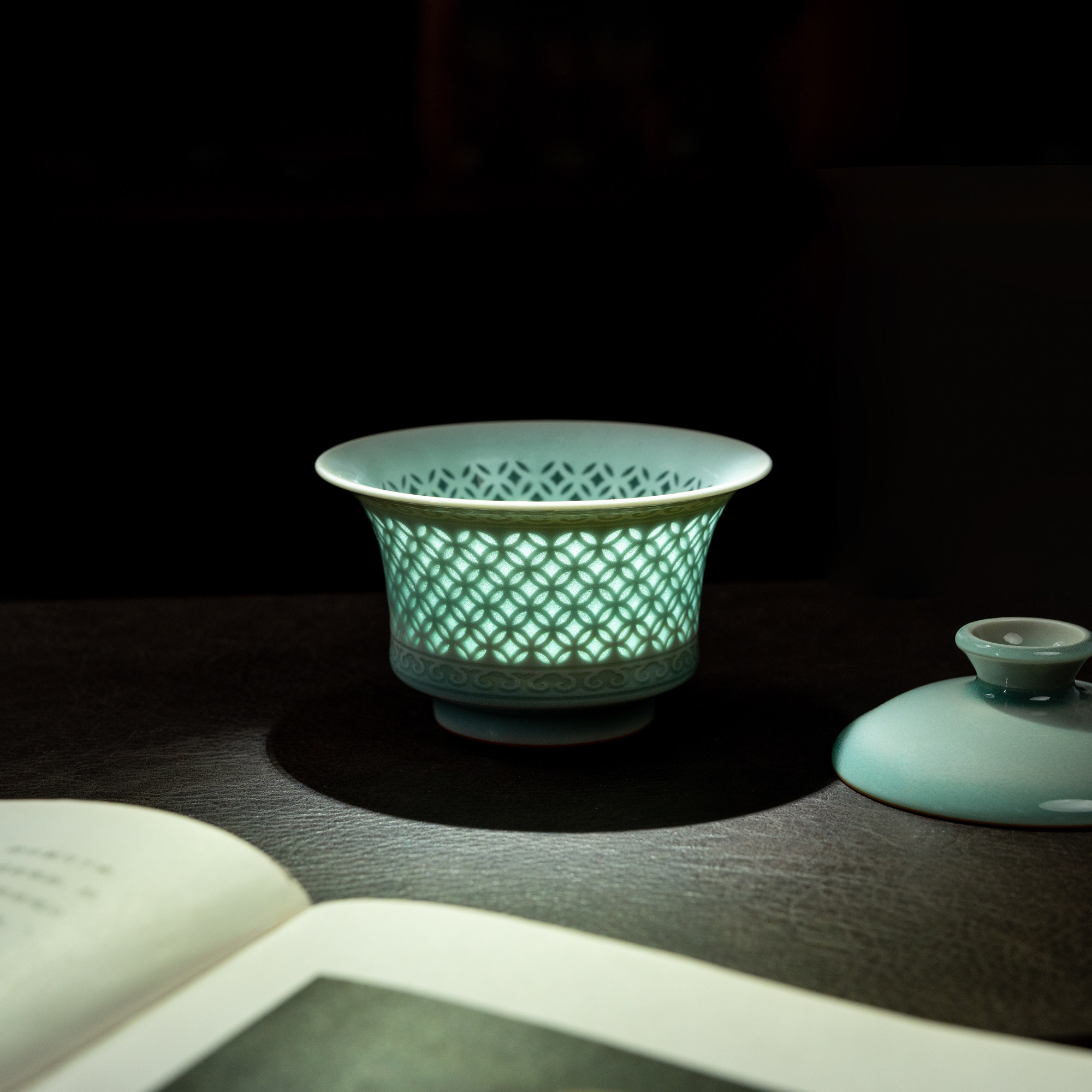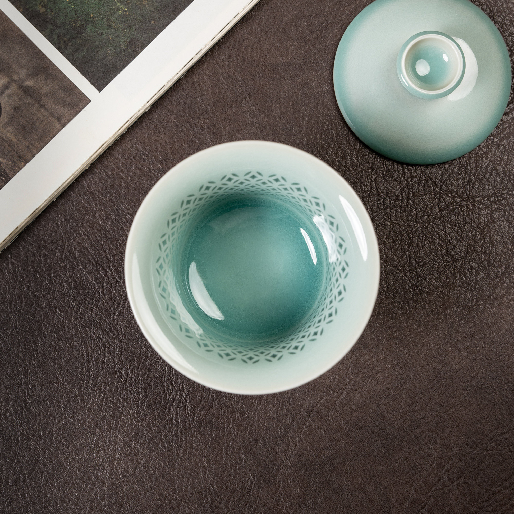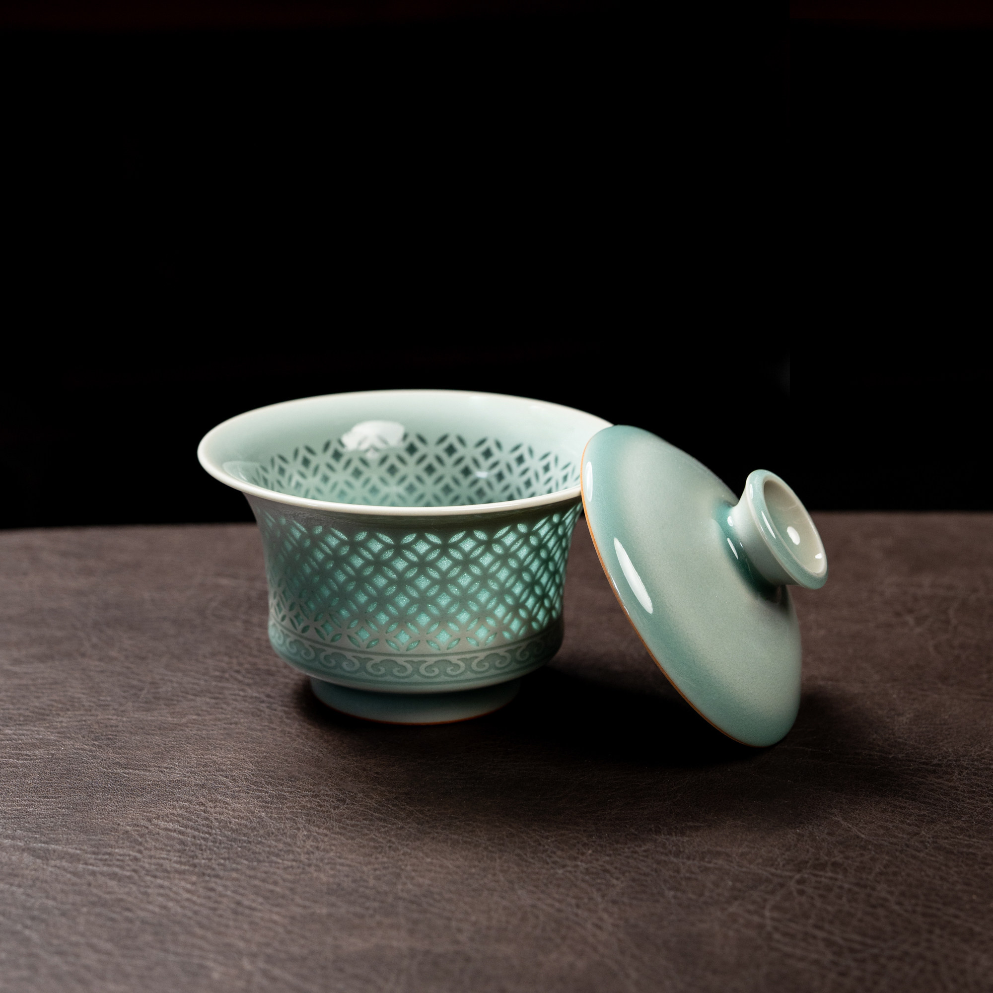 本土斋青瓷粉青玲珑手工马蹄两才盖碗高端功夫茶器镂空重工盖碗青瓷玲珑盖碗容天杯红豆系列青瓷盖碗