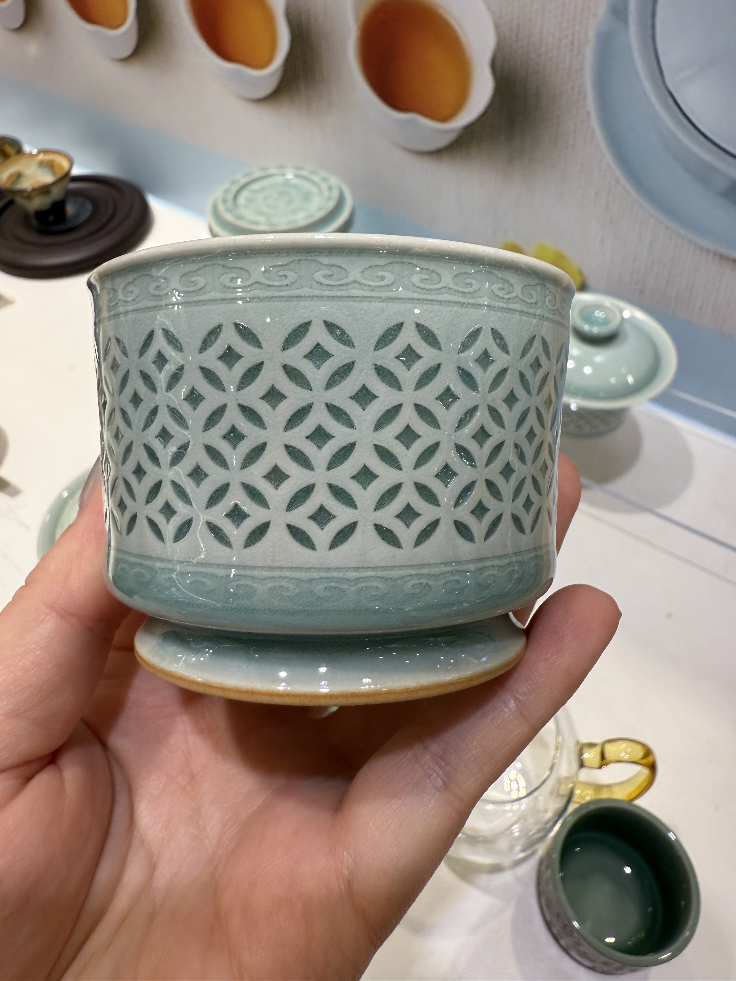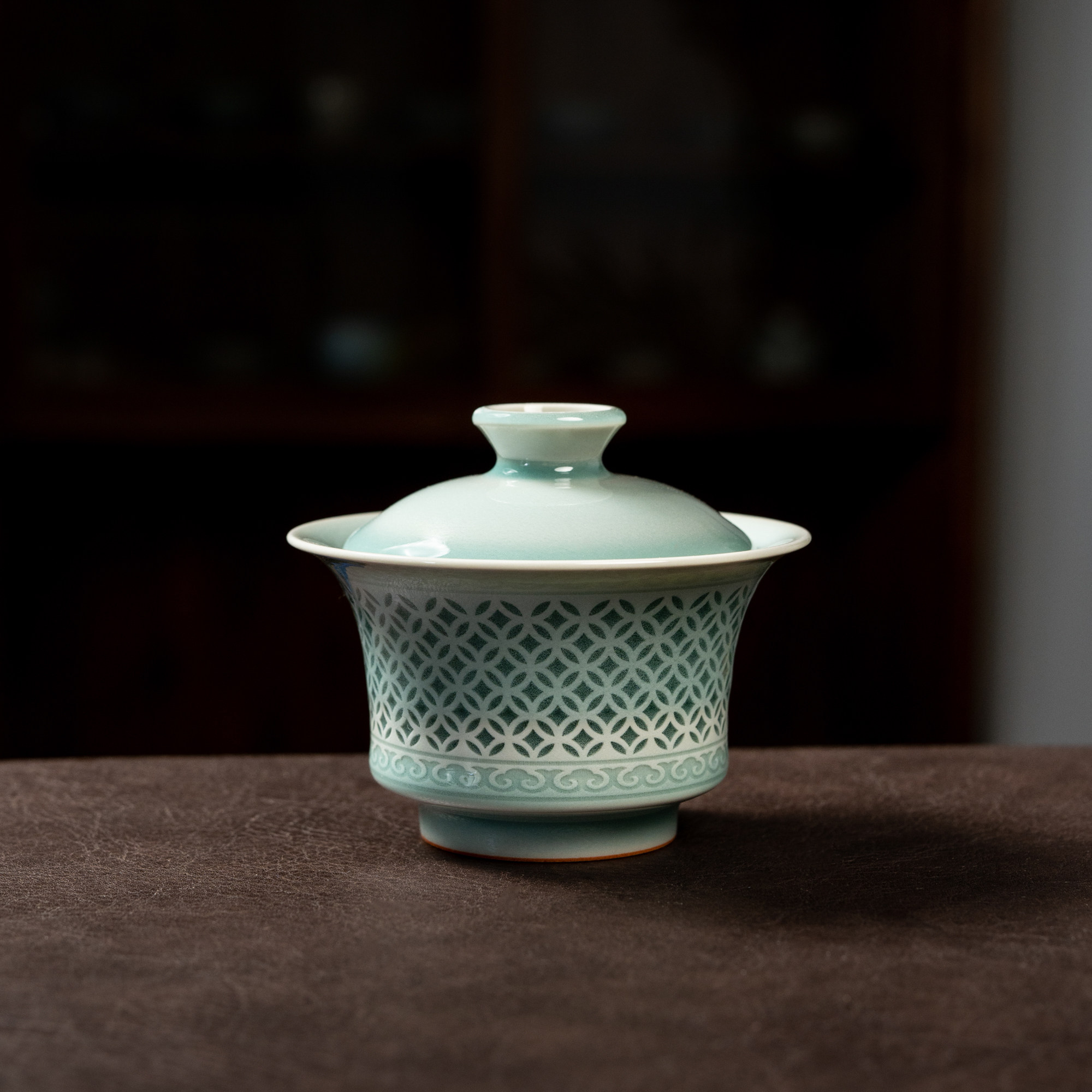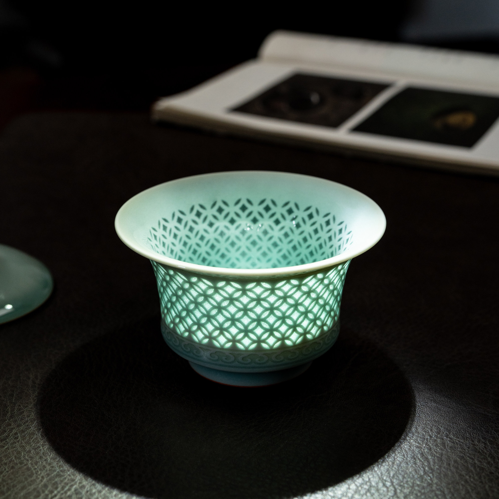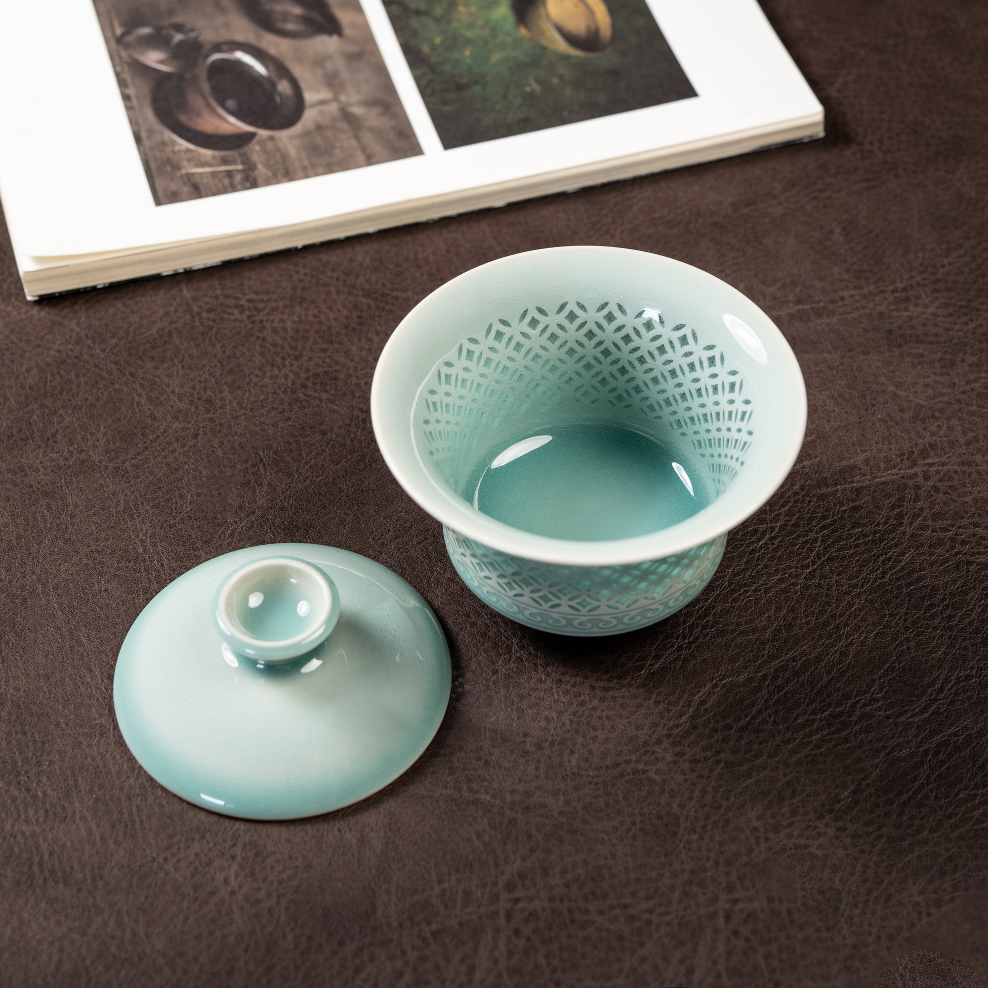 本土斋青瓷粉青玲珑手工马蹄两才盖碗高端功夫茶器镂空重工盖碗青瓷玲珑盖碗容天杯红豆系列青瓷盖碗