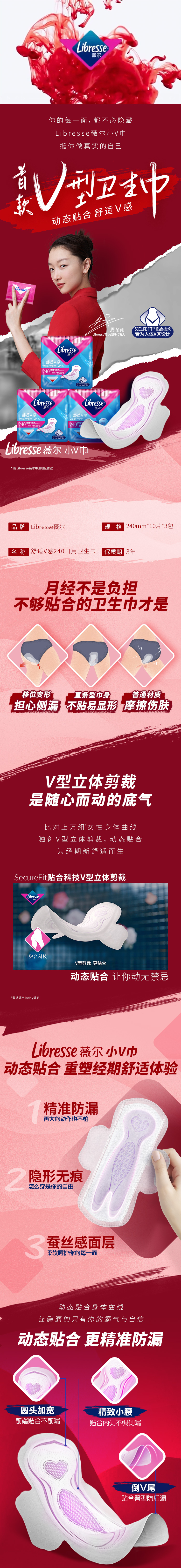 【赠2盒夜用】Libresse薇尔舒适V感240日用10片*3包 共30片 极薄棉柔卫生巾