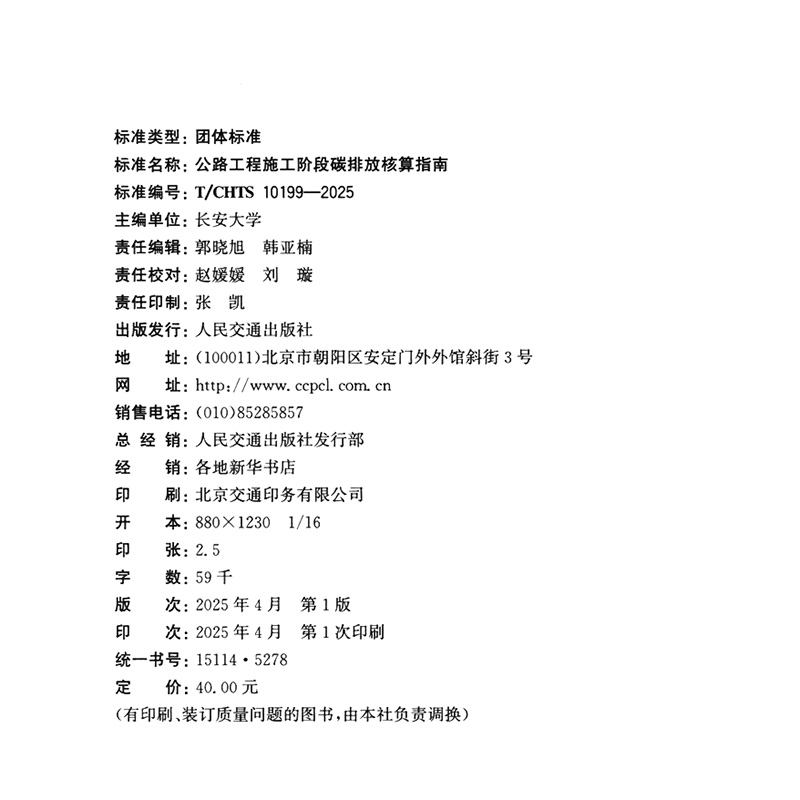 书名:公路工程施工阶段碳排放核算指南(T/CHTS 10199—2025)